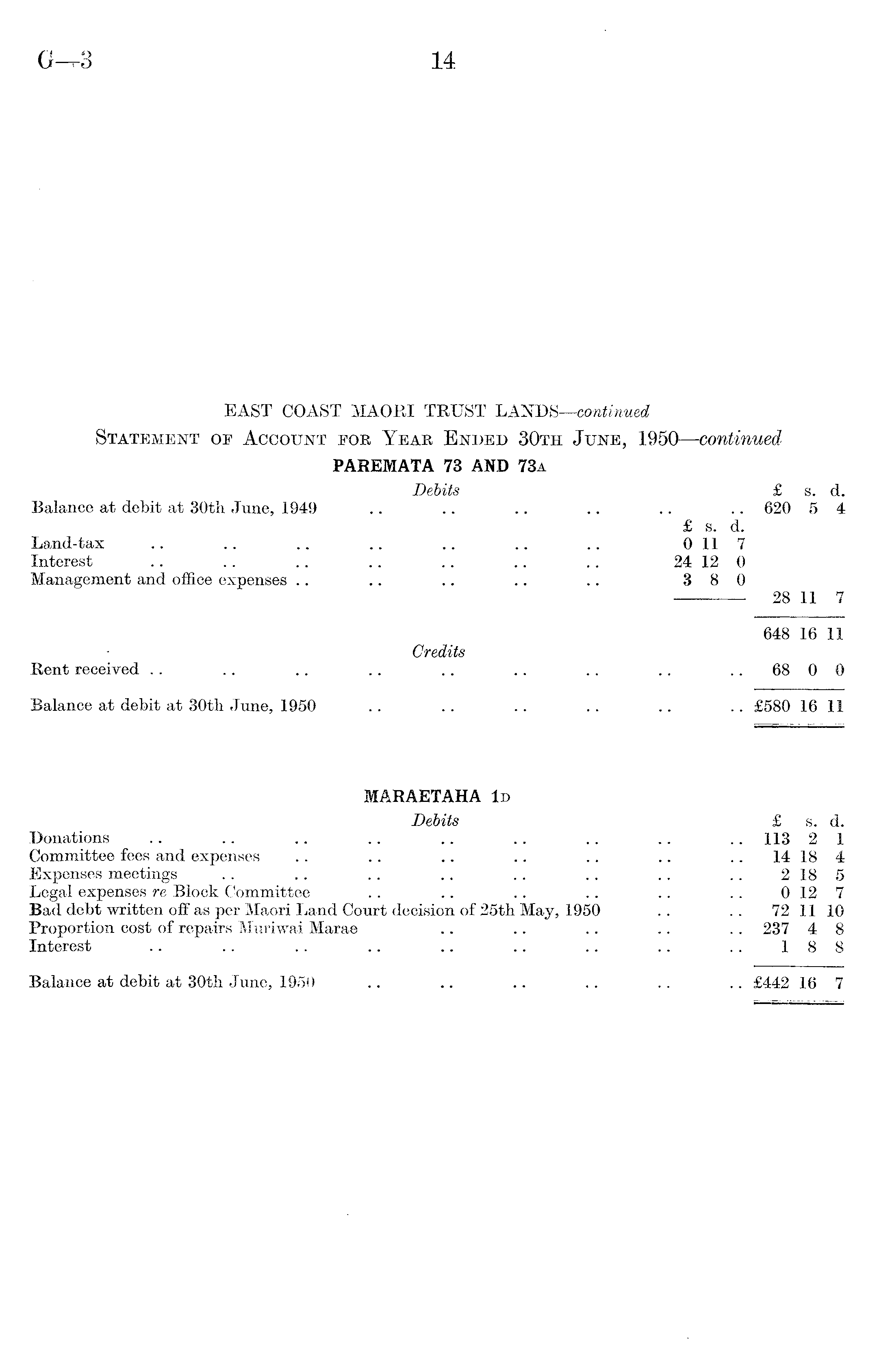 EAST COAST MAORI TRUST LANDS—continued Statement of Account for Year Ended 30th June, 1950—continued PAREMATA 73 AND 73A Debits £ s. d. Balance at debit at 30th June, 1949 .. .. .. .. .. .. 620 5 4 £ s. d. Land-tax .. .. .. .. .. .. .. 0 117 Interest • .. .. .. .. .. .. 24 12 0 Management and office expenses .. .. .. .. .. 880 2B II 7 648 16 11 Credits Rent received .. .. .. .. .. .. .. .. 68 0 0 Balance at debit at 30th June, 1950 .. .. .. .. .. .. £5BO 16 11 MARAETAHA Id Debits £ s. d. Donations .. .. .. .. .. .. .. .. .. 113 2 1 Committee fees and expenses .. .. .. .. .. .. 14 18 4 Expenses meetings .. .. .. .. .. .. .. .. 2 18 5 Legal expenses re Block Committee .. .. .. .. .. .. 0 12 7 Bad debt written off as per Maori Land Court decision of 25th May, 1950 .. .. 72 11 10 Proportion cost of repairs Muriwai Marae .. .. .. .. .. 237 4 8 Interest .. .. .. .. .. .. .. .. .. 188 Balance at debit at 30th June, 1950 .. .. .. .. .. .. £442 16 7