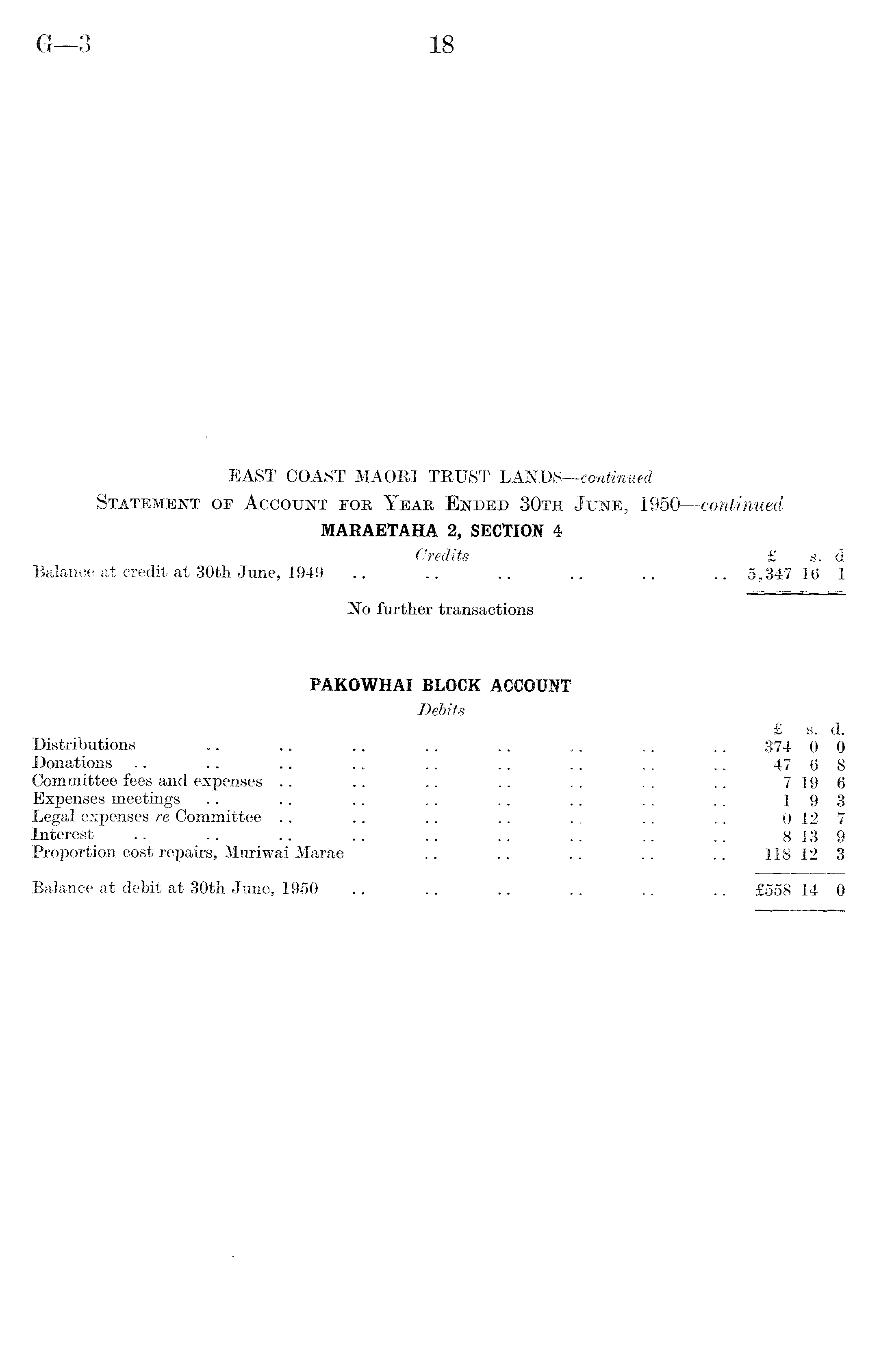 EAST COAST MAORI TRUST LANDS—continued Statement of Account foe Year Ended 30th June, 1950 —continued MARAETAHA 2, SECTION 4 Credits £ s. d Balance at credit at 30th June, 1949 .. .. .. .. .. .. 5,347 16 1 No further transactions PAKOWHAI BLOCK ACCOUNT Debits £ s. d. Distributions .. .. .. .. .. .. .. .. 374 0 0 Donations .. .. .. .. .. .. .. .. .. 47 6 8 Committee fees and expenses .. .. .. .. .. .. .. 7 19 6 Expenses meetings .. .. .. .. .. .. .. .. 193 Legal expenses re Committee .. .. .. .. .. .. .. 0 12 7 Interest .. .. .. .. .. .. .. .. .. 8 13 9 Proportion cost repairs, Muriwai Marae .. .. .. .. .. 118123 Balance at debit at 30th June, 1950 .. .. .. .. .. .. £558 14 0