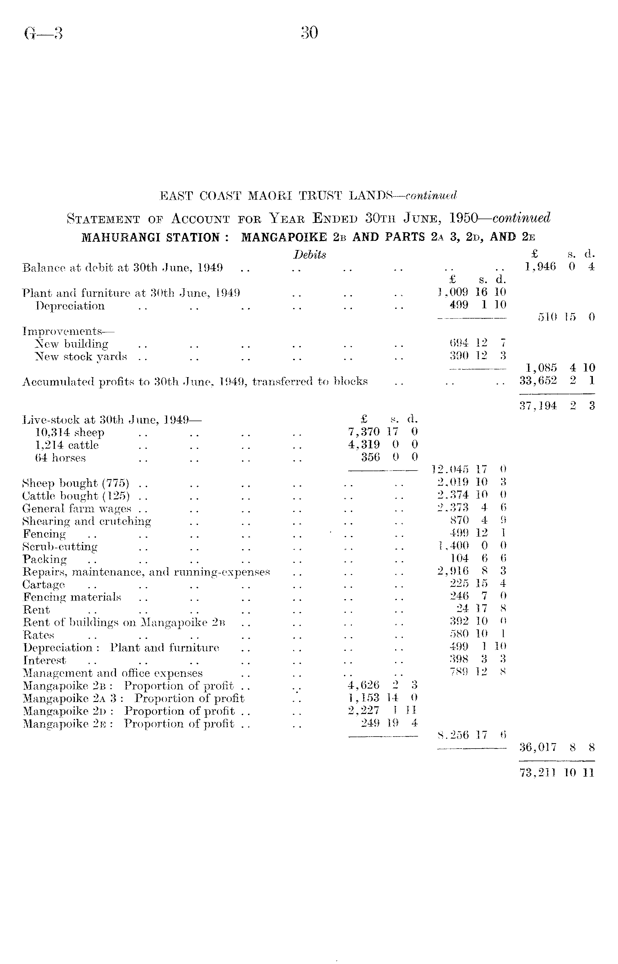 EAST COAST MAORI TRUST LANDS—continued Statement of Account for Year Ended 30th June, 1950 —continued MAHURANGI STATION : MANGAPOIKE 2b AND PARTS 2 A 3, 2D, AND 2B Debits £ s. d. Balance at debit at 30th June, 1949 .. .. .. .. .. .. 1,946 0 4 £ s. d. Plant and furniture at 30th June, 1949 .. .. .. 1,009 16 10 Depreciation .. .. .. .. .. .. 499 1 10 5lO 15 0 Improvements— New building .. .. .. .. .. .. 694 12 7 New stock yards .. .. .. .. .. .. 390 12 3 1,085 4 10 Accumulated profits to 30th June, 1949, transferred to blocks .. .. .. 33,652 2 1 37,194 2 3 Live-stock at 30th June, 1949 — £ s. d. 10,314 sheep .. .. .. .. 7,370 17 0 1,214 cattle .. .. .. .. 4,319 0 0 64 horses .. .. .. .. 356 0 0 12,045 17 0 Sheep bought(77s) .. .. .. .. .. .. 2,019 10 3 Cattle bought (125) .. .. .. .. .. .. 2,374 10 0 General farm wages .. .. .. .. .. .. 2,373 4 6 Shearing and crutching .. .. .. .. .. 870 4 9 Fencing .. .. .. .. .. • .. .. 499 12 1 Scrub-cutting .. .. .. .. .. .. 1,400 0 0 Packing .. .. .. .. .. .. .. 104 6 6 Repairs, maintenance, and running-expenses .. .. .. 2,916 8 3 Cartage .. .. .. .. .. . . .. 225 15 4 Fencing materials . . .. .. .. .. .. 246 7 0 Rent 24 17 8 Rent of buildings on Mangapoike 2b .. .. .. 392 10 0 Rates .. .. .. .. .. .. .. 580 10 1 Depreciation : Plant and furniture .. .. .. .. 499 110 Interest .. .. .. .. .. .. .. 398 3 3 Management and office expenses .. .. .. .. 789 12 8 Mangapoike 2b : Proportion of profit .. . . 4,626 2 3 Mangapoike 2a 3 : Proportion of profit .. 1,153 14 0 Mangapoike 2d : Proportion of profit .. .. 2,227 111 Mangapoike 2b : Proportion of profit .. .. 249 19 4 8,256 17 6 36,017 8 8 73,211 10 11