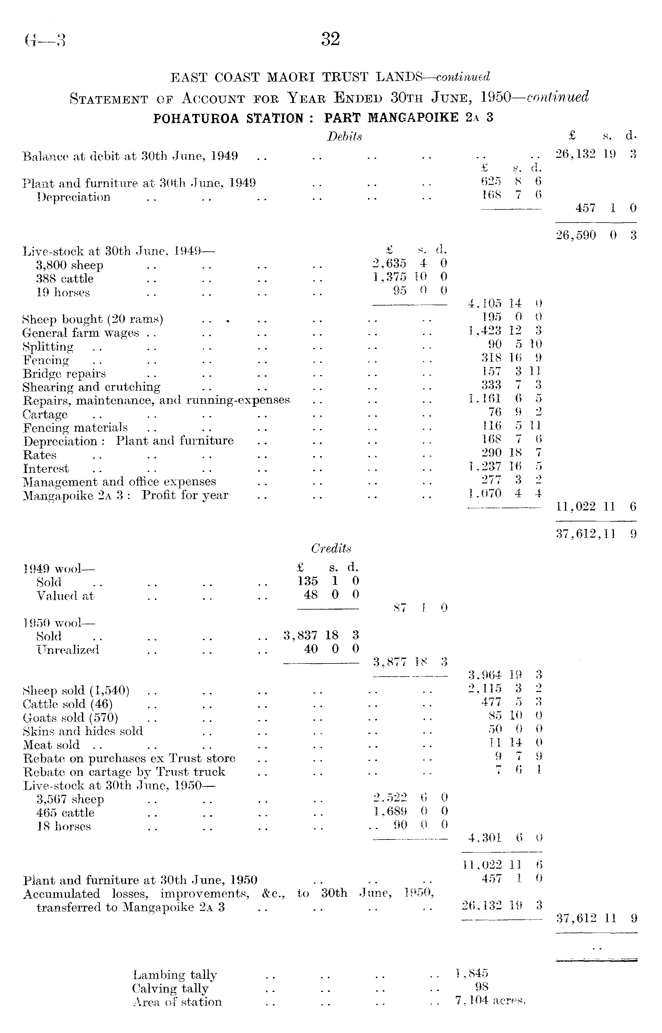 EAST COAST MAORI TRUST LANDS—continued Statement of Account for Year Ended 30th June, 1950 —continued POHATUROA STATION : PART MANGAPOIKE 2a 3 Debits £ s. dBalance at debit at 30th June, 1949 .. .. .. •• •• •• 26,132 19 3 £ s. d. Plant and furniture at 30th June, 1949 .. .. • • 625 8 6 Depreciation .. .. .. .. . • • • 168 7 6 457 1 0 26,590 0 3 Live-stock at 30th June, 1949 — £ s. d. 3,800 sheep .. .. .. .. 2,635 4 0 388 cattle .. .. .. .. 1,375 10 0 19 horses .. .. -. .. 95 0 0 4,105 14 0 Sheep bought (20 rams) .. .. ■ - 195 0 0 General farm wages .. .. .. .. .. •• 1,423 12 3 Splitting .. .. - - - - • • • • • • 90 510 Fencing 318 16 9 Bridge repairs .. .. .. .. .. 157 3 11 Shearing and crutching .. .. .. .. .. 333 7 3 Repairs, maintenance, and running-expenses .. .. .. 1,16165 Cartage .. .. .. .. • • • • • • 76 9 2 Fencing materials .. .. .. •- •• •• 116 511 Depreciation : Plant and furniture .. .. .. .. 168 7 6 Rates 290 18 7 Interest 1,237 16 5 Management and office expenses .. .. .. .. 277 3 2 Mangapoike 2a 3: Profit for year .. .. .. .. 1,070 4 4 11,022 11 6 37,612,11 9 Credits 1949 wool— £ s. d. Sold .. .. .. .. 135 1 0 Valued at .. .. .. 48 0 0 B7 1 0 1950 wool — Sold .. .. .. .. 3,837 18 3 Unrealized .. .. .. 40 0 0 3,877 18 3 3,964 19 3 Sheep sold (1,540) .. .. .. .. .. •• 2,115 3 2 Cattle sold (46) .. .. .. .. .. • • 477 5 3 Goats sold (570) .. .. .. .. .. - - 85 10 0 Skins and hides sold .. .. .. .. • • 50 0 0 Meat sold .. .. .. .. .. - - • • 1114 0 Rebate on purchases ex Trust store .. .. .. • • 9 7 9 Rebate on cartage by Trust truck .. .. . - - • 7 6 1 Live-stock at 30th June, 1950 3,567 sheep .. .. .. .. 2,522 6 0 465 cattle .. .. .. .. 1,689 0 0 18 horses .. .. .. .. 90 0 0 4,301 6 0 11,022 11 6 Plant and furniture at 30th June, 1950 .. .. • • 457 1 0 Accumulated losses, improvements, &c., to 30th June, 1950, transferred to Mangapoike 2a 3 .. .. .. .. 26,132 19 3 37,612 11 9 Lambing tally .. .. .. • ■ 1,845 Calving tally .. .. .. .. 98 Area of station .. .. .. .. 7,104 acres.