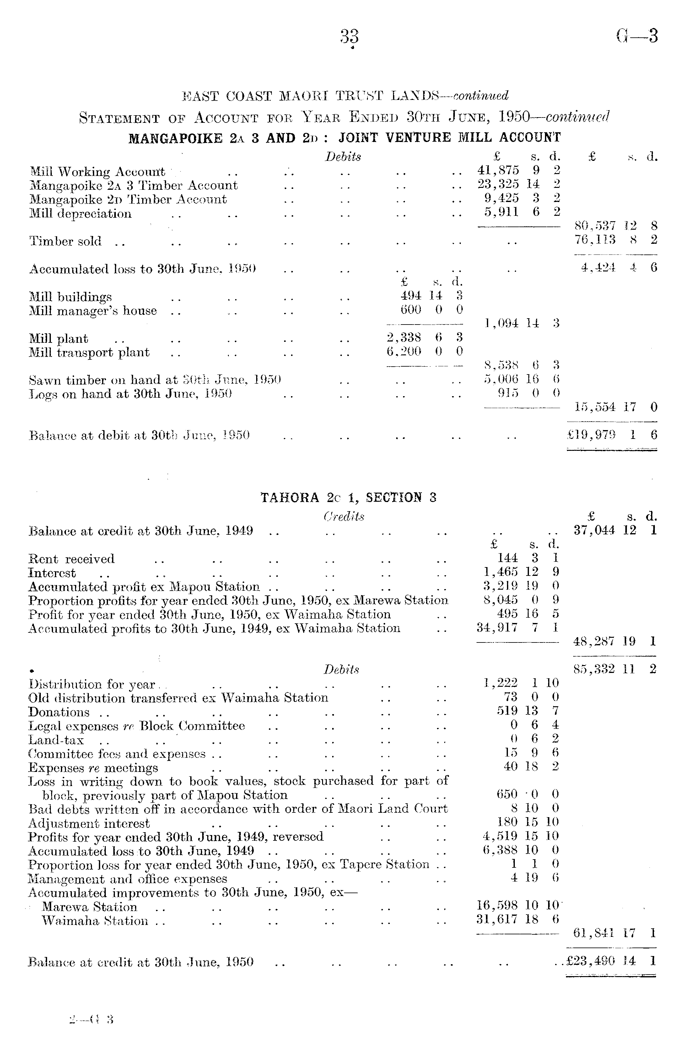 EAST COAST MAORI TRUST LANDS —continued Statement of Account for Year Ended 30th June, 1950—continued MANGAPOIKE 2a 3 AND 2D : JOINT VENTURE MILL ACCOUNT Debits £ s. d. £ s. d. Mill Working Account .. .. .. .. 41,875 9 2 Mangapoike 2a 3 Timber Account .. .. .. .. 23,325 14 2 Mangapoike 2d Timber Account .. .. .. 9,425 3 2 Mill depreciation .. .. .. -- -• 5,911 6 2 80,537 12 '8 Timber sold .. .. .. .. .. .. .. 76,113 8 2 Accumulated loss to 30th June, 1950 .. .. .. .. .. 4,424 4 6 £ s. d. MiU buildings .. .. . . .. 494 14 3 Mill manager's house .. .. .. .. 600 0 0 1,094 14 3 Mill plant .. .. .. .. 2,338 6 3 Mill transport plant .. .. .. .. 6,200 0 0 8,538 6 3 Sawn timber on hand at 30th June, 1950 .. .. .. 5,006 16 6 Logs on hand at 30th June, 1950 .. .. .. .. 915 0 0 15,554 17 0 Balance at debit at 30th June, 1950 .. .. .. .. .. £19,979 1 6 TAHORA 2c 1, SECTION 3 Credits £ s: d. Balance at credit at 30th June, 1949 .. .. .. .. .. .. 37,044 12 1 £ s. d. Rent received .. .. .. .. .. .. 144 3 1 Interest .. .. .. .. .. .. .. 1,465 12 9 Accumulated profit ex Mapou Station .. .. .. .. 3,219190 Proportion profits for year ended 30th June, 1950, ex Marewa Station 8,045 0 9 Profit for year ended 30th June, 1950, ex Waimaha Station .. 495 16 5 Accumulated profits to 30th June, 1949, ex Waimaha Station .. 34,917 7 1 48,287 19 1 Debits 85,332 11 2 Distribution for year... .. .. .. .. .. 1,222 1 10 Old distribution transferred ex Waimaha Station .. .. 73 0 0 Donations .. .. .. .. .. .. .. 519 13 7 Legal expenses re Block Committee .. .. .. .. 0 6 4 Land-tax .. .. .. .. .. .. •• 062 Committee fees and expenses .. .. .. .. .. 15 9 6 Expenses re meetings .. .. .. .. .. 40 18 2 Loss in writing down to book values, stock purchased for part of block, previously part of Mapou Station .. .. .. 650 • 0 0 Bad debts written off in accordance with order of Maori Land Court 8 10 0 Adjustment interest .. .. .. .. . . 180 15 10 Profits for year ended 30th June, 1949, reversed .. .. 4,519 15 10 Accumulated lossito 30th June, 1949 .. .. .. 6,388 10 0 Proportion loss for year ended 30th June, 1950, ex Tapere Station .. 110 Management and office expenses .. .. .. .. 4196 Accumulated improvements to 30th June, 1950, ex—- : Marewa Station .. .. .. .. .. .. 16,598 10 10 Waimaha Station .. .. .. .. .. 31,617 18 6 61,841 17 1 Balance at credit at 30th June, 1950 .. .. .. .. .. ..£23,490 14 1