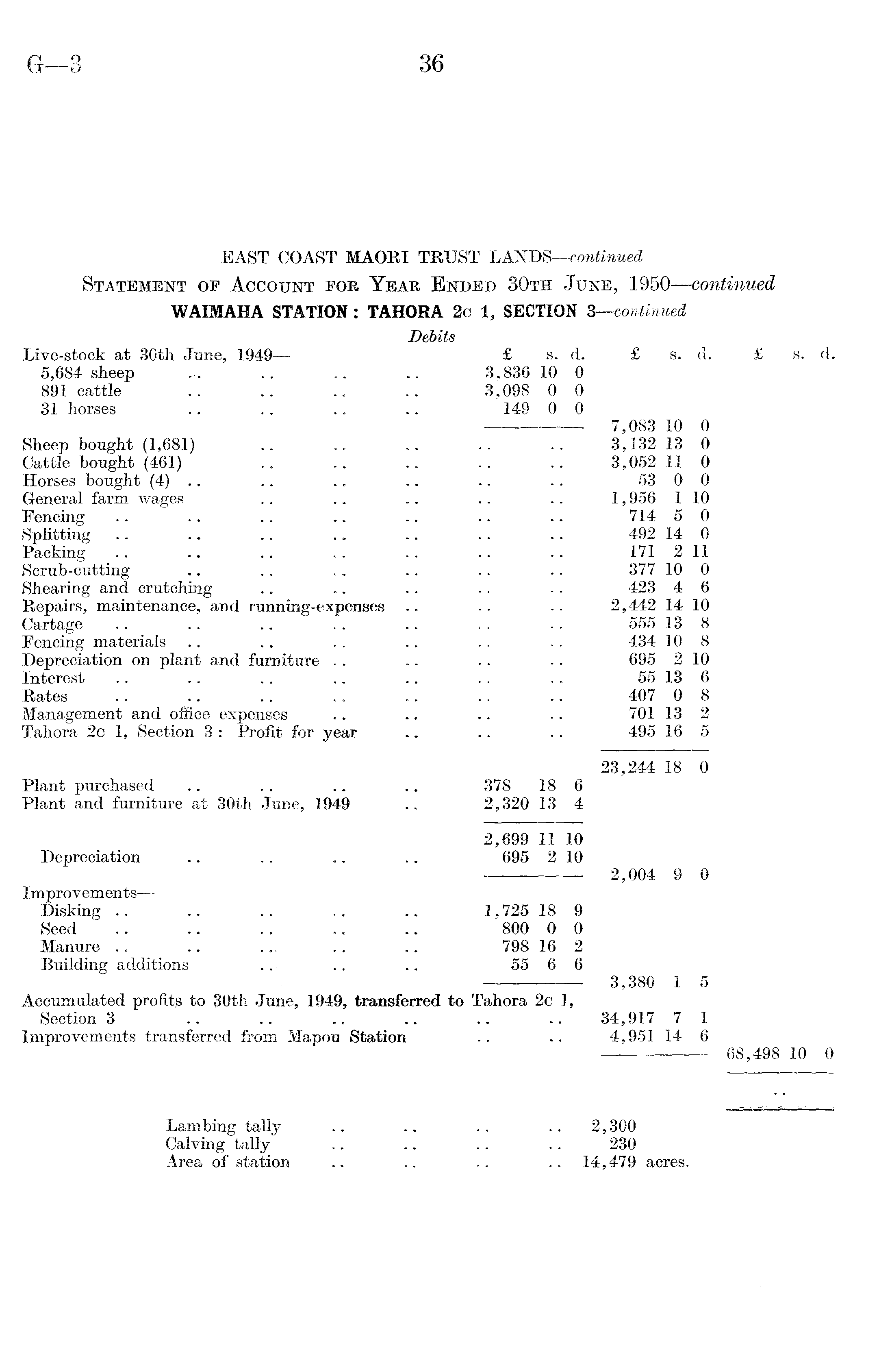 EAST COAST MAORI TRUST LANDS —continued Statement of Account for Year Ended 30th June, 1950 —continued WAIMAHA STATION : TAHORA 2c 1, SECTION Z—continued Debits Live-stock at 30th June, 1949 £ s. d. £ s. d. £ s. d. 5,684 sheep ... .. .. .. 3,836 10 0 891 cattle .. .. .. .. 3,098 0 0 31 horses .. .. .. .. 149 0 0 7,083 10 0 Sheep bought (1,681) .. .. .. .. .. 3,132 13 0 Cattle bought (461) .. .. .. .. .. 3,052 11 0 Horses bought (4) .. .. .. .. .. .. 53 0 0 General farm wages .. .. .. .. .. 1,956 1 10 Fencing .. .. .. .. .. .. .. 714 5 0 Splitting .. .. .. .. .. .. .. 492 14 0 Packing .. .. .. .. .. .. .. 171 211 Scrub-cutting .. .. .. .. .. .. 377 10 0 Shearing and crutching .. .. .. .. .. 423 4 6 Repairs, maintenance, and running-expenses .. .. .. 2,442 14 10 Cartage .. .. .. .. .. .. .. 555 13 8 Fencing materials .. .. .. .. .. .. 434 10 8 Depreciation on plant and furniture .. .. .. .. 695 2 10 Interest .. .. .. .. .. .. .. 55 13 6 Rates .. .. .. .. .. .. .. 407 0 8 Management and office expenses .. .. .. .. 701 13 2 Tahora 2c 1, Section 3 : Profit for year .. .. .. 495 16 5 23,244 18 0 Plant purchased .. .. .. .. 378 18 6 Plant and furniture at 30th June, 1949 .. 2,320 13 4 2,699 11 10 Depreciation .. .. .. .. 695 2 10 2,004 9 0 Improvements — Disking .. .. .. .. .. 1,725 18 9 Seed .. .. .. .. .. 800 0 0 Manure .. .. .... .. .. 798 16 2 Building additions .. .. .. 55 6 6 3,380 1 5 Accumulated profits to 30th June, 1949, transferred to Tahora 2c 1, Section 3 .. .. .. .. .. .. 34,917 7 1 Improvements transferred from Mapou Station .. .. 4,951 14 6 68,498 10 0 Lambing tally .. .. .. .. 2,300 Calving tally .. .. .. .. 230 Area of station .. .. .. .. 14,479 acres.