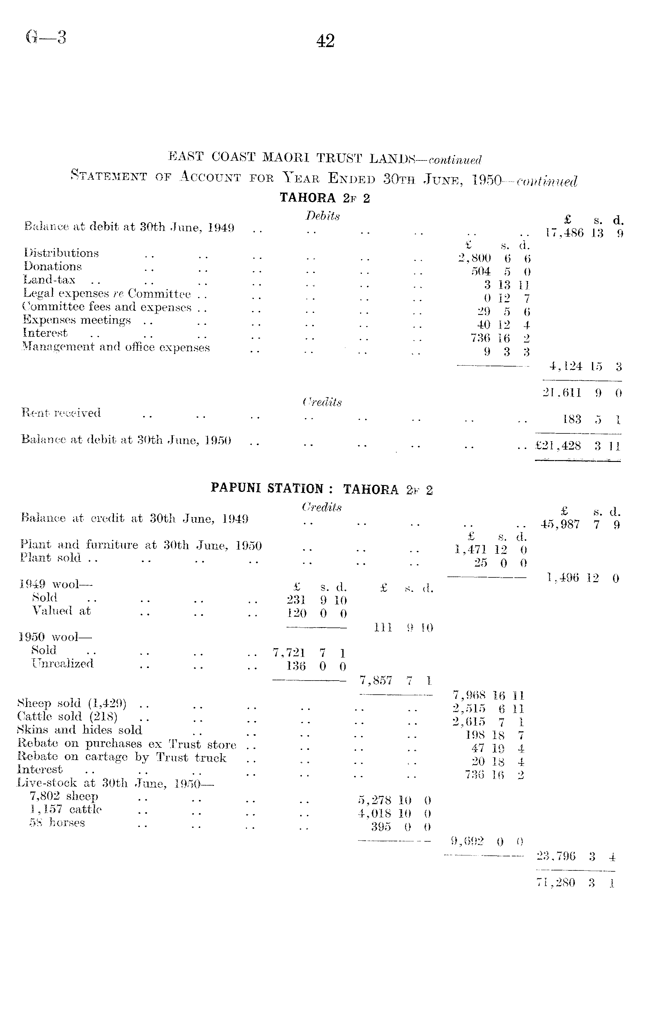 EAST COAST MAORI TRUST LANDS—continued Statement of Account for Year Ended 30th June, 1950—continued TAHORA 2f 2 Debits £ s Balance at debit at 30th June, 1949 .. .. .. jg g Distributions .. .. S « Donations .. .. i.' i.' " "554 5 0 Land-tftx .. .. .. . # j Legal expenses re Committee .. .. .. .. 0 12 7 Committee fees and expenses . . .. .. .. * 29 5 6 Expenses meetings .. .. .. .. _ ' * 40 12 4 Interest .. .. .. .. .. 11 ] ] 736 16 2 Management and office expenses .. .. ■ 933 4,124 15 3 „ 7 21,611 9 0 Credits Rent received ...... r , lod o 1 Balance at debit at 30th June, 1950 .. .. .. £2l 428 3 n PAPUNI STATION : TAHORA 2f 2 Credits £ „ j Balance at credit at 30th June, 1949 .. .. .. 7' g' £ Plant and furniture at 30th June, 1950 .. .. 1 471 j£ 0 Plant sold .. .. .. .. .. , _ ' 25 0 0 lf w n i 1,496 12 0 1949 wool— £ s. d. £ s. d. Sold .. .. .. .. 231 9 10 Valued at .. .. .. 120 0 0 lll 9 10 1950 wool — Sold .. .. .. .. 7,721 7 1 Unrealized .. .. .. 136 0 0 7,857 7 1 c , „ ~ 7,968 16 11 Sheep sold (1,429) .. .. .. .. .. .. 2 515 6 11 Cattle sold (218) .. .. .. 2 615 7 1 Skins and hides sold .. .. .. 'jgg jg 7 Rebate on purchases ex Trust store .. .. .. ' ] 47 19 4 Rebate on cartage by Trust truck .. .. [. [ * 20 18 4 Interest .. .. .. .. jg 2 Live-stock at 30th June, 1950 7,802 sheep .. .. .. 5,278 10 0 1,157 cattle .. .. .. .. 4,018 10 0 58 horses 395 0 0 9,692 0 0 23,796 3 4 71,280 3 1