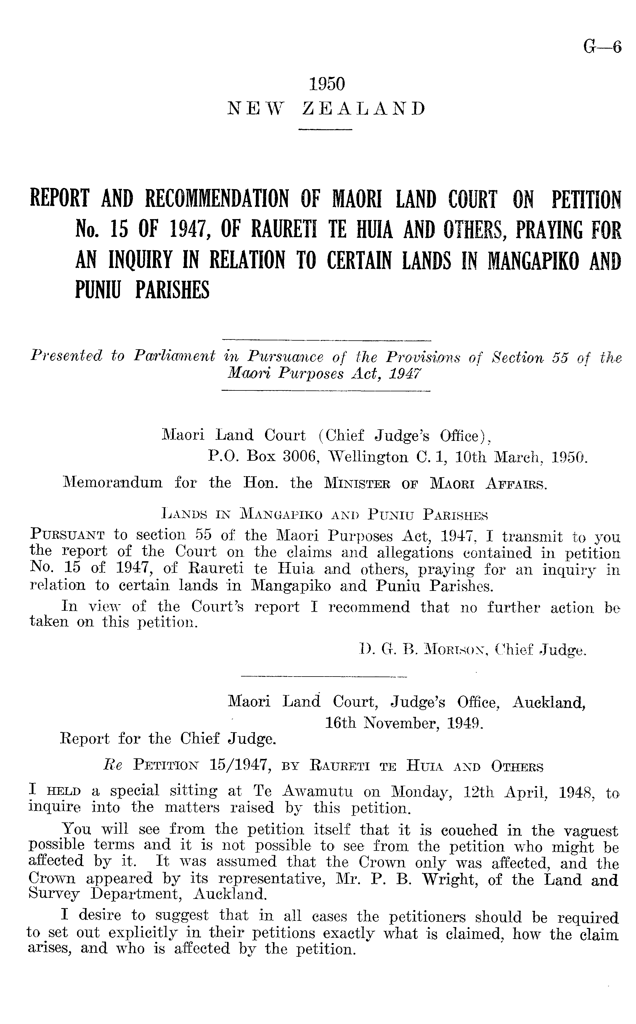 REPORT AND RECOMMENDATION OF MAORI LAND COURT ON PETITION No. 15 OF 1947, OF RADRETI TE HUIA AND OTHERS, PRAYING FOR AN INQUIRY IN RELATION TO CERTAIN LANDS IN MANGAPIKO AND PUNIU PARISHES