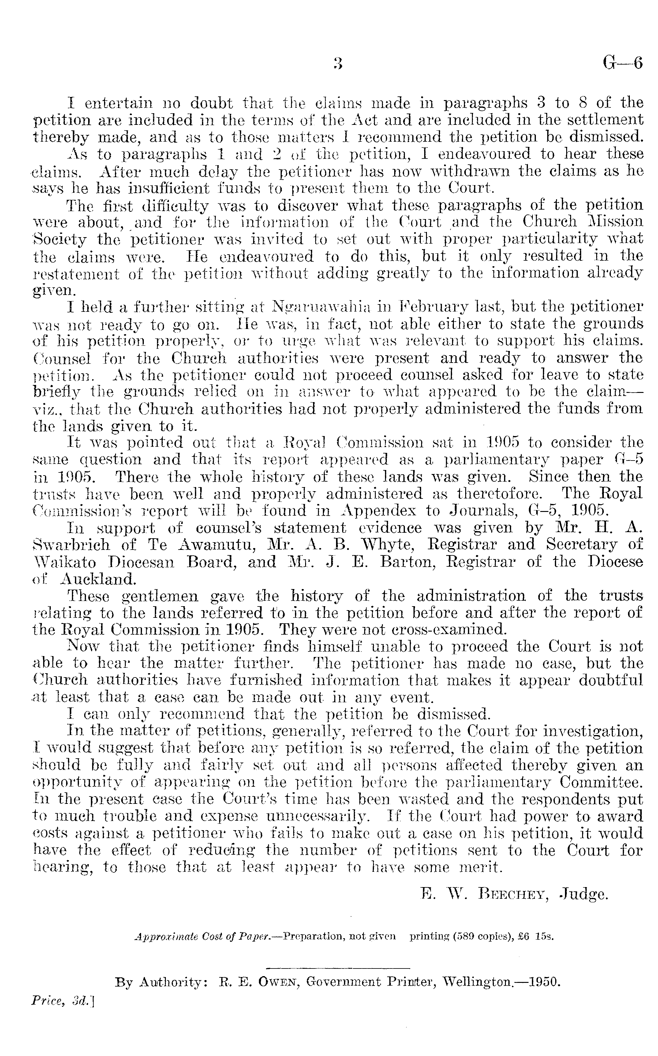 I entertain no doubt that the claims made in paragraphs 3 to 8 of the petition are included in the terms of the Act and are included in the settlement thereby made, and as to those matters I recommend the petition be dismissed. As to paragraphs 1 and 2 of the petition, I endeavoured to hear these claims. After much delay the petitioner has now withdrawn the claims as he says he has insufficient funds to present them to the Court. The first difficulty was to discover what these paragraphs of the petition were about, t and for the information of the Court and the Church Mission Society the petitioner was invited to set out with proper particularity what the claims were. He endeavoured to do this, but it only resulted in the restatement of the petition without adding greatly to the information already given. I held a further sitting at Ngaruawahia in February last, but the petitioner was not ready to go on. He was, in fact, not able either to state the grounds of his petition properly, or to urge what was relevant to support his claims. Counsel for the Church authorities were present and ready to answer' the petition. As the petitioner could not proceed counsel asked for leave to state briefly the grounds relied on in answer to what appeared to be the claim—viz., that the Church authorities had not properly administered the funds from the lands given to it. It was pointed out that a Royal Commission sat in 1905 to consider the same question and that its report appeared as a parliamentary paper G-5 in 1905. There the whole history of these lands was given. Since then the trusts have been well and properly administered as theretofore. The Royal Commission's report will be found in Appendex to Journals, G-5, 1905. In support of counsel's statement evidence was given by Mr. H. A. Swarbrich of Te Awamutu, Mr. A. B. Whyte, Registrar and Secretary of Waikato Diocesan Board, and Mr. J. E. Barton, Registrar of the Diocese of Auckland. These gentlemen gave the history of the administration of the trusts relating to the lands referred t!o in the petition before and after the report of the Royal Commission in 1905. They were not cross-examined. Now that the petitioner finds himself unable to proceed the Court is not able to hear the matter further. The petitioner has made no case, but the Church authorities have furnished information that makes it appear doubtful at least that a case can be made out in any event. I can only recommend that the petition be dismissed. In the matter of petitions, generally, referred to the Court for investigation, I would suggest that before any petition is so referred, the claim of the petition should be fully and fairly set out and all persons affected thereby given an opportunity of appearing on the petition before the parliamentary Committee. In the present case the Court's time has been wasted and the respondents put to much trouble and expense unnecessarily. If the Court had power to award costs against a petitioner who fails to make out a case on his petition, it would have the effect of reducing the number of petitions sent to the Court for hearing, to those that at least appear to have some merit. E. W. Beechey, Judge. Approximate Cost of Paper.—Preparation, not given printing (589 copies), £6 15s.