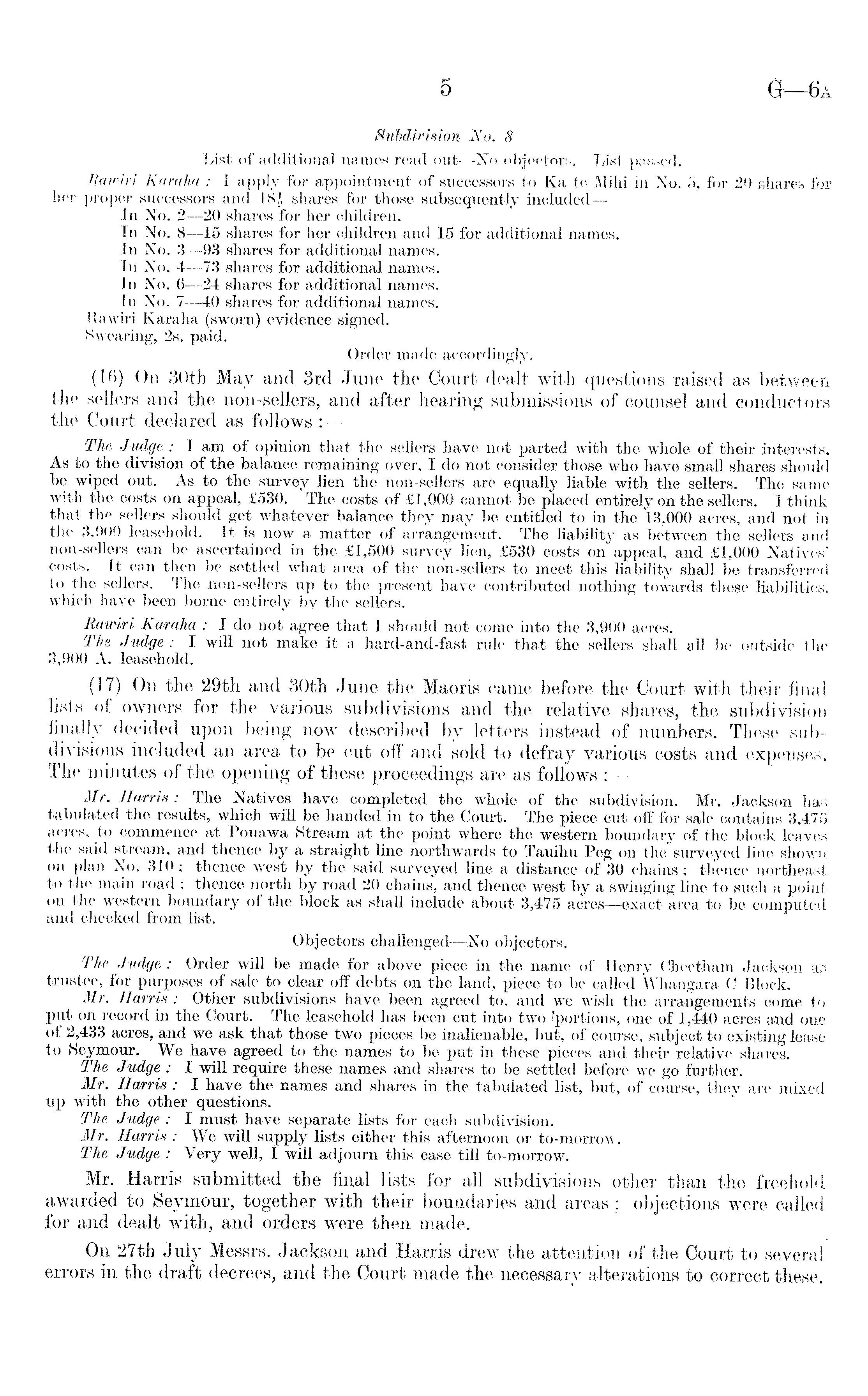 Subdivision No. 8 List of additional names read out —No objectors. List passed. Rawiri Karaha : I apply for appointment of successors to Kate Mihi in No. 5, for 20 shares for her proper successors and 18 J- shares for those subsequently included— In No. 2—20 shares for her children. In No. B—ls shares for her children and 15 for additional names. In No. 3 —93 shares for additional names. In No. 4—73 shares for additional names. In No. 6—24 shares for additional names, in No. 7—40 shares for additional names. Rawiri Karaha (sworn) evidence signed. iS wearing, 2s. paid. Order made accordingly. (16) On 30th May and 3rd June the Court dealt with questions raised as between the sellers and the non-sellers, and after hearing submissions of counsel and conductors the Court declared as follows : The Judge : I am of opinion that the sellers have not parted with the whole of their interests. As to the division of the balance remaining over, I do not consider those who have small shares should be wiped out. As to the survey lien the non-sellers are equally liable with the sellers. The same with the costs on appeal, £530. The costs of £l,OOO cannot be placed entirely on the sellers. I think that the sellers should get whatever balance they may be entitled to in the 13,000 acres, and not in the 3,900 leasehold. It is now a matter of arrangement. The liability as between the sellers and non-sellers can be ascertained in the £1,500 survey lien, £530 costs on appeal, and £l,OOO Natives' costs, ft can then be settled what area of the non-sellers to meet this liability shall be transferred to the sellers. The non-sellers up to the present have contributed nothing towards these liabilities, which have been borne entirely by the sellers. Rawiri Karaha : I do not agree that I should not come into the 3,900 acres. The, Judge : I will not make it a hard-and-fast rule that the sellers shall all be outside the 3,900 A. leasehold. (17) On the 29th and 30th June the Maoris came before the Court with their final lists of owners for the various subdivisions and the relative shares, the subdivision finally decided upon being now described by letters instead of numbers. These subdivisions included an area to be cut off and sold to defray various costs and expenses. The minutes of the opening of these proceedings are as follows : Mr. Harris: The Natives have completed the whole of the subdivision. Mr. Jackson has tabulated the results, which will be handed in to the Court. The piece cut off for sale contains 3,475 acres, to commence at Pouawa Stream at the point where the western boundary of the block leaves the said stream, and thence by a straight line northwards to Tauihu Peg on the surveyed line shown on plan No. 310 ; thence west by the said surveyed line a distance of 30 chains; thence northeast to the main road : thence north by road 20 chains, and thence west by a swinging line to such a point on the western boundary of the block as shall include about 3,475 acres—exact area to be computed and checked from list. Objectors challenged—No objectors. The Judge : Order will be made for above piece in the name of Henry Cheetham Jackson as trustee, for purposes of sale to clear off debts on the land, piece to be called Whangara 0 Block. Mr. Harris : Other subdivisions have been agreed to, and we wish the arrangements come to put on record in the Court. The leasehold has been cut into two [portions, one of 1,440 acres and one of 2,433 acres, and we ask that those two pieces be inalienable, but, of course, subject to existing lease to Seymour. We have agreed to the names to be put in these pieces and their relative shares. The Judge : I will require these names and shares to be settled before we go further. Mr. Harris : I have the names and shares in the tabulated list, but, of course, they are mixed up with the other questions. The Judge : I must have separate lists for each subdivision. Mr. Harris : We will supply lists either this afternoon or to-morrow. The Judge : Very well, I will adjourn this case till to-morrow. Mr. Harris submitted the final lists for all subdivisions other than the freehold awarded to Seymour, together with their boundaries and areas ; objections were called for and dealt with, and orders were then made. On 27t.h July Messrs. Jackson and Harris drew the attention of the Court to several errors in the draft decrees, and the Court made the necessary alterations to correct these