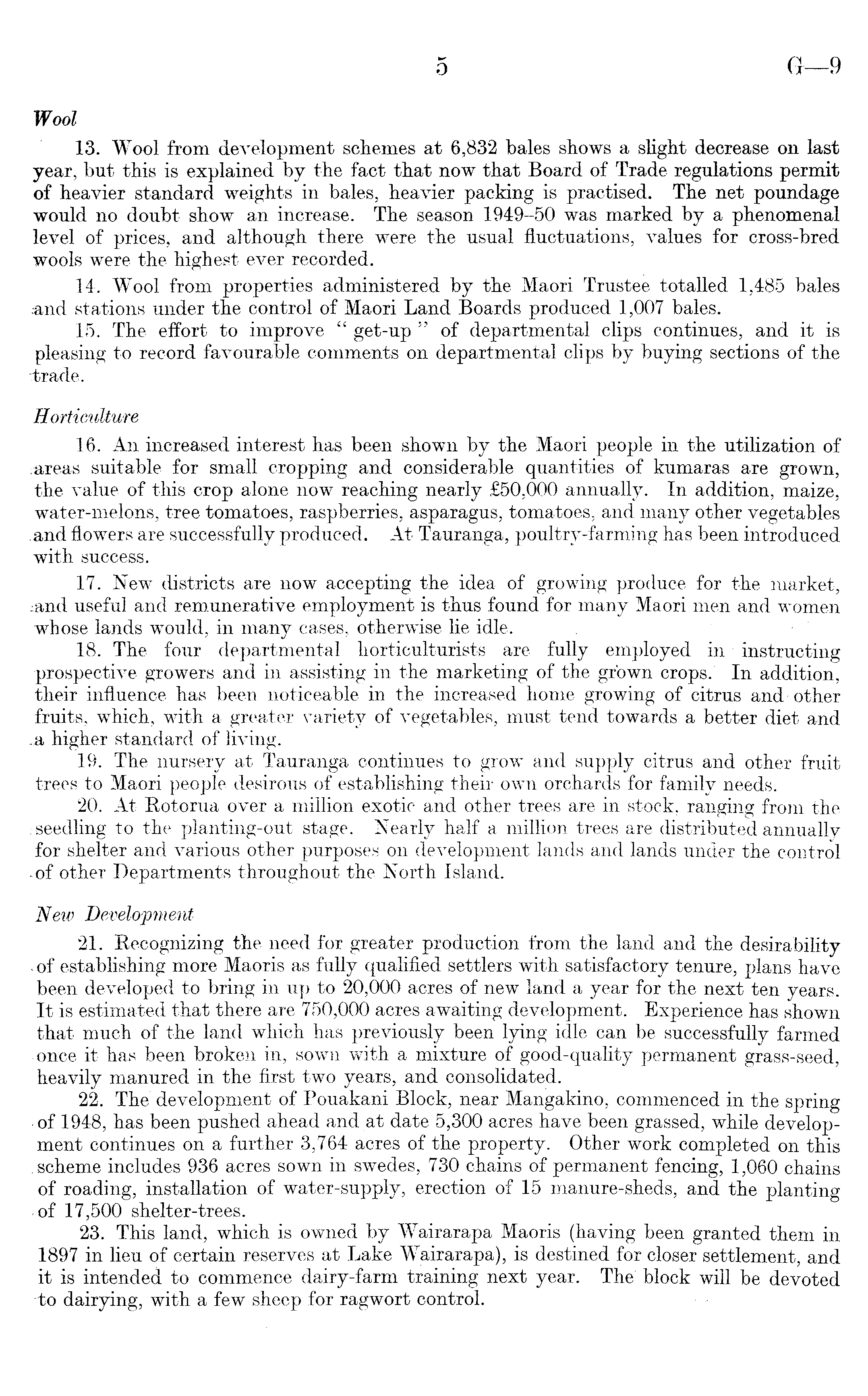 Wool 13. Wool from development schemes at 6,832 bales shows a slight decrease on last year, but this is explained by the fact that now that Board of Trade regulations permit of heavier standard weights in bales, heavier packing is practised. The net poundage would no doubt show an increase. The season 1949-50 was marked by a phenomenal level of prices, and although there were the usual fluctuations, values for cross-bred wools were the highest ever recorded. 14. Wool from properties administered by the Maori Trustee totalled 1,485 bales and stations under the control of Maori Land Boards produced 1,007 bales. 15. The effort to improve " get-up " of departmental clips continues, and it is pleasing to record favourable comments on departmental clips by buying sections of the .trade. .Horticulture 16. An increased interest has been shown by the Maori people in the utilization of areas suitable for small cropping and considerable quantities of kumaras are grown, the value of this crop alone now reaching nearly £50,000 annually. In addition, maize, water-melons, tree tomatoes, raspberries, asparagus, tomatoes, and many other vegetables and flowers are successfully produced. At Tauranga, poultry-farming has been introduced with success. 17. New districts are now accepting the idea of growing produce for the market, ..and useful and remunerative employment is thus found for many Maori men and women whose lands would, in many cases, otherwise he idle. 18. The four departmental horticulturists are fully employed in ' instructing prospective growers and in assisting in the marketing of the grown crops. In addition, their influence has been noticeable in the increased home growing of citrus and'other fruits, which, with a greater variety of vegetables, must tend towards a better diet and _a higher standard of living. 19. The nursery at Tauranga continues to grow and supply citrus and other fruit trees to Maori people desirous of establishing their own orchards for family needs. 20. At Rotorua over a million exotic and other trees are in stock, ranging from the iseedling to the planting-out stage. Nearly half a million trees are distributed annually for shelter and various other purposes on development lands and lands under the control .of other Departments throughout the North Island. _New Development 21. Recognizing the need for greater production from the land and the desirability - of establishing more Maoris as fully qualified settlers with satisfactory tenure, plans have been developed to bring in up to 20,000 acres of new land a year for the next ten years. It is estimated that there are 750,000 acres awaiting development. Experience has shown that much of the land which has previously been lying idle can be successfully farmed • once it has been broken in, sown with a mixture of good-quality permanent grass-seed, heavily manured in the first two years, and consolidated. 22. The development of Pouakani Block, near Mangakino, commenced in the spring ■ of 1948, has been pushed ahead and at date 5,300 acres have been grassed, while development continues on a further 3,764 acres of the property. Other work completed on this . scheme includes 936 acres sown in swedes, 730 chains of permanent fencing, 1,060 chains of roading, installation of water-supply, erection of 15 manure-sheds, and the planting of 17,500 shelter-trees. 23. This land, which is owned by Wairarapa Maoris (having been granted them in 1897 in lieu of certain reserves at Lake Wairarapa), is destined for closer settlement, and it is intended to commence dairy-farm training next year. The' block will be devoted -to dairying, with a few sheep for ragwort control.