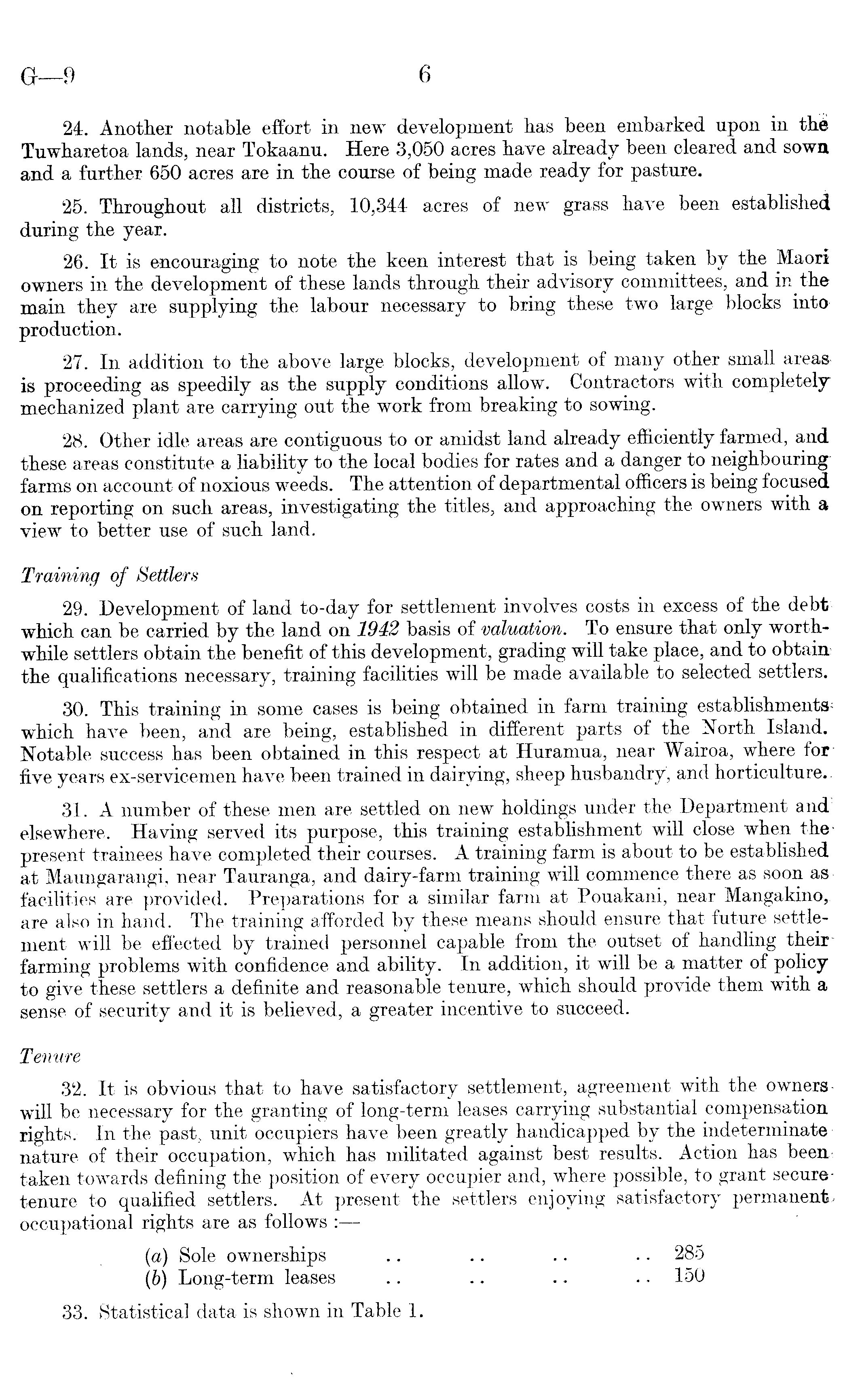 24. Another notable effort in new development has been embarked upon in thei Tuwharetoa lands, near Tokaanu. Here 3,050 acres have already been cleared and sown and a further 650 acres are in the course of being made ready for pasture. 25. Throughout all districts, 10,344 acres of new grass have been established during the year. 26. It is encouraging to note the keen interest that is being taken by the Maori owners in the development of these lands through their advisory committees, and in the main they are supplying the labour necessary to bring these two large blocks into production. 27. In addition to the above large blocks, development of many other small areas is proceeding as speedily as the supply conditions allow. Contractors with completely mechanized plant are carrying out the work from breaking to sowing. 28. Other idle areas are contiguous to or amidst land already efficiently farmed, and these areas constitute a liability to the local bodies for rates and a danger to neighbouring farms on account of noxious weeds. The attention of departmental officers is being focused on reporting on such areas, investigating the titles, and approaching the owners with a view to better use of such land. Training of Settlers 29. Development of land to-day for settlement involves costs in excess of the debt which can be carried by the land on 1942 basis of valuation. To ensure that only worthwhile settlers obtain the benefit of this development, grading will take place, and to obtain.! the qualifications necessary, training facilities will be made available to selected settlers. 30. This training in some cases is being obtained in farm training establishmentswhich have been, and are being, established in different parts of the North Island. Notable success has been obtained in this respect at Huramua, near Wairoa, where forfive years ex-servicemen have been trained in dairying, sheep husbandry, and horticulture.. 31. A number of these men are settled on new holdings under the Department and elsewhere. Having served its purpose, this training establishment will close when thepresent trainees have completed their courses. A training farm is about to be established at Maungarangi, near Tauranga, and dairy-farm training will commence there as soon as facilities are provided. Preparations for a similar farm at Pouakani, near Mangakino,. are also in hand. The training afforded by these means should ensure that future settlement will be effected by trained personnel capable from the outset of handling theirfarming problems with confidence and ability. In addition, it will be a matter of policy to give these settlers a definite and reasonable tenure, which should provide them with a sense of security and it is believed, a greater incentive to succeed. Tenure 32. It is obvious that to have satisfactory settlement, agreement with the ownerswill be necessary for the granting of long-term leases carrying substantial compensation rights. In the past, unit occupiers have been greatly handicapped by the indeterminate nature of their occupation, which has militated against best results. Action has been: taken towards defining the position of every occupier and, where possible, to grant securetenure to qualified settlers. At present the settlers enjoying satisfactory permanent, occupational rights are as follows : (a) Sole ownerships .. .. .. .. 285 (b) Long-term leases .. .. .. .. 150 33. Statistical data is shown in Table 1.