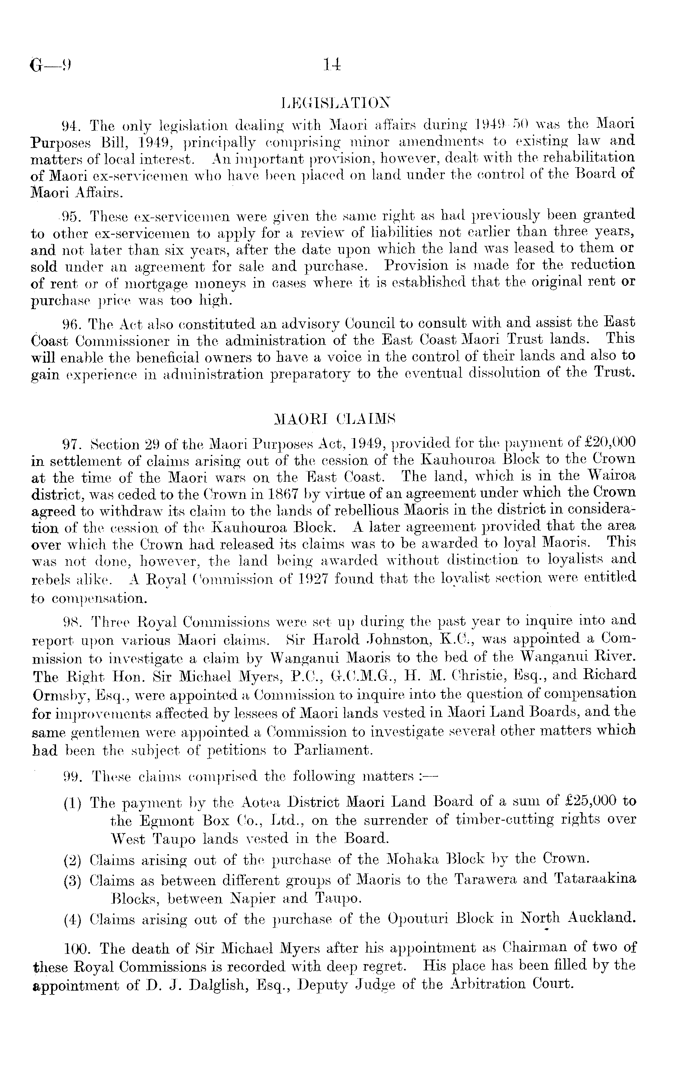 LEGISLATION 94. The only legislation dealing with Maori affairs during 1949-50 was the Maori Purposes Bill, 1949, principally comprising minor amendments to existing law and matters of local interest. An important provision, however, dealt with the rehabilitation of Maori ex-servicemen who have been placed on land under the control of the Board of Maori Affairs. 95. These ex-servicemen were given the same right as had previously been granted to other ex-servicemen to apply for a review of liabilities not earlier than three years, and not later than six years, after the date upon which the land was leased to them or sold under an agreement for sale and purchase. Provision is made for the reduction of rent or of mortgage moneys in cases where it is established that the original rent or purchase price was too high. 96. The Act also constituted an advisory Council to consult with and assist the East Coast Commissioner in the administration of the East Coast Maori Trust lands. This will enable the beneficial owners to have a voice in the control of their lands and also to gain experience in administration preparatory to the eventual dissolution of the Trust. MAORI CLAIMS 97. Section 29 of the Maori Purposes Act, 1949, provided for the payment of £20,000 in settlement of claims arising out of the cession of the Kauhouroa Block to the Crown at the time of the Maori wars on the East Coast. The land, which is in the Wairoa district, was ceded to the Crown in 1867 by virtue of an agreement under which the Crown agreed to withdraw its claim to the lands of rebellious Maoris in the district in consideration of the cession of the Kauhouroa Block. A later agreement provided that the area over which the Crown had released its claims was to be awarded to loyal Maoris. This was not done, however, the land being awarded without distinction to loyalists and rebels alike. A Royal Commission of 1927 found that the loyalist section were entitled to compensation. 98. Three Royal Commissions were set up during the past year to inquire into and report upon various Maori claims. Sir Harold Johnston, K.C;, was appointed a Commission to investigate a claim by Wanganui Maoris to the bed of the Wanganui River. The Right Hon. Sir Michael Myers, P.C., Gr.C.M.G-., H. M. Christie, Esq., and Richard Ormsby, Esq., were appointed a Commission to inquire into the question of compensation for improvements affected by lessees of Maori lands vested in Maori Land Boards, and the same gentlemen were appointed a Commission to investigate several other matters which had been the subject of petitions to Parliament. 99. These claims comprised the following matters : (1) The payment by the Aotea District Maori Land Board of a sum of £25,000 to the Egmont Box Co., Ltd., on the surrender of timber-cutting rights over West Taupo lands vested in the Board. (2) Claims arising out of the purchase of the Mohaka Block by the Crown. (3) Claims as between different groups of Maoris to the Tarawera and Tataraakina Blocks, between Napier and Taupo. (4) Claims arising out of the purchase of the Opouturi Block in North Auckland. 100. The death of Sir Michael Myers after his appointment as Chairman of two of these Royal Commissions is recorded with deep regret. His place has been filled by the appointment of D. J. Dalglish, Esq., Deputy Judge of the Arbitration Court.