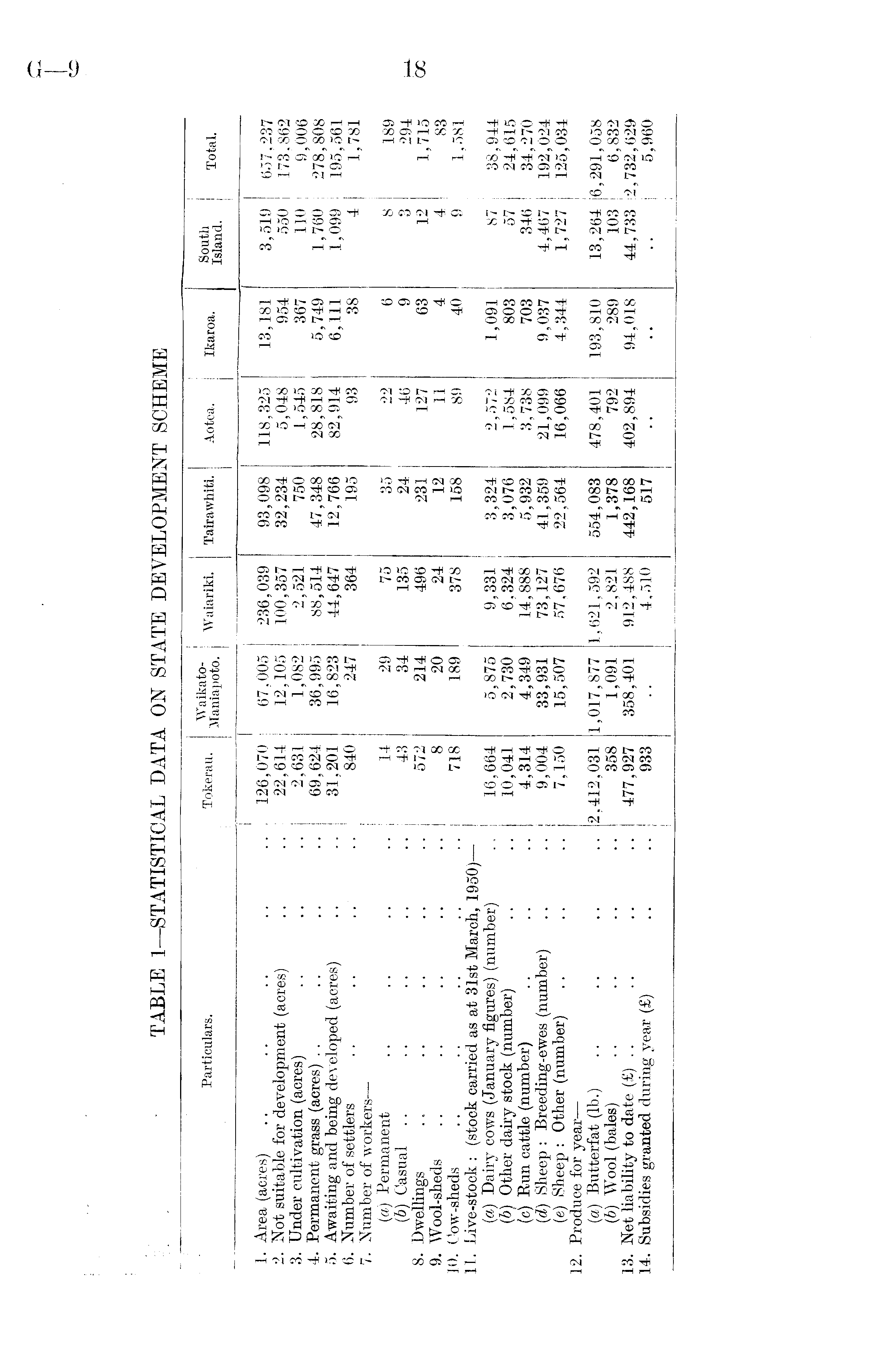 Particulars. Tokerau. WaikatoManiapoto. Waiariki. Tairawhiti. Aotea. Ikaroa. South Island. Total. 1. Area (acres) 126,070 67,005 236,039 93,098 118,325 13,181 3,519 657,237 2. Not suitable for development (acres) 22,614 12,105 100,357 32,234 5,048 954 550 173,862 3. Under cultivation (acres) 2,631 1,082 2,521 750 1,545 367 110 9,006 4. Permanent grass (acres) 69,624 36,995 88,514 47,348 28,818 5,749 1,760 278,808 5. Awaiting and being developed (acres) 31,201 16,823 44,647 12,766 82,914 6,111 1,099 195,561 6. Number of settlers 840 247 364 195 93 38 4 1,781 7. Number of workers — (a) Permanent 14 29 75 35 22 6 8 189 (6) Casual 43 34 135 24 46 9 3 294 8. Dwellings 572 214 496 231 127 63 12 1,715 9. Wool-sheds 8 20 24 12 11 4 4 83 10. Cow-sheds 718 189 378 158 89 40 9 1,581 11. Live-stock : (stock carried as at 31st March, 1950) — (a) Dairy cows (January figures) (number) 16,664 5,875 9,331 3,324 2,572 1,091 87 38,944 (b) Other dairy stock (number) 10,041 2,730 6,324 3,076 1,584 803 57 24,615 (c) Run cattle (number) 4,314 4,349 14,888 5,932 3,738 703 346 34,270 (>d) Sheep : Breeding-ewes (number) 9,004 33,931 73,127 41,359 21,099 9,037 4,467 192,024 (e) Sheep : Other (number) 7,150 15,507 57,676 22,564 16,066 4,344 1,727 125,034 12. Produce for year- — (a) Butterfat (lb.) 2,412,031 1,017,877 1,621,592 554,083 478,401 193,810 13,264 6,291,058 (6) Wool (bales) 358 1,091 2,821 1,378 792 289 103 6,832 13. Net liability to date (£) .. 477,927 358,401 912,488 442,168 402,894 94,018 44,733 2,732,629 14. Subsidies granted during year (£) 933 4,510 517 5,960