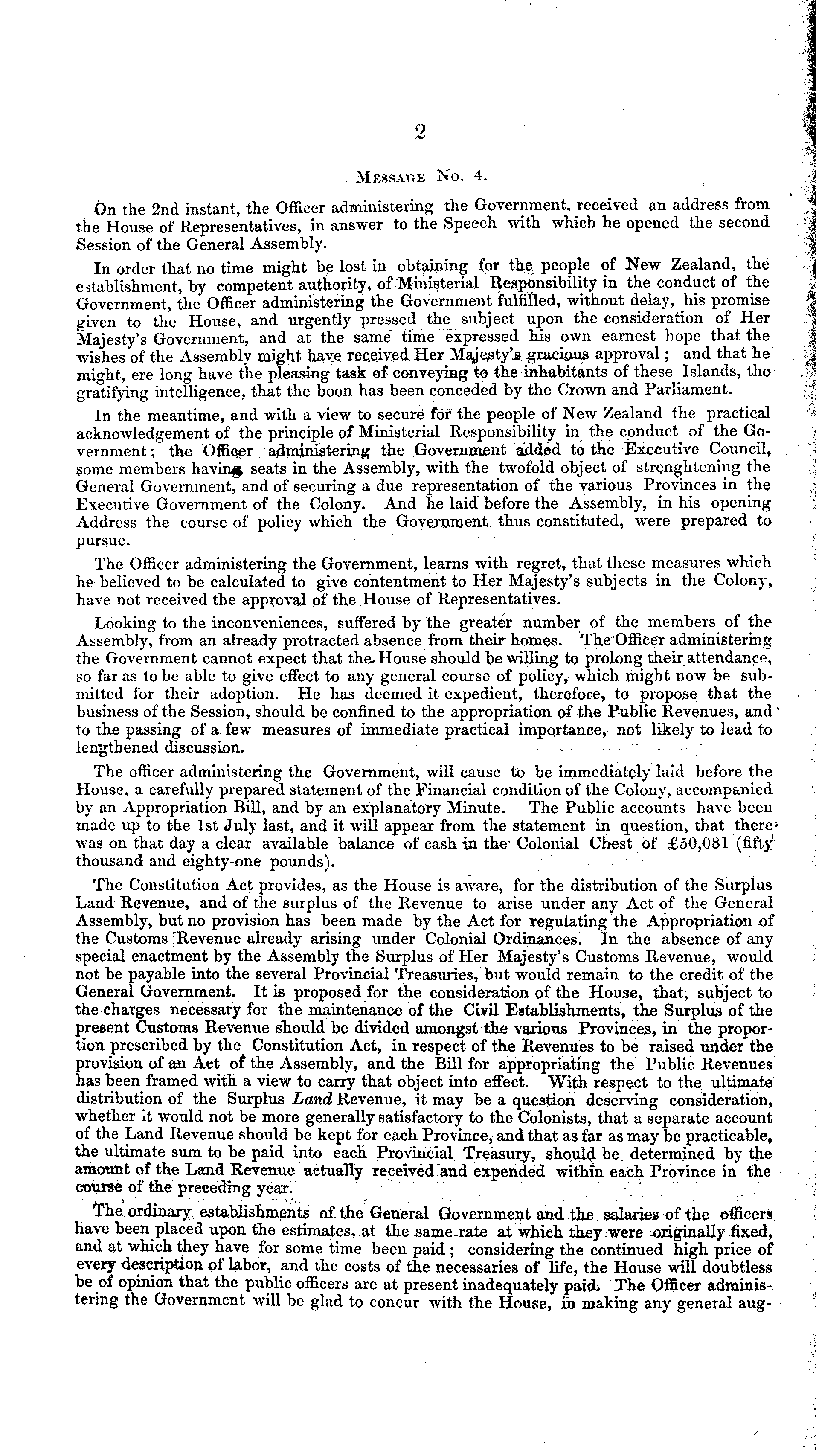 Mr.ssAGK No. 4. On the 2nd instant, the Officer administering the Government, received an address from the House of Representatives, in answer to the Speech with which he opened the second Session of the General Assembly. In order that no time might be lost in obtaining for the people of New Zealand, the establishment, by competent authority, of Ministerial Responsibility in the conduct of the Government, the Officer administering the Government fulfilled, without delay, his promise given to the House, and urgently pressed the subject upon the consideration of Her Majesty's Government, and at the same time expressed his own earnest hope that the wishes of the Assembly might have received Her Majesty's gracious approval: and that he might, ere long have the pleasing task of conveying to the inhabitants of these Islands, the gratifying intelligence, that the boon has been conceded by the Crown and Parliament. In the meantime, and with a view to secure for the people of New Zealand the practical acknowledgement of the principle of Ministerial Responsibility in the conduct of the Government ; the Officer administering the Government added to the Executive Council, gome members having seats in the Assembly, with the twofold object of strenghtening the General Government, and of securing a due representation of the various Provinces in the Executive Government of the Colony. And he laid before the Assembly, in his opening Address the course of policy which the Government thus constituted, were prepared to pursue. The Officer administering the Government, learns with regret, that these measures which he believed to be calculated to give contentment to Her Majesty's subjects in the Colony, have not received the approval of the House of Representatives. Looking to the inconveniences, suffered by the greater number of the members of the Assembly, from an already protracted absence from their homes. The Officer administering the Government cannot expect that the-House should be willing to prolong their attendance, so far as to be able to give effect to any general course of policy, which might now be submitted for their adoption. He has deemed it expedient, therefore, to propose that the business of the Session, should be confined to the appropriation of the Public Revenues, and to the passing of a few measures of immediate practical importance, not likely to lead to lengthened discussion. The officer administering the Government, will cause to be immediately laid before the House, a carefully prepared statement of the Financial condition of the Colony, accompanied by an Appropriation Bill, and by an explanatory Minute. The Public accounts have been made up to the Ist July last, and it will appear from the statement in question, that there> was on that day a clear available balance of cash in the Colonial Chest of £50,081 (fifty thousand and eighty-one pounds). The Constitution Act provides, as the House is aware, for the distribution of the Surplus Land Revenue, and of the surplus of the Revenue to arise under any Act of the General Assembly, but no provision has been made by the Act for regulating the Appropriation of the Customs "Revenue already arising under Colonial Ordinances. In the absence of any special enactment by the Assembly the Surplus of Her Majesty's Customs Revenue, would not be payable into the several Provincial Treasuries, but would remain to the credit of the General Government. It is proposed for the consideration of the House, that, subject to the charges necessary for the maintenance of the Civil Establishments, the Surplus of the present Customs Revenue should be divided amongst the various Provinces, in the proportion prescribed by the Constitution Act, in respect of the Revenues to be raised under the provision of an Act of the Assembly, and the Bill for appropriating the Public Revenues has been framed with a view to carry that object into effect. With respect to the ultimate distribution of the Surplus Land Revenue, it may be a question deserving consideration, whether xt would not be more generally satisfactory to the Colonists, that a separate account of the Land Revenue should be kept for each Province, and that as far as may be practicable, the ultimate sum to be paid into each Provincial Treasury, should be determined by the amount of the Land Revenue actually received and expended within each Province in the course of the preceding year. The ordinary establishments of the General Government and the salaries of the officers have been placed upon the estimates, at the same rate at which they were originally fixed, and at which they have for some time been paid ; considering the continued high price of every description of labor, and the costs of the necessaries of life, the House will doubtless be of opinion that the public officers are at present inadequately paid. The Officer administering the Government will be glad to concur with the House, in making any general aug-