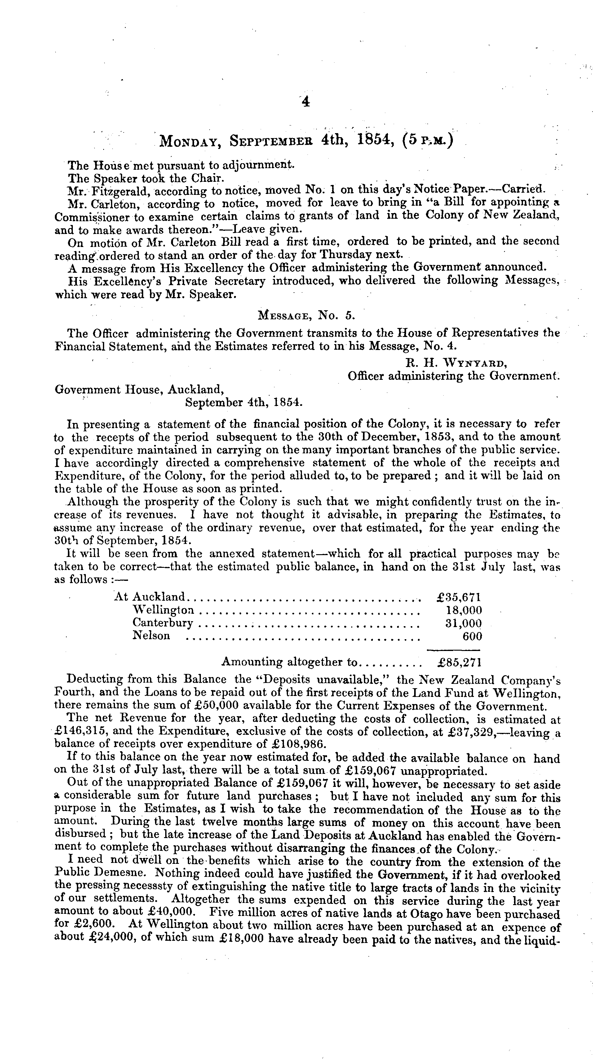 Monday, Sepptembee 4th, 1854, (5 p.m.) The House met pursuant to adjournment. The Speaker took the Chair. Mr. Fitzgerald, according to notice, moved No. 1 on this day s Notice Paper.—Carried. Mr. Carleton, according to notice, moved for leave to bring in "a Bill for appointing a Commissioner to examine certain claims to grants of land in the Colony of New Zealand, and to make awards thereon."—Leave given. On motion of Mr. Carleton Bill read a first time, ordered to be printed, and the second reading' ordered to stand an order of the day for Thursday next. A message from His Excellency the Officer administering the Government announced. His Excellency's Private Secretary introduced, who delivered the following Messages, which were read by Mr. Speaker. Message, No. 5. The Officer administering the Government transmits to the House of Representatives the Financial Statement, and the Estimates referred to in his Message, No. 4. It. H. Wynyard, Officer administering the Government. Government House, Auckland, September 4th, 1854. In presenting a statement of the financial position of the Colony, it is necessary to refer to the recepts of the period subsequent to the 30th of December, 1853, and to the amount of expenditure maintained in carrying on the many important branches of the public service. I have accordingly directed a comprehensive statement of the whole of the receipts and Expenditure, of the Colony, for the period alluded to, to be prepared ; and it will be laid on the table of the House as soon as printed. Although the prosperity of the Colony is such that we might confidently trust on the increase of its revenues. I have not thought it advisable, in preparing the Estimates, to tussumc any increase of the ordinary revenue, over that estimated, for the year ending the 30th of September, 1854. It will be seen from the annexed statement—which for all practical purposes may be taken to be correct—that the estimated public balance, in hand on the 31st July last, was as follows :— At Auckland £35,671 Wellington 18,000 Canterbury 31,000 Nelson 600 Amounting altogether to £85,271 Deducting from this Balance the "Deposits unavailable," the New Zealand Company's Fourth, and the Loans to be repaid out of the first receipts of the Land Fund at Wellington, there remains the sum of £50,000 available for the Current Expenses of the Government. The net Revenue for the year, after deducting the costs of collection, is estimated at £146,315, and the Expenditure, exclusive of the costs of collection, at £37,329, —leaving a balance of receipts over expenditure of £108,986. If to this balance on the year now estimated for, be added the available balance on hand on the 31st of July last, there will be a total sum of £159,067 unappropriated. Out of the unappropriated Balance of £159,067 it will, however, be necessary to set aside a considerable sum for future land purchases ; but I have not included any sum for this purpose in the Estimates, as I wish to take the recommendation of the House as to the amount. During the last twelve months large sums of money on this account have been disbursed ; but the late increase of the Land Deposits at Auckland has enabled the Government to complete the purchases without disarranging the finances of the Colony. I need not dwell on the benefits which arise to the country from the extension of the Public Demesne. Nothing indeed could have justified the Government, if it had overlooked the pressing necesssty of extinguishing the native title to large tracts of lands in the vicinity of our settlements. Altogether the sums expended on this service during the last year amount to about £40,000. Five million acres of native lands at Otago have been purchased tor £2,600. At Wellington about two million acres have been purchased at an expence of about £24,000, of which sum £18,000 have already been paid to the natives, and the liquid-