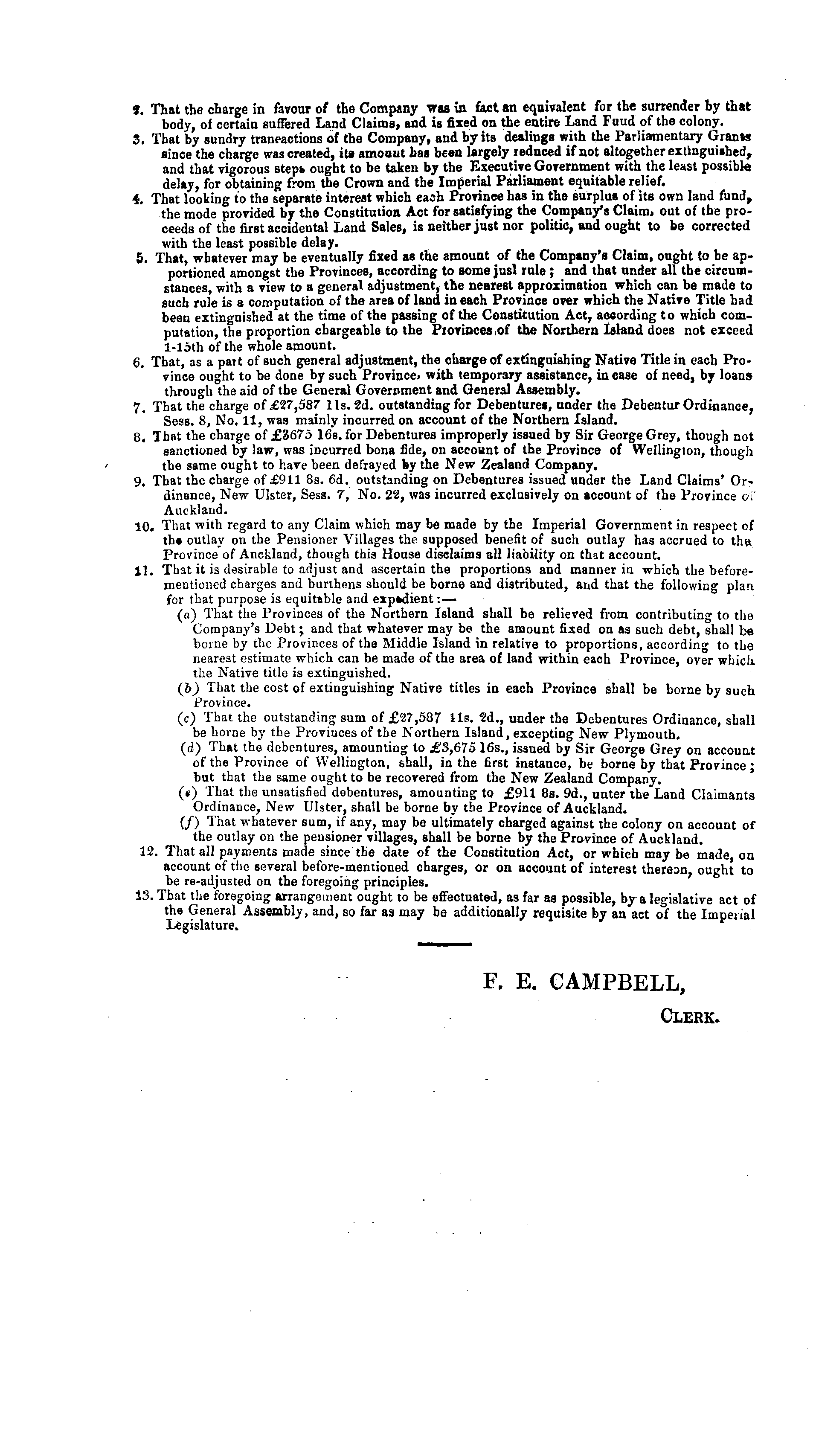9. That the charge in favour of the Company was in fact an equivalent for the surrender by that body, of certain suffered Land Claims, and is fixed on the entire Land Fuud of the colony. 3. That by sundry traneactions of the Company, and by its dealings with the Parliamentary Grants since the charge was created, ita amouut has been largely reduced if not altogether extinguished, and that vigorous steps ought to be taken by the Executive Government with the least possible delay, for obtaining from the Crown and the Imperial Parliament equitable relief. 4. That looking to the separate interest which each Province has in the surplus of its own land fund, the mode provided by the Constitution Act for satisfying the Company's Claim, out of the proceeds of the first accidental Land Sales, is neither just nor politic, and ought to be corrected with the least possible delay. 5. That, whatever may be eventually fixed as the amount of the Company's Claim, ought to be apportioned amongst the Provinces, according to some jusl rule ; and that under all the circumstances, with a view to a general adjustment, the nearest approximation which can be made to such rule is a computation of the area of land in each Province over which the Native Title had been extinguished at the time of the passing of the Constitution Act, according to which computation, the proportion chargeable to the Provinces of the Northern Island does not exceed 1-loth of the whole amount. 6. That, as a part of such general adjustment, the charge of extinguishing Native Title in each Province ought to be done by such Province, with temporary assistance, in case of need, by loans through the aid of the General Government and General Assembly. 7. That the charge of £27,587 1 Is. 2d. outstanding for Debenture*, under the Debentur Ordinance, Sess. 8, No. 11, was mainly incurred on account of the Northern Island. 8. That the charge of £3675 16s. for Debentures improperly issued by Sir George Grey, though not sanctioned by law, was incurred bona fide, on account of the Province of Wellington, though the same ought to have been defrayed by the New Zealand Company. 9. That the charge of £911 Bs. 6d. outstanding on Debentures issued under the Land Claims' Ordinance, New Ulster, Sess. 7, No. 22, was incurred exclusively on account of the Province of Auckland. 10. That with regard to any Claim which may be made by the Imperial Government in respect of th« outlay on the Pensioner Villages the supposed benefit of such outlay has accrued to the Province of Anckland, though this House disclaims all liability on that account. 11. That it is desirable to adjust and ascertain the proportions and manner in which the beforementioned charges and burthens should be borne and distributed, and that the following plan for that purpose is equitable and exp»dient:— (a) That the Provinces of the Northern Island shall be relieved from contributing to the Company's Debt; and that whatever may be the amount fixed on as such debt, shall be borne by the Provinces of the Middle Island in relative to proportions, according to the nearest estimate which can be made of the area of land within each Province, over which the Native title is extinguished. (b) That the cost of extinguishing Native titles in each Province shall be borne by such Province. (c) That the outstanding sum of £27,587 lis. 2d., under the Debentures Ordinance, shall be home by the Provinces of the Northern Island, excepting New Plymouth. (d) Th»t the debentures, amounting to £3,675 165., issued by Sir George Grey on account of the Province of Wellington, shall, in the first instance, be borne by that Province; but that the same ought to be recovered from the New Zealand Company. («) That the unsatisfied debentures, amounting to £911 Bs. 9d., unter the Land Claimants Ordinance, New Ulster, shall be borne by the Province of Auckland. (/) That whatever sum, if any, may be ultimately charged against the colony on account of the outlay on the pensioner villages, shall be borne by the Province of Auckland. 12. That all payments made since the date of the Constitution Act, or which may be made, on account of the several before-mentioned charges, or on account of interest thereon, ought to be re-adjusted on the foregoing principles. 13. That the foregoing arrangement ought to be effectuated, as far as possible, by a legislative act of the General Assembly, and, so far as may be additionally requisite by an act of the Imperial Legislature. F. E. CAMPBELL, Clerk.