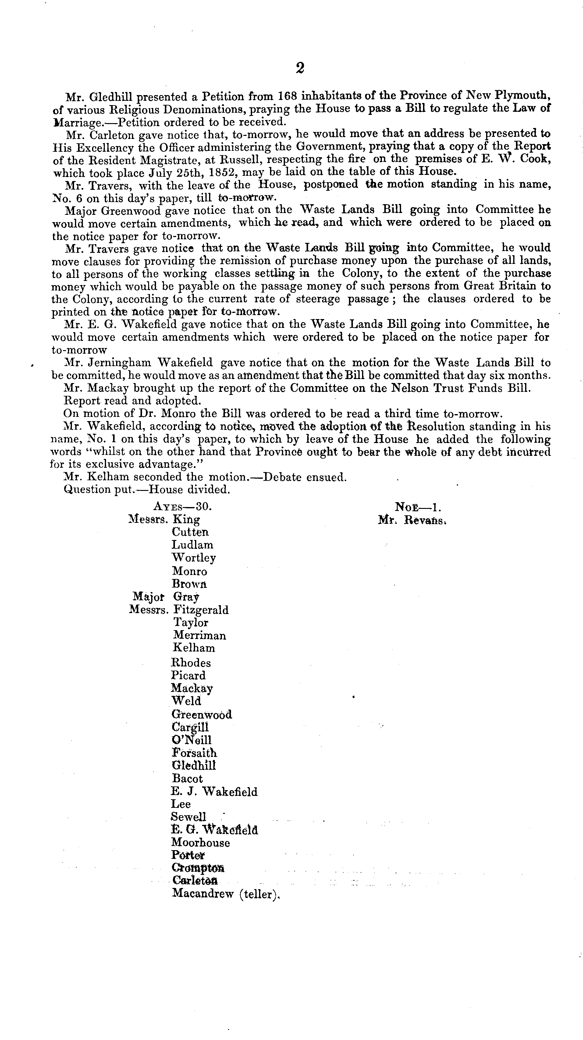 Mr. Gledhill presented a Petition from 168 inhabitants of the Province of New Plymouth, of various Religious Denominations, praying the House to pass a Bill to regulate the Law of Marriage.—Petition ordered to be received. Mr. Carleton gave notice that, to-morrow, he would move that an address be presented to His Excellency the Officer administering the Government, praying that a copy of the Report of the Resident Magistrate, at Russell, respecting the fire on the premises of E. W. Cook, which took place July 25th, 1852, may be laid on the table of this House. Mr. Travers, with the leave of the House, postponed the motion standing in his name, No. 6 on this day's paper, till to-morrow. Major Greenwood gave notice that on the Waste Lands Bill going into Committee he would move certain amendments, which he read, and which were ordered to be placed on the notice paper for to-morrow. Mr. Travers gave notice that on the Waste Lands Bill going into Committee, he would move clauses for providing the remission of purchase money upon the purchase of all lands, to all persons of the working classes settling in the Colony, to the extent of the purchase money which would be payable on the passage money of such persons from Great Britain to the Colony, according to the current rate of steerage passage ; the clauses ordered to be printed on the notice paper for to-morrow. Mr. E. G. Wakefield gave notice that on the Waste Lands Bill going into Committee, he would move certain amendments which were ordered to be placed on the notice paper for to-morrow Mr. Jerningham Wakefield gave notice that on the motion for the Waste Lands Bill to be committed, he would move as an amendment that the Bill be committed that day six months. Mr. Mackay brought up the report of the Committee on the Nelson Trust Funds Bill. Report read and adopted. On motion of Dr. Monro the Bill was ordered to be read a third time to-morrow. Mr. Wakefield, according to notice, moved the adoption of the Resolution standing in his name, No. 1 on this day's paper, to which by leave of the House he added the following words "whilst on the other hand that Province ought to bear the whole of any debt incurred for its exclusive advantage." Mr. Kelham seconded the motion.—Debate ensued. Question put.—House divided. Ayes—3o. NOE—I. Messrs. King Mr. Revans. Cut ten Ludlam Wortley Monro Brown Major Gray Messrs. Fitzgerald Taylor Merriman Kelham Rhodes Picard Mackay Weld Greenwood Cargill O'Neill F orsaith Gledhill Bacot E. J. Wakefield Lee Sewell E. G. Wakefield Moorhouse Porter CromptOft Carletoa Macandrew (teller).