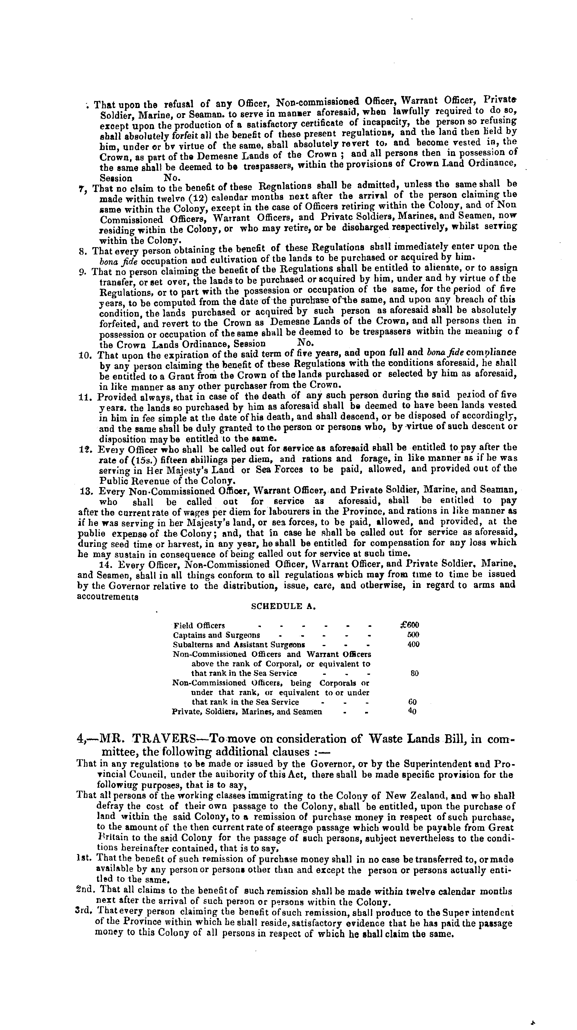 . That upon the refusal of any Officer, Non-commissioned Officer, Warrant Officer, Private Soldier, Marine, or Seaman, to serve in manaer aforesaid, when lawfully required to do so, except upon the production of a satisfactory certificate of incapacity the person so refusing shall absolutely forfeit all the benefit of these present regulations, and the land then held by liim, under or bv virtue of the same, sball absolutely revert to, and become vested in, the Crown, as part of the Demesne Lands of the Crown ; and all persons then in possess,on of the same shall be deemed to be trespassers, within the provisions of Crown Land Ordinance, 7, That nTclaim to the benefit of these Regulations shall be admitted, unless the same shall be made within twelve (12) calendar months next after the arrival of the person claiming the same within the Colony, except in the case of Officers retiring within the Colony, and ot JNon Commissioned Officers, Warrant Officers, and Private Soldiers, Marines, and Seamen, now residing within the Colony, or who may retire, or be discharged respectively, whilst serving 8 That e'veryperfo 0 " obtaining the benefit of these Regulations shall immediately enter upon the bona fide occupation and cultivation of the lands to be purchased or acquired by him. 9. That no person claiming the benefit of the Regulations shall be entitled to alienate, or to assign transfer, or set over, the lands to be purchased or acquired by him, under and by virtue of the Regulations, or to part with the possession or occupation of the same, for the period of five years, to be computed from the date of the purchase of the same, and upon any breach of this condition, the lands purchased or acquired by such person as aforesaid shall be absolutely forfeited,'and revert to the Crown as Demesne Lands of the Crown, and all persons then in possession or occupation of the same shall be deemed to be trespassers within the meaning of the Crown Lands Ordinance, Session No. 10. That upon the expiration of the said term of five years, and upon full and bona fide compliance by any person claiming the benefit of these Regulations with the conditions aforesaid, he shall be entitled to a Grant from the Crown of the lands purchased or selected by him as aforesaid, in like manner as any other purchaser from the Crown. 11. Provided always, that in case of the death of any such person during the said peiiod of five years, the lands so purchased by him as aforesaid shall be deemed to have been lands vested in him in fee simple at the date ofhis death, and shall descend, or be disposed of accordingly, and the same shall be duly granted to the person or persons who, by virtue of such descent or disposition maybe entitled to the same. 1?. Eveiy Officer who shall be called out for service as aforesaid sball be entitled to pay after the rate of (155.) fifteen shillings per diem, and rations and forage, in like manner as if lie was serving in Her Majesty's Land or Sea Forces to be paid, allowed, and provided out of the Public Revenue of the Colony. 13. Every Non-Commissioned Officer, Warrant Officer, and Private Soldier, Marine, and Seaman, who shall be called out for service as aforesaid, shall be entitled to pay after the currentrate of wages per diem for labourers in the Province, and rations in like manner as if he was serving in her Majesty's land, or sea forces, to be paid, allowed, and provided, at the publie expense of the Colony; and, that in case he shall be called out for service as aforesaid, during seed time or harvest, in any year, he shall be entitled for compensation for any loss which be may sustain in consequence of being called out for service at such time. 14. Every Officer, Non-Commissioned Officer, Warrant Officer, and Private Soldier, Marine, and Seamen, shall in all things conform to all regulations which may from time to time be issued by the Governor relative to the distribution, issue, care, and otherwise, in regard to arms and accoutrements SCHEDULE A. Field Officers ------ £600 Captains and Surgeons - .... 500 Subalterns and Assistant Surgeons ... 400 Non-Commissioned Officers and Warrant Officers above the rank of Corporal, or equivalent to that rank in the Sea Service ... 80 Non-Commissioned Officers, being Corporals or under that rank, or equivalent to or under that rank in the Sea Service ... 60 Private, Soldiers, Marines, and Seamen - 4 0 4, —MR. TRAVERS—To move on consideration of Waste Lands Bill, in committee, the following additional clauses :— That in any regulations to be made or issued by the Governor, or by the Superintendent and Provincial Council, under the auihority of this Act, there shall be made specific provision for the following purposes, that is to say, That all persons of the working classes immigrating to the Colony of New Zealand, and who sball defray the cost of their own passage to the Colony, shall be entitled, upon the purchase of land within the said Colony, to a remission of purchase money in respect of such purchase, to the amount of the then currentrate of steerage passage which would be payable from Great Britain to the said Colony for the passage of such persons, subject nevertheless to the conditions hereinafter contained, that is to say, Ist. That the benefit of such remission of purchase money shall in no case be transferred to, or made available by any person or person* other than and except the person or persons actually entitled to the same. 2nd. That all claims to the benefit of such remission shall be made within twelve calendar months next after the arrival of such person or persons within the Colony. 3rd, 1 hat every person claiming the benefit of such remission, shall produce to the Super intendent of the Province within which he shall reside, satisfactory evidence that he has paid the passage money to this Colony of all persons in respect of which he shall claim the same.