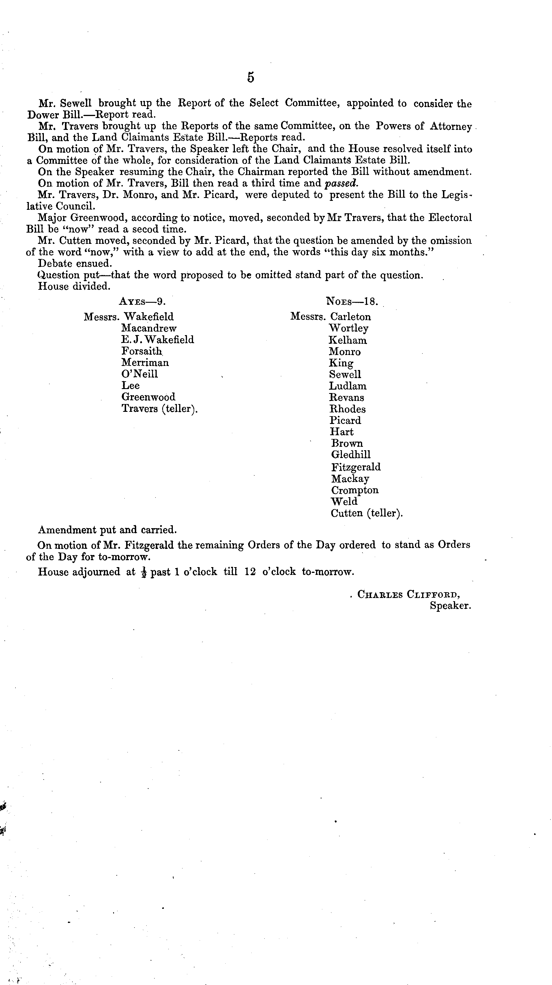 Mr. Sewcll brought up the Report of the Select Committee, appointed to consider the Dower Bill. —Report read. Mr. Travers brought up the Reports of the same Committee, on the Powers of Attorney Bill, and the Land Claimants Estate Bill.—Reports read. On motion of Mr. Travers, the Speaker left the Chair, and the House resolved itself into a Committee of the whole, for consideration of the Land Claimants Estate Bill. On the Speaker resuming the Chair, the Chairman reported the Bill without amendment. On motion of Mr. Travers, Bill then read a third time and passed. Mr. Travers, Dr. Monro, and Mr. Picard, were deputed to present the Bill to the Legislative Council. Major Greenwood, according to notice, moved, seconded by Mr Travers, that the Electoral Bill be "now" read a secod time. Mr. Cutten moved, seconded by Mr. Picard, that the question be amended by the omission of the word "now," with a view to add at the end, the words "this day six months." Debate ensued. Question put —that the word proposed to be omitted stand part of the question. House divided. Ayes—9. Noes—lB. Messrs. Wakefield Messrs. Carleton Macandrew Wortley E.J.Wakefield Kelham Forsaith Monro Merriman King O'Neill Sewell Lee Ludlam Greenwood Revans Travers (teller). Rhodes Picard Hart Brown Gledhill Fitzgerald Mackay Crompton Weld Cutten (teller). Amendment put and carried. On motion of Mr. Fitzgerald the remaining Orders of the Day ordered to stand as Orders of the Day for to-morrow. House adjourned at | past 1 o'clock till 12 o'clock to-morrow. . Chakles Clifford, Speaker.