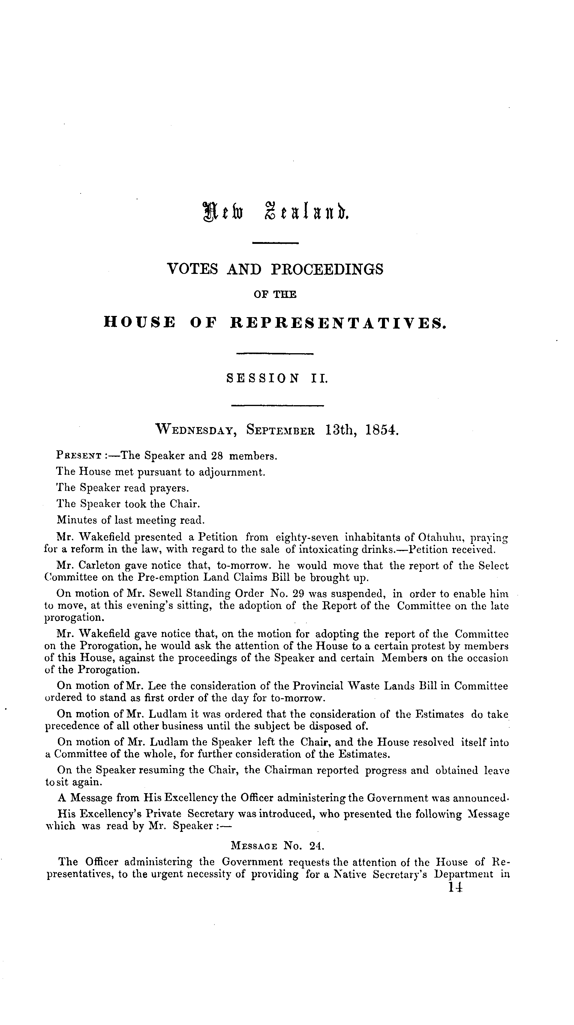 It *fo jg talk n b. VOTES AND PROCEEDINGS OF THE HOUSE OF REPRESENTATIVES. SESSION 11. Wednesday, September 13th, 1854. Present :—The Speaker and 28 members. The House met pursuant to adjournment. The Speaker read prayers. The Speaker took the Chair. Minutes of last meeting read. Mr. Wakefield presented a Petition from eighty-seven inhabitants of Otahuhu, praying for a reform in the law, with regard to the sale of intoxicating drinks.—Petition received. Mr. Carleton gave notice that, to-morrow, he would move that the report of the Select Committee on the Pre-emption Land Claims Bill be brought up. On motion of Mr. Sewell Standing Order No. 29 was suspended, in order to enable him to move, at this evening's sitting, the adoption of the Report of the Committee on the late prorogation. Mr. Wakefield gave notice that, on the motion for adopting the report of the Committee on the Prorogation, he would ask the attention of the House to a certain protest by members of this House, against the proceedings of the Speaker and certain Members on the occasion of the Prorogation. On motion of Mr. Lee the consideration of the Provincial Waste Lands Bill in Committee ordered to stand as first order of the day for to-morrow. On motion of Mr. Ludlam it was ordered that the consideration of the Estimates do take precedence of all other business until the subject be disposed of. On motion of Mr. Ludlam the Speaker left the Chair, and the House resolved itself into a Committee of the whole, for further consideration of the Estimates. On the Speaker resuming the Chair, the Chairman reported progress and obtained leave to sit again. A Message from His Excellency the Officer administering the Government was announced. His Excellency's Private Secretary was introduced, who presented the following Message which was read by Mr. Speaker :— Message No. 24. The Officer administering the Government requests the attention of the House of Representatives, to the urgent necessity of providing for a Native Secretary's Department in 14