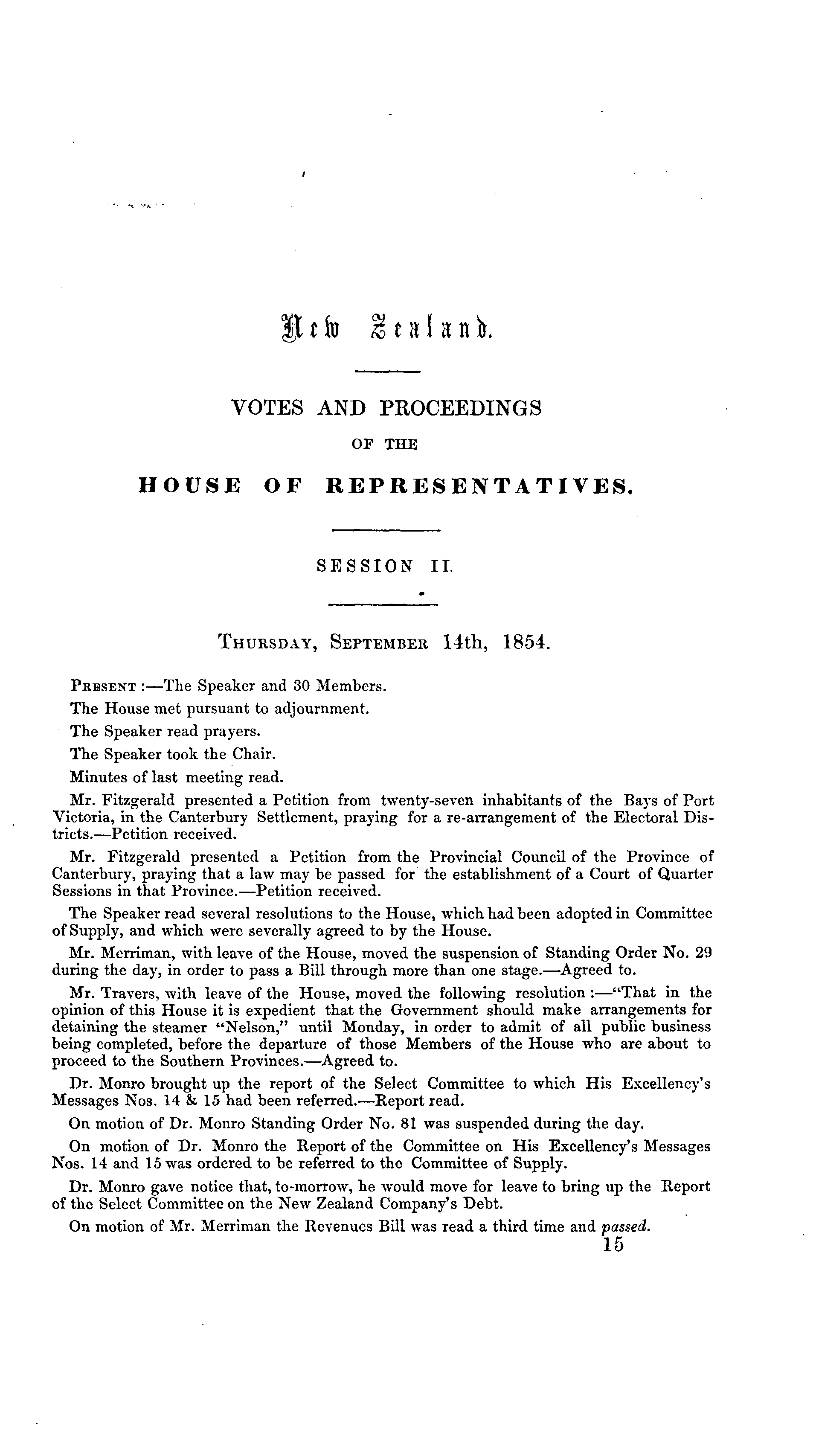 / It tfo lea I a n ft. VOTES AND PROCEEDINGS OF THE HOUSE OF REPRESENTATIVES. SESSION 11. Thursday, September 14th, 1854. Present : —Tlie Speaker and 30 Members. The House met pursuant to adjournment. The Speaker read prayers. The Speaker took the Chair. Minutes of last meeting read. Mr. Fitzgerald presented a Petition from twenty-seven inhabitants of the Bays of Port Victoria, in the Canterbury Settlement, praying for a re-arrangement of the Electoral Districts.—Petition received. Mr. Fitzgerald presented a Petition from the Provincial Council of the Province of Canterbury, praying that a law may be passed for the establishment of a Court of Quarter Sessions in that Province.—Petition received. The Speaker read several resolutions to the House, which had been adopted in Committee of Supply, and which were severally agreed to by the House. Mr. Merriman, with leave of the House, moved the suspension of Standing Order No. 29 during the day, in order to pass a Bill through more than one stage. —Agreed to. Mr. Travers, with leave of the House, moved the following resolution :—"That in the opinion of this House it is expedient that the Government should make arrangements for detaining the steamer "Nelson," until Monday, in order to admit of all public business being completed, before the departure of those Members of the House who are about to proceed to the Southern Provinces. —Agreed to. Dr. Monro brought up the report of the Select Committee to which His Excellency's Messages Nos. 14 & 15 had been referred.—Report read. On motion of Dr. Monro Standing Order No. 81 was suspended during the day. On motion of Dr. Monro the Report of the Committee on His Excellency's Messages Nos. 14 and 15 was ordered to be referred to the Committee of Supply. Dr. Monro gave notice that, to-morrow, he would move for leave to bring up the Report of the Select Committee on the New Zealand Company's Debt. On motion of Mr. Merriman the Revenues Bill was read a third time and passed. 15