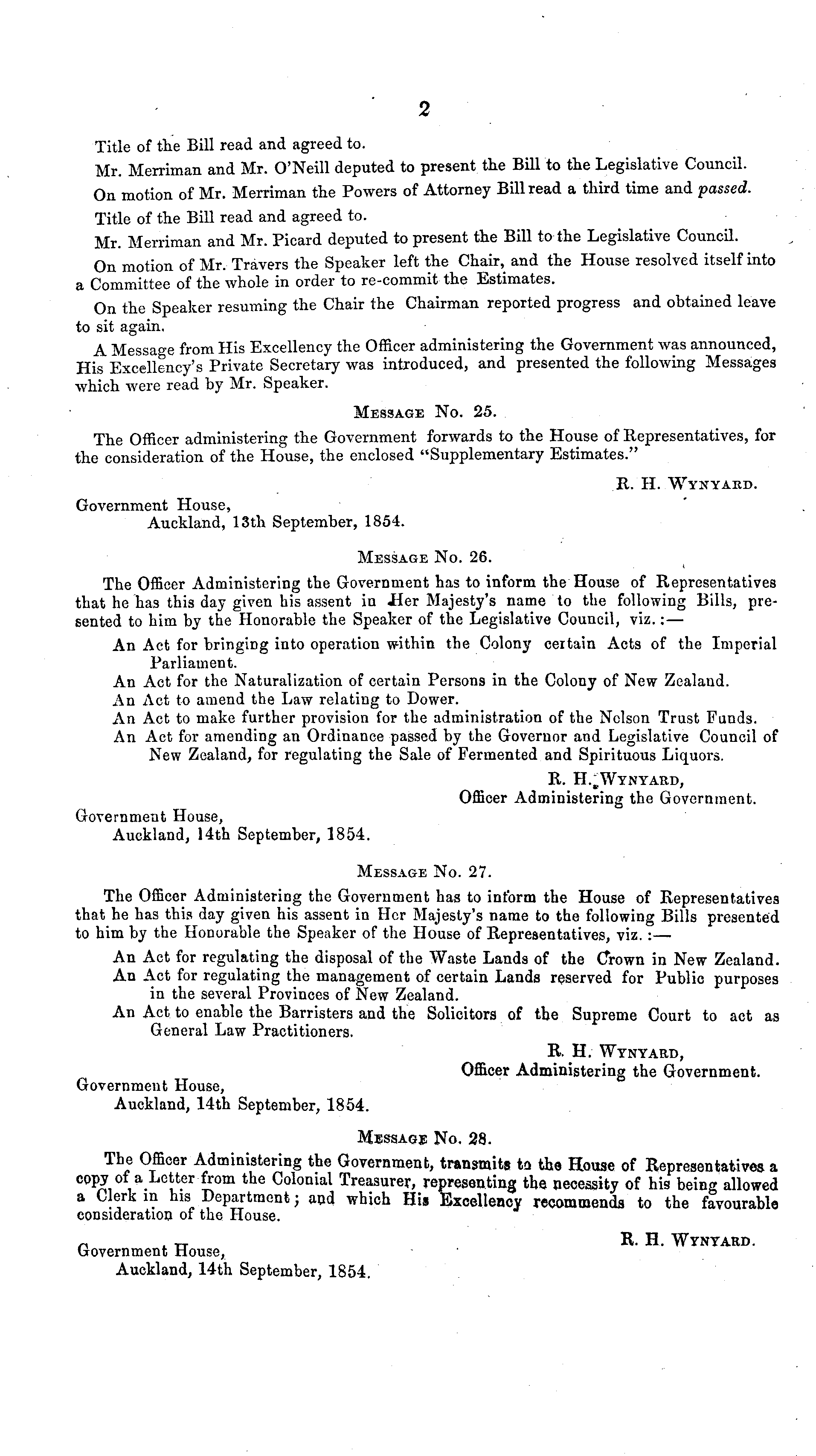 Title of the Bill read and agreed to. ]\£erriman and Mr. O'Neill deputed to present tlie Bill to the Legislati\e Council. On motion of Mr. Merriman the Powers of Attorney Bill read a third time and passed. Title of the Bill read and agreed to. Mr. Merriman and Mr. Picard deputed to present the Bill to the Legislative Council. On motion of Mr. Travers the Speaker left the Chair, and the House resolved itself into a Committee of the whole in order to re-commit the Estimates. On the Speaker resuming the Chair the Chairman reported progress and obtained leave to sit again. A Message from His Excellency the Officer administering the Government was announced, His Excellency's Private Secretary was introduced, and presented the following Messages which were read by Mr. Speaker. Message No. 25. The Officer administering the Government forwards to the House of Representatives, for the consideration of the House, the enclosed "Supplementary Estimates." R. H. Wyxyaed. Government House, Auckland, 13th September, 1854. Message No. 26. The Officer Administering the Government has to inform the House of Representatives that he has this day given his assent in Her Majesty's name to the following Bills, presented to him by the Honorable the Speaker of the Legislative Council, viz.: — An Act for bringing into operation within the Colony certain Acts of the Imperial Parliament. An Act for the Naturalization of certain Persons in the Colony of New Zealand. An Act to amend the Law relating to Dower. x\n Act to make further provision for the administration of the Nelson Trust Funds. An Act for amending an Ordinance passed by the Governor and Legislative Council of New Zealand, for regulating the Sale of Fermented and Spirituous Liquors. R. H. v Wynyard, Officer Administering the Government. Government House, Auckland, 14th September, 1854. Message No. 27. The Officer Administering the Government has to inform the House of Representatives that he has this day given his assent in Her Majesty's name to the following Bills presented to him by the Honorable the Speaker of the House of Representatives, viz. :— An Act for regulating the disposal of the Waste Lands of the Crown in New Zealand. An Act for regulating the management of certain Lands reserved for Public purposes in the several Provinces of New Zealand. An Act to enable the Barristers and the Solicitors of the Supreme Court to act as General Law Practitioners. R. H. Wynyard, Officer Administering the Government. Government House, Auckland, 14th September, 1854. Message No. 28. The Officer Administering the Government, transmits to the House of Representatives a eopy °f a Letter from the Colonial Treasurer, representing the necessity of his being allowed a Clerk in his Department; and which His Excellency recommends to the favourable consideration of the House. fy , TT R. H. Wynyard. (jrovernment House, Auckland, 14th September, 1854.