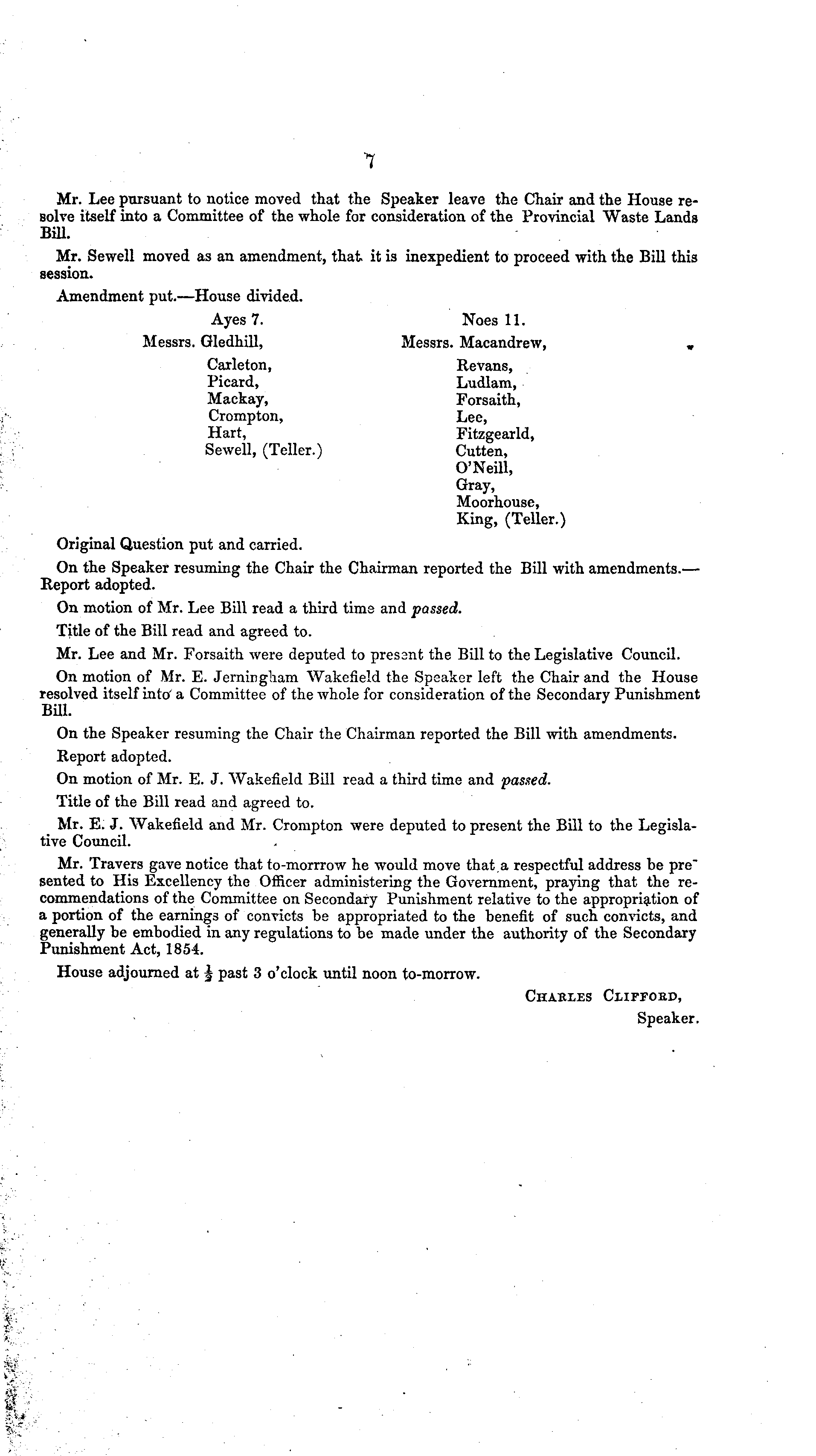 Mr. Lee pursuant to notice moved that the Speaker leave the Chair and the House resolve itself into a Committee of the whole for consideration of the Provincial Waste Lands Bill. Mr. Sewell moved as an amendment, that it is inexpedient to proceed with the Bill this session. Amendment put.—House divided. Ayes 7. Noes 11. Messrs. Gledhill, Messrs. Macandrew, „ Carleton, Revans, Picard, Ludlam, Mackay, Forsaith, Crompton, Lec, Hart, Fitzgearld, Sewell, (Teller.) Cutten, O'Neill, Gray, Moorhouse, King, (Teller.) Original Question put and carried. On the Speaker resuming the Chair the Chairman reported the Bill with amendments.— Report adopted. On motion of Mr. Lee Bill read a third time and passed. Title of the Bill read and agreed to. Mr. Lee and Mr. Forsaith were deputed to present the Bill to the Legislative Council. On motion of Mr. E. Jernirgliam Wakefield the Speaker left the Chair and the House resolved itself into a Committee of the whole for consideration of the Secondary Punishment Bill. On the Speaker resuming the Chair the Chairman reported the Bill with amendments. Report adopted. On motion of Mr. E. J. Wakefield Bill read a third time and passed. Title of the Bill read and agreed to. Mr. E. J. Wakefield and Mr. Crompton were deputed to present the Bill to the Legislative Council. Mr. Travers gave notice that to-morrrow he would move that a respectful address be pre" sented to His Excellency the Officer administering the Government, praying that the recommendations of the Committee on Secondary Punishment relative to the appropriation of a portion of the earnings of convicts be appropriated to the benefit of such convicts, and generally be embodied in any regulations to be made under the authority of the Secondary Punishment Act, 1854. House adjourned at 3 past 3 o'clock until noon to-morrow. Charles Clifford, Speaker.