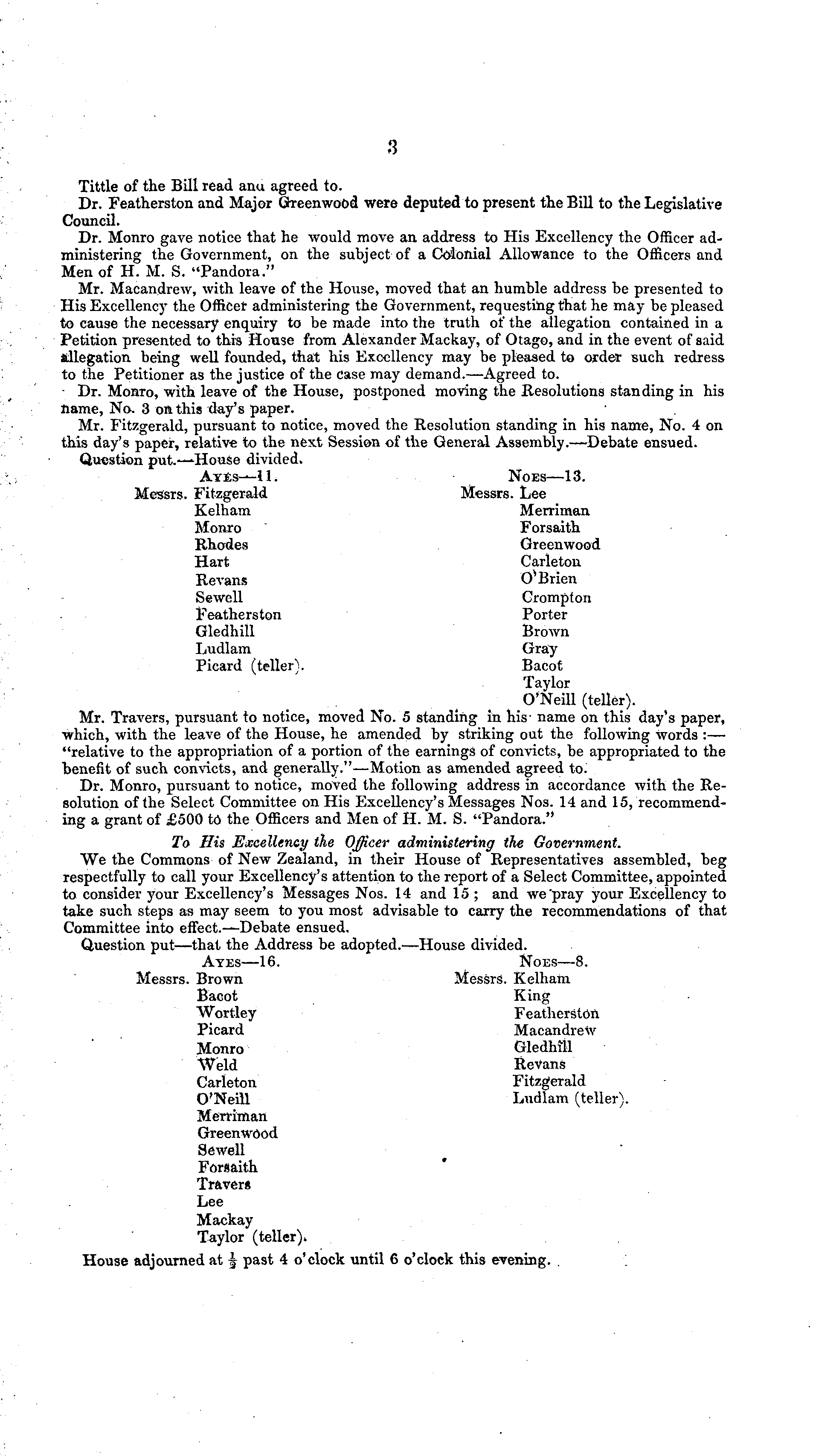 Tittle of the Bill read anu agreed to. Dr. Featherston and Major Greenwood were deputed to present the Bill to the Legislative Council. Dr. Monro gave notice that he would move an address to His Excellency the Officer administering the Government, on the subject of a Colonial Allowance to the Officers and Men of H. M. S. "Pandora." Mr. Macandrew, with leave of the House, moved that an humble address be presented to His Excellency the Officer administering the Government, requesting that he may be pleased to cause the necessary enquiry to be made into the truth of the allegation contained in a Petition presented to this House from Alexander Mackay, of Otago, and in the event of said allegation being well founded, that his Excellency may be pleased to order such redress to the Petitioner as the justice of the case may demand.—Agreed to. Dr. Monro, with leave of the House, postponed moving the Resolutions standing in his name, No. 3 on this day's paper. Mr. Fitzgerald, pursuant to notice, moved the Resolution standing in his name, No. 4 on this day's paper, relative to the next Session of the General Assembly.—Debate ensued. Question put. —House divided. NOES—I 3. Messrs. Fitzgerald Messrs. Lee Kelham Merriman Monro Forsaith Rhodes Greenwood Hart Carleton Revans O'Brien Sewell Crompton Featherston Porter Gledhill Brown Ludlam Gray Picard (teller). Bacot Taylor O'Neill (teller). Mr. Travers, pursuant to notice, moved No. 5 standing in his name on this day's paper, which, with the leave of the House, he amended by striking out the following words :— "relative to the appropriation of a portion of the earnings of convicts, be appropriated to the benefit of such convicts, and generally."—Motion as amended agreed to. Dr. Monro, pursuant to notice, moved the following address in accordance with the Resolution of the Select Committee on His Excellency's Messages Nos. 14 and 15, recommending a grant of £500 to the Officers and Men of H. M. S. "Pandora." To Ills Excellency the Officer administering the Government. We the Commons of New Zealand, in their House of Representatives assembled, beg respectfully to call your Excellency's attention to the report of a Select Committee, appointed to consider your Excellency's Messages Nos. 14 and 15 ; and we'pray your Excellency to take such steps as may seem to you most advisable to carry the recommendations of that Committee into effect.—Debate ensued. Question put —that the Address be adopted.—House divided. Ayes—l 6. Noes —8. Messrs. Brown Messrs. Kelham Bacot Kiug Wortley Featherston Picard Macandrew Monro Gledhill Weld Revans Carleton Fitzgerald O'Neill Ludlam (teller). Merriman Greenwood Sewell Forsaith Travers Lee Mackay Taylor (teller). House adjourned at 5 past 4 o'clock until 6 o'clock this evening.