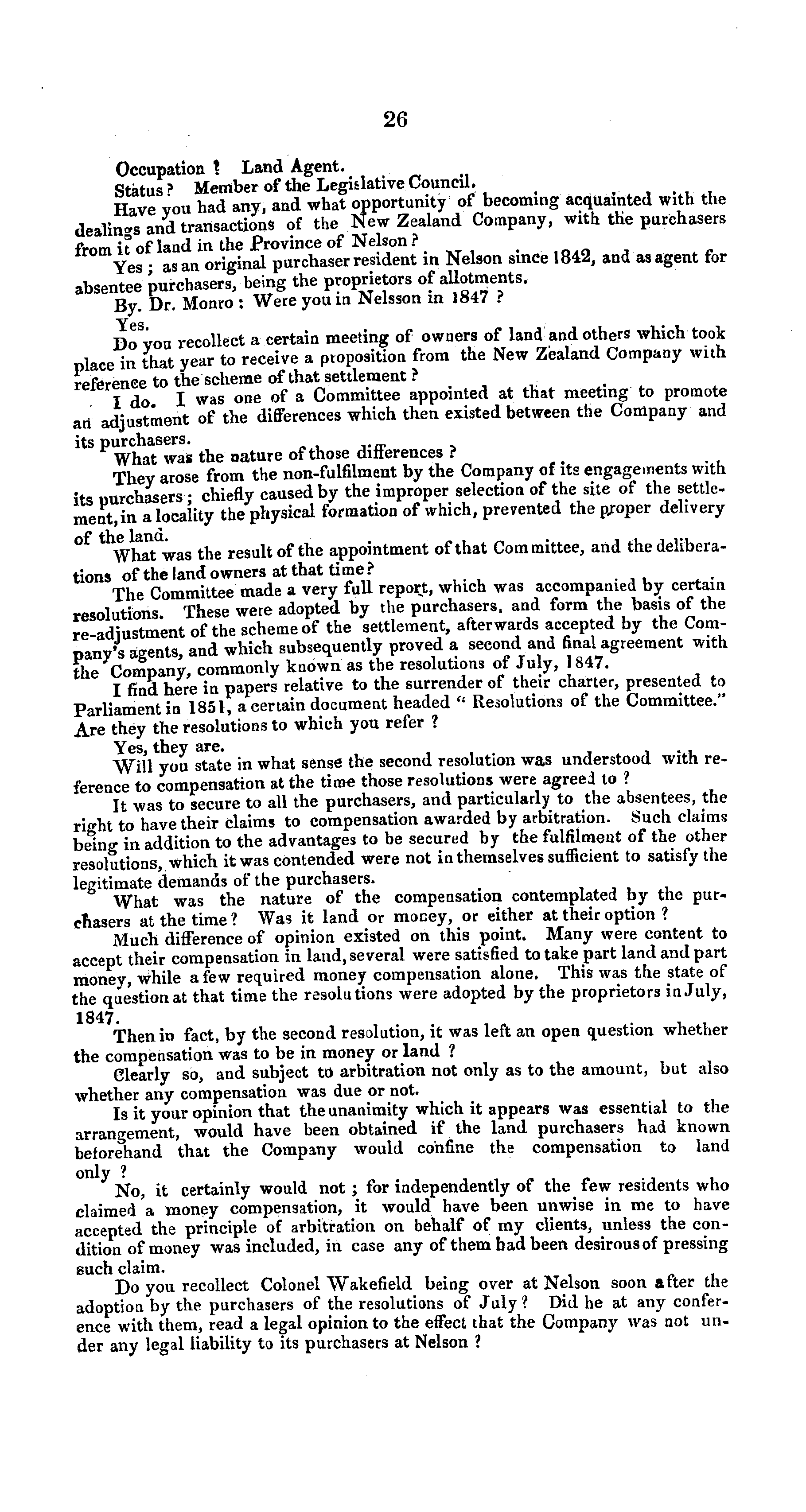 Occupation ? Land Agent. Status? Member of the Legislative Council. Have vou had any, and what opportunity of becoming acquainted with the dealin-s and transactions of the New Zealand Company, with the purchasers from it of land in the Province of Nelson ? . Yes • as an original purchaser resident in Nelson since 1842, and as agent for absentee purchasers, being the proprietors of allotments. By. Dr. Monro : Were you in Nelsson m 1847 ? Yes Do vou recollect a certain meeting of owners of land and others which took i„„„ t | lat vear to receive a ptoposition from the New Zealand Company with reference to the scheme of that settlement ? . Ido I was one of a Committee appointed at that meeting to promote an adjustment of the differences which then existed between the Company and What was the nature of those differences ? Thev arose from the non-fulfilment by the Company of its engagements with its purchasers : chiefly caused by the improper selection of the site of the settlement, in a locality the physical formation of which, prevented the proper delivery was the result of the appointment of that Committee, and the deliberations of the land owners at that time ? . . The Committee made a very full report, which was accompanied by certain resolutions. These were adopted by the purchasers, and form the basis of the re adjustment of the scheme of the settlement, afterwards accepted by the Company's agents, and which subsequently proved a second and final agreement with the Company, commonly known as the resolutions of July, 1847. I find here in papers relative to the surrender of their charter, presented to Parliament in 1851, a certain document headed " Resolutions of the Committee." Are they the resolutions to which you refer ? WilWou state in what sense the second resolution was understood with reference to compensation at the time those resolutions were agreed to ? It was to secure to all the purchasers, and particularly to the absentees, the right to have their claims to compensation awarded by arbitration. Such claims being in addition to the advantages to be secured by the fulfilment of the other resolutions, which it was contended were not in themselves sufficient to satisfy the legitimate demands of the purchasers. What was the nature of the compensation contemplated by the purchasers at the time ? Was it land or money, or either at their option ? Much difference of opinion existed on this point. Many were content to accept their compensation in land, several were satisfied to take part land and part money, while a few required money compensation alone. This was the state of the que'stionat that time the resolutions were adopted by the proprietors in July, 1847. Then in fact, by the second resolution, it was left an open question whether the compensation was to be in money or land ? Clearly so, and subject to arbitration not only as to the amount, but also whether any compensation was due or not. Is it your opinion that the unanimity which it appears was essential to the arrangement, would have been obtained if the land purchasers had known beforehand that the Company would confine the compensation to land only ? No, it certainly would not ; for independently of the few residents who claimed a money compensation, it would have been unwise in me to have accepted the principle of arbitration on behalf of my clients, unless the condition of money was included, in case any of them bad been desirousof pressing such claim. Do you recollect Colonel Wakefield being over at Nelson soon after the adoption by the purchasers of the resolutions of July ? Did he at any conference with them, read a legal opinion to the effect that the Company was not under any legal liability to its purchasers at Nelson ?