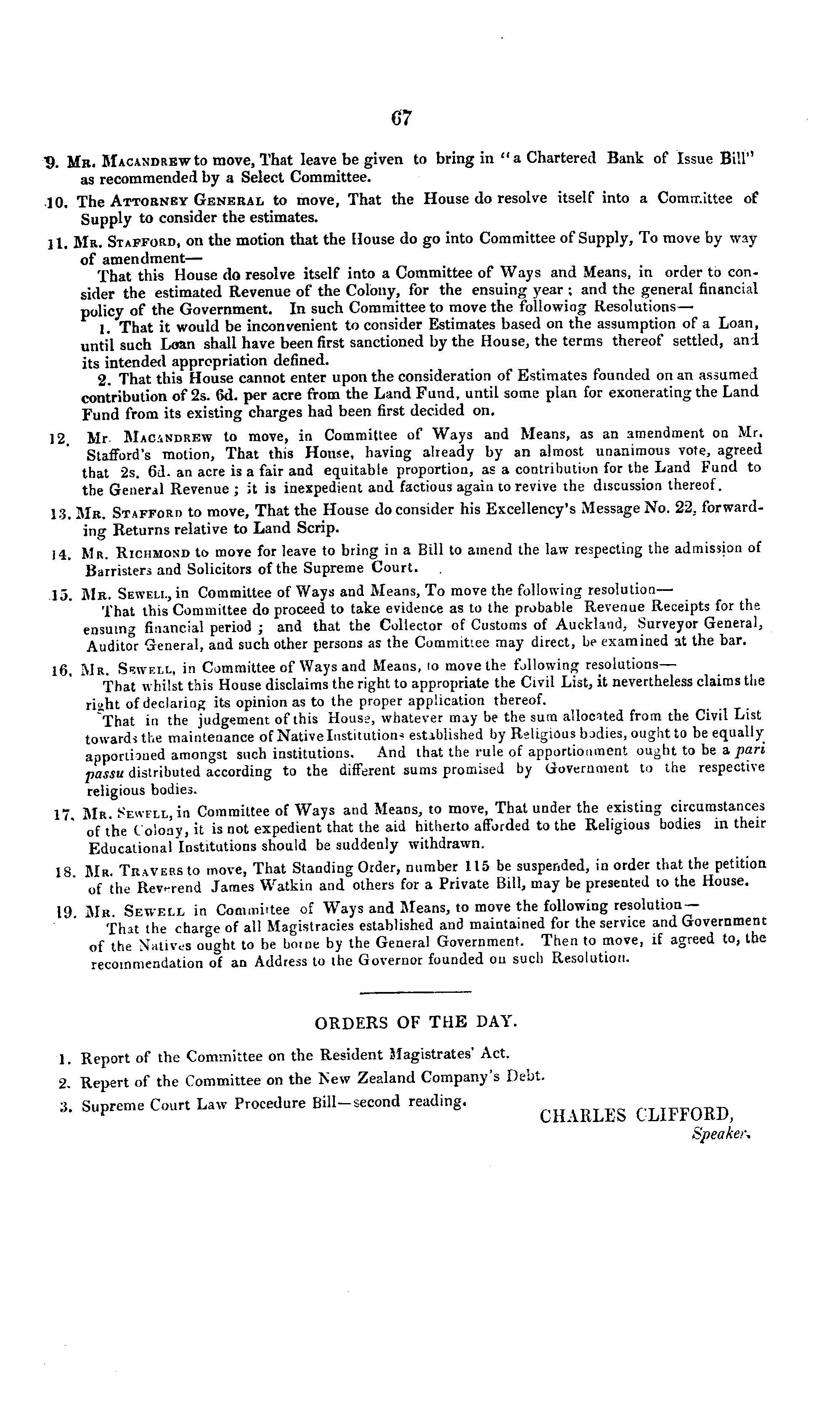 t). Mb. MACANDREwto move, That leave be given to bring in "a Chartered Bank of Issue Bill" as recommended by a Select Committee. 10. The Attorney General to move, That the House do resolve itself into a Committee of Supply to consider the estimates. 11. Mr. Stafford, on the motion that the House do go into Committee of Supply, To move by way of amendment — That this House do resolve itself into a Committee of Ways and Means, in order to consider the estimated Revenue of the Colony, for the ensuing year ; and the general financial policy of the Government. In such Committee to move the following Resolutions— 1. That it would be inconvenient to consider Estimates based on the assumption of a Loan, until such Loan shall have been first sanctioned by the House, the terms thereof settled, and its intended appropriation defined. 2. That this House cannot enter upon the consideration of Estimates founded on an assumed contribution of 2s. 6d. per acre from the Land Fund, until some plan for exonerating the Land Fund from its existing charges had been first decided on. 12 Mr Mac/iNdrew to move, in Committee of Ways and Means, as an amendment on Mr. Stafford's motion, That this House, having already by an almost unanimous vote, agreed that 2s. 6d. an acre is a fair and equitable proportion, as a contribution for the Land Fund to the General Revenue; it is inexpedient and factious again to revive the discussion thereof. 13. Mr. Stafforo to move, That the House do consider his Excellency's Message No. 22, forwarding Returns relative to Land Scrip. 14. Mr. Richmond to move for leave to bring in a Bill to amend the law respecting the admission of Barristers and Solicitors of the Supreme Court. 15. Mr. Seweli., in Committee of Ways and Means, To move the following resolution— That this Committee do proceed to take evidence as to the probable Revenue Receipts for the ensuing financial period ; and that the Collector of Customs of Auckland, Surveyor General, Auditor General, and such other persons as the Committee may direct, be examined at the bar. 16. Mr. Swell, in Committee of Ways and Means, to move the following resolutions — That whilst this House disclaims the right to appropriate the Civil List, it nevertheless claims the riaht of declaring its opinion as to the proper application thereof. That in the judgement of this House, whatever may be the sum allocated from the Civil List towards the maintenance of Native Institutions established by Religious bjdies, ought to be equally apportioned amongst such institutions. And that the rule of apportionment ought to be a pari passu distributed according to the different sums promised by Government to the respective religious bodies. 17. Mr. S'ewell, in Committee of Ways and Means, to move, That under the existing circumstances of the Colony, it is not expedient that the aid hitherto afforded to the Religious bodies in their Educational Institutions should be suddenly withdrawn. 18. Mr. Traverse move, That Standing Order, number 115 be suspended, in order that the petition of the Reverend James Watkin and others for a Private Bill, may be presented to the House. 19. Mr. Seweli. in Committee of Ways and Means, to move the following resolution — That the charge of all Magistracies established and maintained for the service and Government of the Natives ought to be borne by the General Government. Then to move, if agreed to, the recommendation of an Address to the Governor founded ou such Resolution.