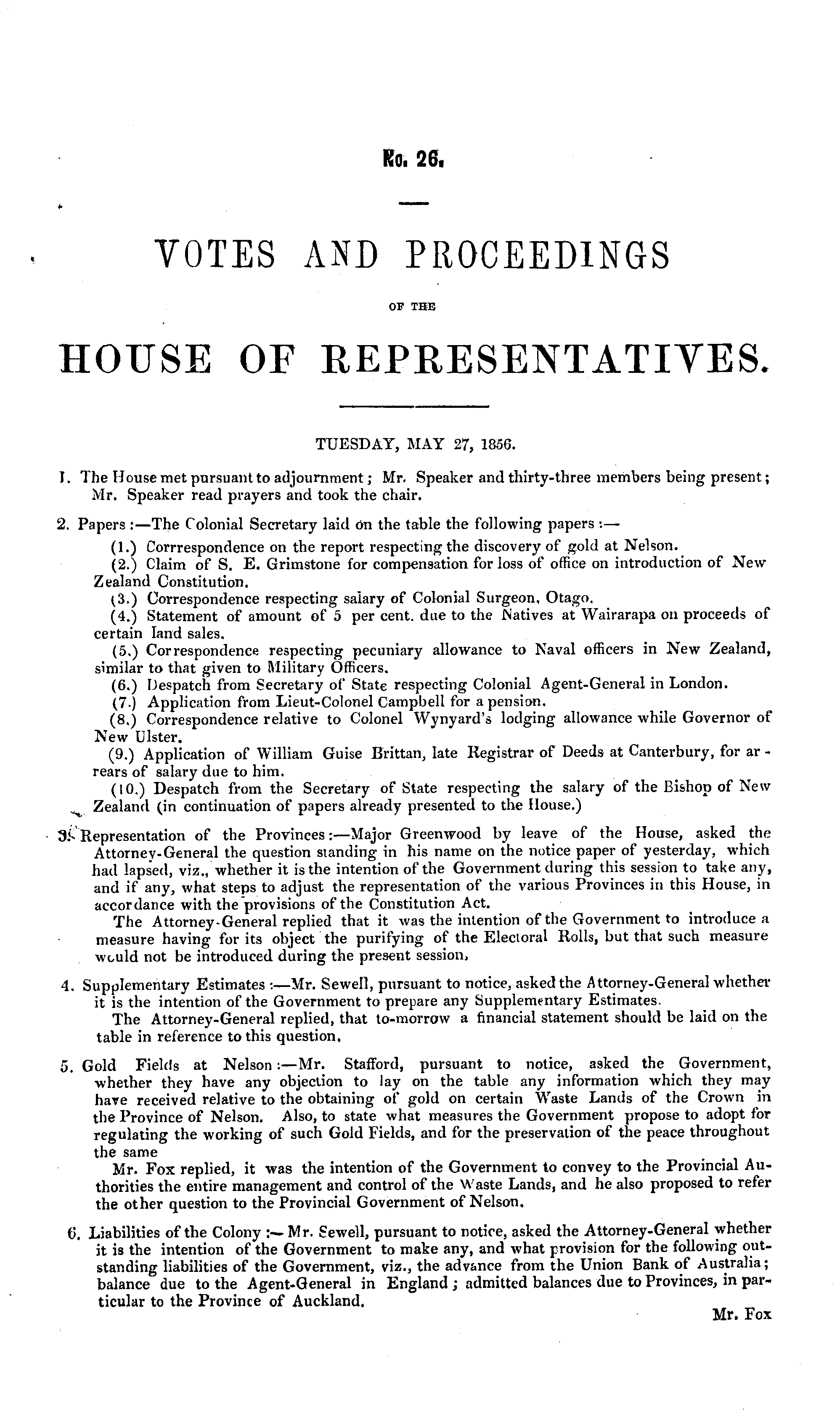 TUESDAY, MAY 27, 1856. 1. The House met pursuant to adjournment; Mr. Speaker and thirty-three members being present; Mr. Speaker read prayers and took the chair. 2. Papers : —The Colonial Secretary laid On the table the following papers :— (1.) Corrrespondence on the report respecting the discovery of gold at Nelson. (2.) Claim of S. E. Grimstone for compensation for loss of office on introduction of New Zealand Constitution. (3.) Correspondence respecting salary of Colonial Surgeon, Otago. (4.) Statement of amount of 5 per cent, due to the Natives at Wairarapa on proceeds of certain land sales. (5.) Correspondence respecting pecuniary allowance to Naval officers in New Zealand, similar to that given to Military Officers. (6.) Despatch from Secretary of State respecting Colonial Agent-General in London. (7 ) Application from Lieut-Colonel Campbell for a pension. (8.) Correspondence relative to Colonel Wynyard's lodging allowance while Governor of New Ulster. (9.) Application of William Guise Brittan, late Registrar of Deeds at Canterbury, for ar - rears of salary due to him. (10.) Despatch from the Secretary of State respecting the salary of the Bishop of New Zealand (in continuation of papers already presented to the House.) 3: Representation of the Provinces: —Major Greenwood by leave of the House, asked the Attorney-General the question standing in his name on the notice paper of yesterday, which had lapsed, viz., whether it is the intention of the Government during this session to take any, and if any, what steps to adjust the representation of the various Provinces in this House, in accordance with the provisions of the Constitution Act. The Attorney-General replied that it was the intention of the Government to introduce a measure having for its object the purifying of the Electoral Rolls, but that such measure would not be introduced during the present session, 4. Supplementary Estimates :—Mr. Sewell, pursuant to notice, asked the Attorney-General whether it is the intention of the Government to prepare any Supplementary Estimates. The Attorney-General replied, that to-morrow a financial statement should be laid on the table in reference to this question, 5. Gold Fields at Nelson: —Mr. Stafford, pursuant to notice, asked the Government, whether they have any objection to lay on the table any information which they may have received relative to the obtaining of gold on certain Waste Lands of the Crown in the Province of Nelson. Also, to state what measures the Government propose to adopt for regulating the working of such Gold Fields, and for the preservation of the peace throughout the same Mr. Fox replied, it was the intention of the Government to convey to the Provincial Authorities the entire management and control of the Waste Lands, and he also proposed to refer the other question to the Provincial Government of Nelson. (j. Liabilities of the Colony :— Mr. Sewell, pursuant to notice, asked the Attorney-General whether it is the intention of the Government to make any, and what provision for the following outstanding liabilities of the Government, viz., the advance from the Union Bank of Australia; balance due to the Agent-General in England; admitted balances due to Provinces, in particular to the Province of Auckland. Mr. Fox