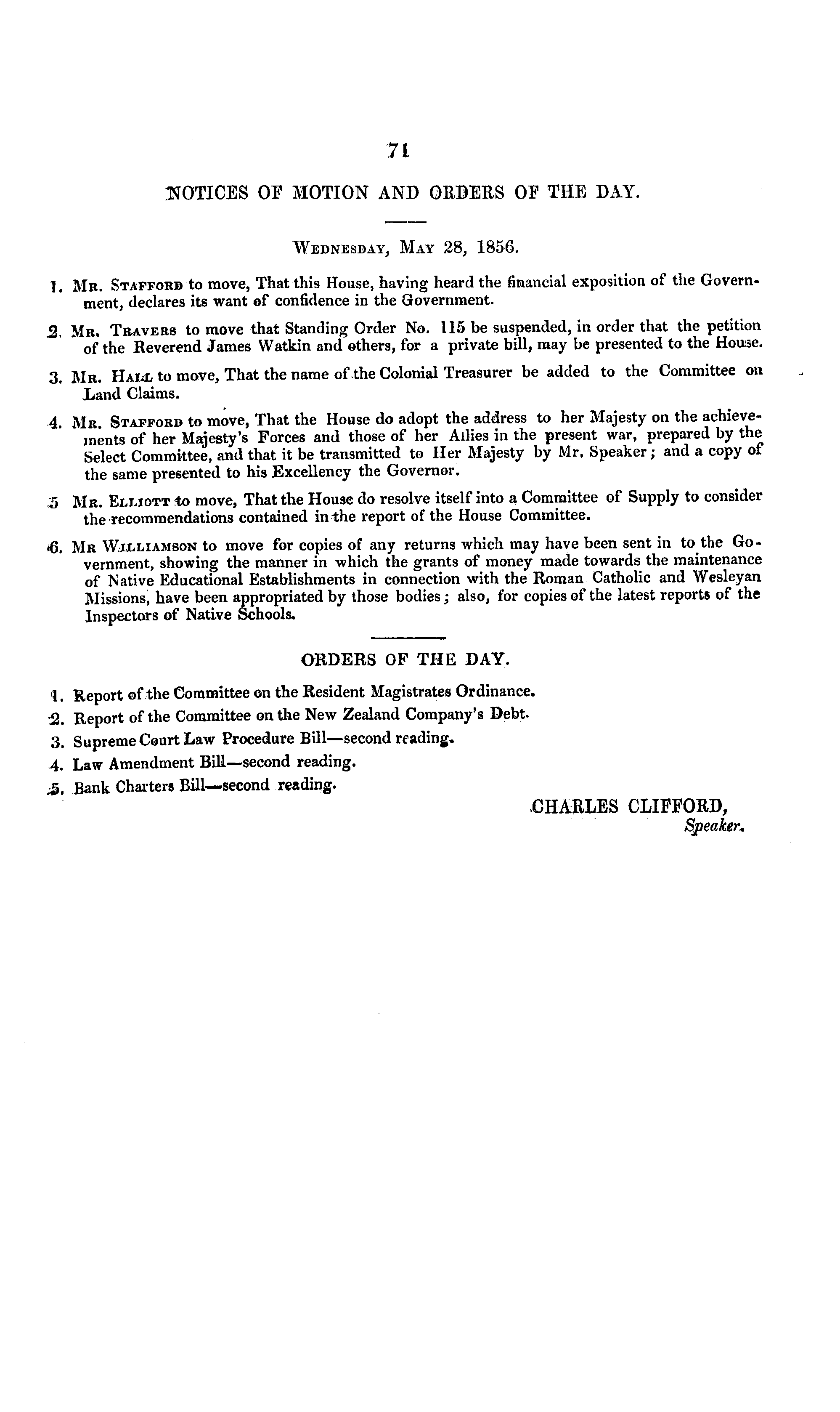NOTICES OF MOTION AND ORDERS OF THE DAY. Wednesday, May 28, 1856. 1. Mr. Stafford to move, That this House, having heard the financial exposition of the Government, declares its want of confidence in the Government. 2. Mr. Travers to move that Standing Order No. 115 be suspended, in order that the petition of the Reverend James Watkin and others, for a private bill, may be presented to the House. 3. Mr. Hall to move, That the name of the Colonial Treasurer be added to the Committee on Land Claims. 4. Mr. Stafford to move, That the House do adopt the address to her Majesty on the achievements of her Majesty's Forces and those of her Allies in the present war, prepared by the Select Committee, and that it be transmitted to Her Majesty by Mr. Speaker; and a copy of the same presented to his Excellency the Governor. 5 Mr. Elliott to move, That the House do resolve itself into a Committee of Supply to consider the recommendations contained in the report of the House Committee. <6. Mr Williamson to move for copies of any returns which may have been sent in to the Government, showing the manner in which the grants of money made towards the maintenance of Native Educational Establishments in connection with the Roman Catholic and Wesleyan Missions, have been appropriated by those bodies; also, for copies of the latest reports of the Inspectors of Native Schools.