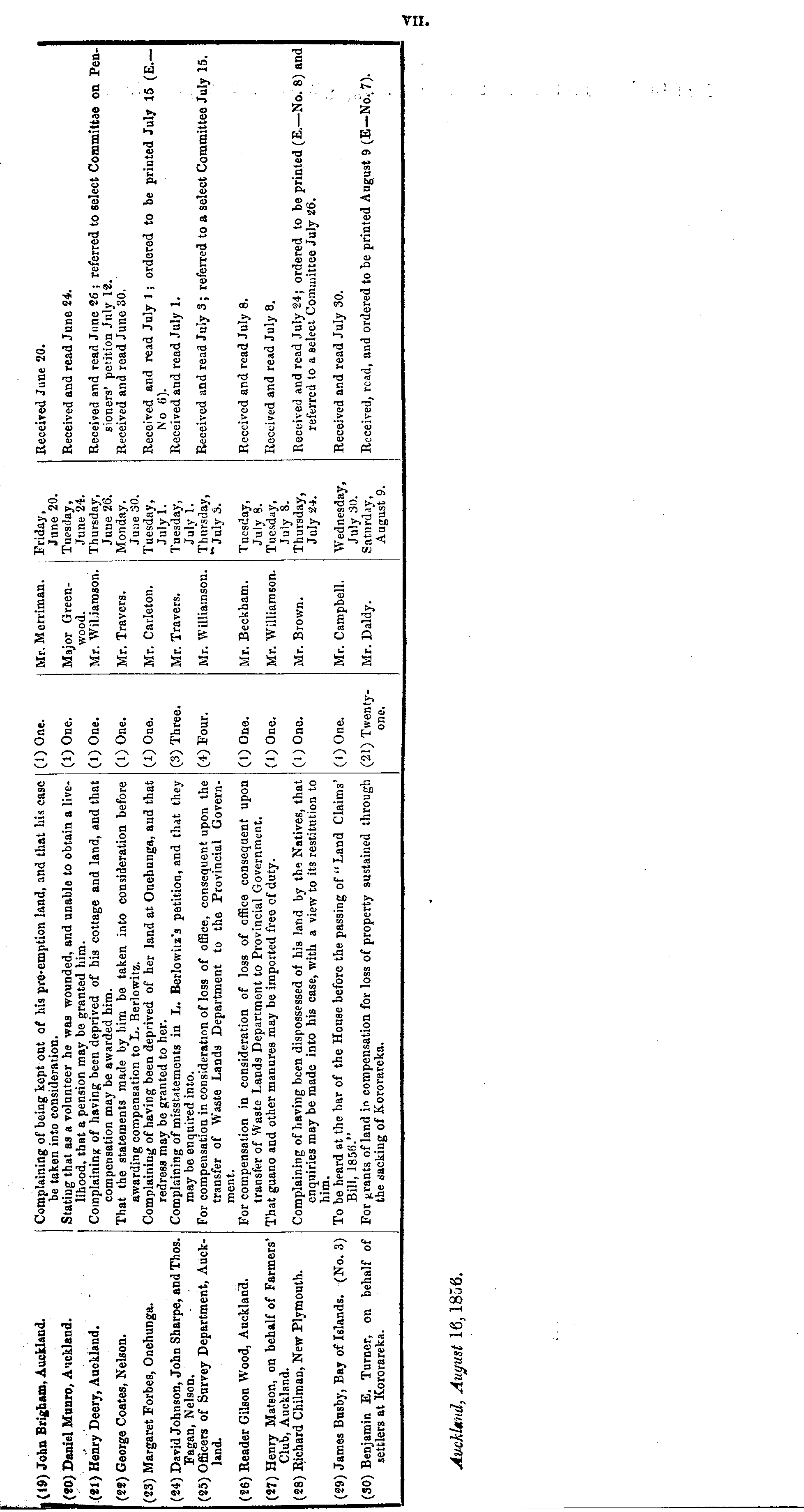 I (19) John Brigham, Auckland. I Complaining of being kept out of his pre-emption land, and tlmt his case (1) One. Mr. Mcrriman. Friday, Received Jime 20. be taken into consideration. June 20. (20) Daniel Munro, Auckland. Stating that as a volunteer he was wounded, and unable to obtain a live- (1) One. Major Green- Tuesday, Received and read June 24. lihood, that a pension may be granted him. wood. I June 24. (21) Henry Deery, Auckland, Complaining of having been deprived of his cottage and land, and that (1) One. Mr. Wil.iamson. : Thursday, Received and read June 26 ; referred to select Committee on Pencompensation may be awarded him. June 26. sioners' petition July 12. (22) George Coates, Nelson. That the statements made by him be taken into consideration before (1) One. Mr. Travers. Monday, Received and read June 30. awarding compensation to L. Berlowitz. June 30. (23) Margaret Forbes, Onehunga. Complaining of having been deprived of her land at. Onehunga, and that (1) One. Mr. Carleton. Tuesday, Received and read July 1 ; ordered to be printed July 15 (E. — redress may be granted to her. Julyl. No 6). (24) David Johnson, John Sharpe, and Thos. Complaining of misstatements in L. Berlowitz's petition, and that they (3) Three. Mr. Travers. Tuesday, Received and read July 1. Fagan, Nelson. may be enquired into. Julyl. (2.5) Officers of Survey Department, Auck- For compensation in consideration of loss of office, consequent upon the (4) Four. Mr. Williamson. Thursday, Received and read July 3 ; referred to a select Committee July 15. land. transfer of Waste Lands Department to the Provincial Govern- 3. ment. (26) Reader Gilson Wood, Auckland. For compensation in consideration of loss of office consequent upon (1) One. Mr. Beckham. Tuesday, Received and read July 8. transfer of Waste Lands Department to Provincial Government. July 8. (27) Henry Matson, on behalf of Farmers' That guano and other manures may be imported free of duty. (1) One. Mr. Williamson. Tuesday, Received and read July 8. Club, Auckland. July 8. (28) Richard Chilman, New Plymouth. Complaining of having been dispossessed of his land by the Natives, that (1) One. Mr. Brown. Thursday, Received and read July 24; ordered to be printed (E. —No. 8) and enquiries may be made into his case, with a view to its restitution to July 24. referred to a select Committee July 26. him. (29) James Busby, Bay of Islands. (No. 3) To be heard at the bar of the House before the passing of " Land Claims' (l) One. Mr. Campbell. Wednesday, Received and read July 30. Bill, 185S." July 30. (30) Benjamin E. Turner, on behalf of For grants of land in compensation for loss of property sustained through (21) Twenty- Mr. Daldy. Saturday, Received, read, and ordered to be printed August 9 (E— No. 7). settlers at Kororareka. the sacking of Kororareka. one. j August 9. '