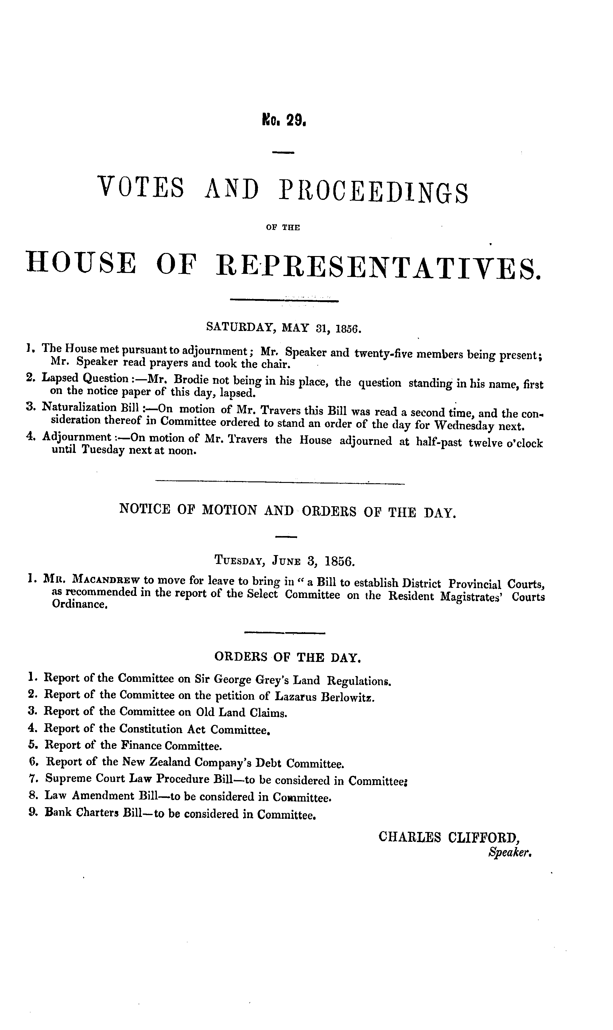 ORDERS OF THE DAY. 1. Report of the Committee on Sir George Grey's Land Regulations. 2. Report of the Committee on the petition of Lazarus Berlowitz. 3. Report of the Committee on Old Land Claims. 4. Report of the Constitution Act Committee. 5. Report of the Finance Committee. 6. Report of the New Zealand Company's Debt Committee. 7. Supreme Court Law Procedure Bill—to be considered in Committee. 1 8. Law Amendment Bill—to be considered in Committee. 9. Bank Charters Bill—to be considered in Committee. CHARLES CLIFFORD, Speaker.