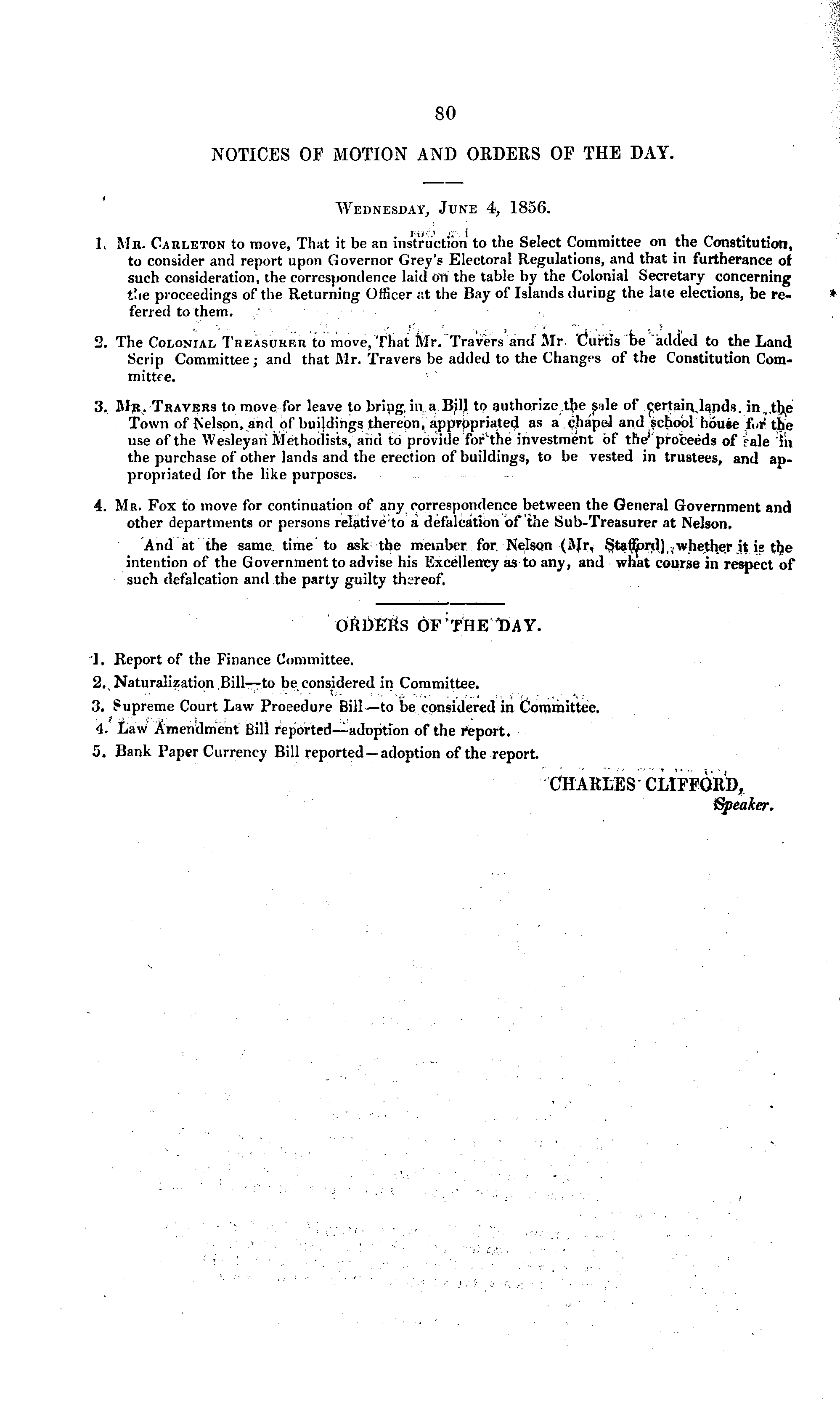 NOTICES OF MOTION AND ORDERS OF THE DAY. Wednesday, June 4, 1856. 1. Mn. Carleton to move, That it be an instruction to the Select Committee on the Constitution, to consider and report upon Governor Grey's Electoral Regulations, and that in furtherance of such consideration, the correspondence laid on the table by the Colonial Secretary concerning the proceedings of the Returning Officer at the Bay of Islands during the late elections, be referred to them. . . • , V - . it's 2. The Colonial Treasurer to move, That Mr. Travers and Mr Curtis be added to the Land Scrip Committee; and that Mr. Travers be added to the Changfs of the Constitution Committee. 3. Mr. Travers to move for leave to bring, in a Bill to authorize the pie of certain lands in the Town of Kelson, and of buildings thereon, appropriated as a chapel and school house fur the use of the Wesleyari Methodists, and to provide for'the investment of the' proceeds of rale 'in the purchase of other lands and the erection of buildings, to be vested in trustees, and appropriated for the like purposes. 4. Mr. Fox to move for continuation of any correspondence between the General Government and other departments or persons relative to a defalcation of the Sub-Treasurer at Nelson. And at the same time to ask the member for Nelson (Mr. Stafford) whether it is the intention of the Government to advise his Excellency as to any, and what course in respect of such defalcation and the party guilty thereof.