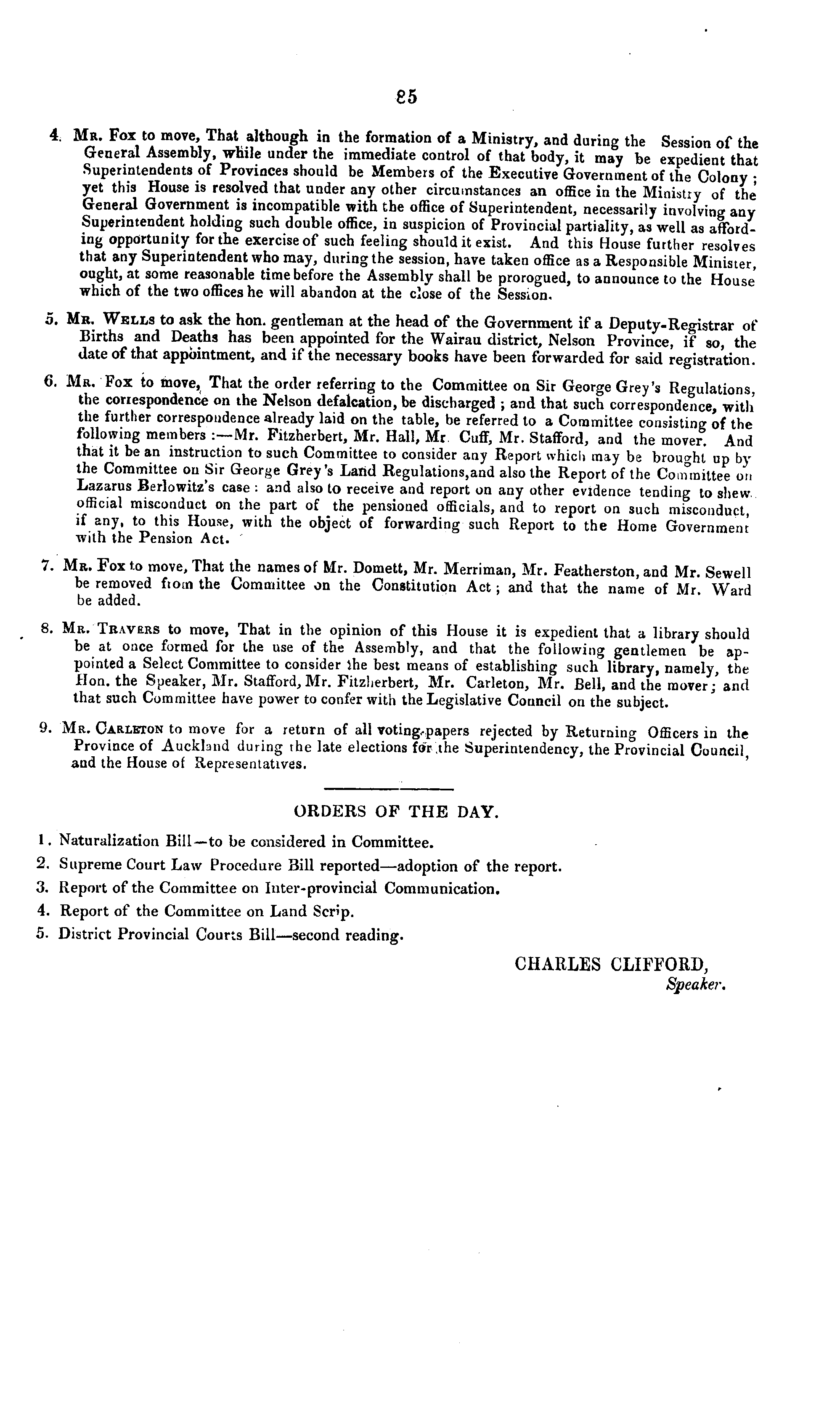 4 Mr. Fox to move, That although in the formation of a Ministry, and during the Session of the General Assembly, while under the immediate control of that body, it may be expedient that Superintendents of Provinces should be Members of the Executive Government of the Colony • yet this House is resolved that under any other circumstances an office in the Ministry of the General Government is incompatible with the office of Superintendent, necessarily involving any Superintendent holding such double office, in suspicion of Provincial partiality, as well as affording opportunity for the exercise of such feeling should it exist. And this House further resolves that any Superintendent who may, during the session, have taken office as a Responsible Minister, ought, at some reasonable time before the Assembly shall be prorogued, to announce to the House which of the two offices he will abandon at the close of the Session. 5. Mb. Wells to ask the hon. gentleman at the head of the Government if a Deputy-Registrar of Births and Deaths has been appointed for the Wairau district, Nelson Province, if so, the date of that appointment, and if the necessary books have been forwarded for said registration. 6. Mr. Fox to move, That the order referring to the Committee on Sir George Grey's Regulations, the correspondence on the Nelson defalcation, be discharged ; and that such correspondence, with' the further correspondence already laid on the table, be referred to a Committee consisting of the following members Mr. Fitzherbert, Mr. Hall, Mr Cuff, Mr. Stafford, and the mover. And that it be an instruction to such Committee to consider any Report which may be brought up by the Committee on Sir George Grey's Land Regulations,and also the Report of the Committee on Lazarus Berlowitz's case : and also to receive and report on any other evidence tending to shew official misconduct on the part of the pensioned officials, and to report on such misconduct, if any, to this House, with the object of forwarding such Report to the Home Government with the Pension Act. 7. Mr. I 1 ox to move, That the names of Mr. Domett, Mr. Merriman, Mr. Featherston, and Mr. Sewell be removed ftom the Committee on the Constitution Act ; and that the name of Mr. Ward be added. 8. Mr. Travers to move, That in the opinion of this House it is expedient that a library should be at once formed for the use of the Assembly, and that the following gentlemen be appointed a Select Committee to consider Ihe best means of establishing such library, namely, the Hon. the Speaker, Mr. Stafford, Mr. Fitzherbert, Mr. Carleton, Mr. Bell, and the mover/and that such Committee have power to confer with the Legislative Council on the subject. 9. Mr. Carleton to move for a return of all voting.papers rejected by Returning Officers in the Province of Auckland during the late elections for the Superintendency, the Provincial Council, aud the House of Representatives.