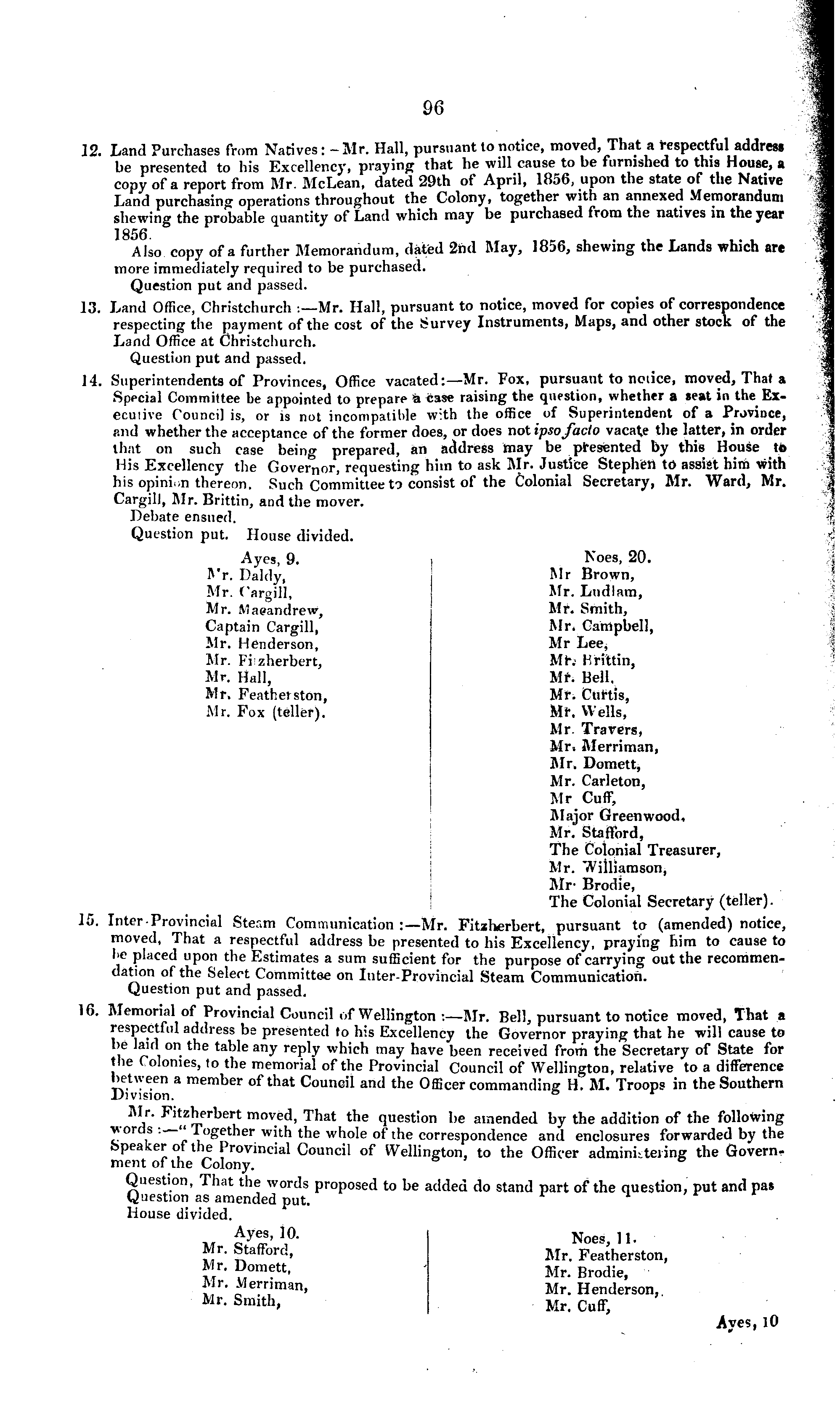 12. Land Purchases from Natives: — Mr. Hall, pursuant to notice, moved, Tli.it a respectful address be presented to his Excellency, praying that he will cause to be furnished to this House, a copy of a report from Mr. McLean, dated 29th of April, 1856, upon the state of the Native Land purchasing operations throughout the Colony, together with an annexed Memorandum shewing the probable quantity of Land which may be purchased from the natives in the year Also copy of a further Memorandum, dated 2nd May, 1856, shewing the Lands which are more immediately required to be purchased. Question put and passed. 13. Land Office, Christchurch Mr. Hall, pursuant to notice, moved for copies of correspondence respecting the payment of the cost of the Survey Instruments, Maps, and other stock of the Land Office at Christchurch. Question put and passed. 14. Superintendents of Provinces, Office vacated:—Mr. Fox, pursuant to notice, moved, That a Special Committee be appointed to prepare a case raising the question, whether a seat in the Executive Council is, or is not incompatible with the office of Superintendent of a Province, and whether the acceptance of the former does, or does not ipso facto vacate the latter, in order that on such case being prepared, an address may be presented by this House to His Excellency the Governor, requesting him to ask Mr. Justice Stephen to assist him with his opinion thereon. Such Committee to consist of the Colonial Secretary, Mr. Ward, Mr. Cargill, Mr. Brittin, and the mover. Debate ensued. Question put. House divided. Ayes, 9. i Noes, 20. Mr. Daldy, Mr Brown, Mr. Cargill, Mr. Lndlam, Mr. Maeandrew, Mr. Smith, Captain Cargill, Mr. Campbell, Mr. Henderson, Mr Lee, Mr. Fiizherbert, Mt\ Hrittin, Mr. Hall, Mf. Bell. Mr. Feathetston, Mr. Ctiftis, Mr. Fox (teller). Ml". Wells, Mr. Trarers, Mr. Merriman, Mr. Domett, Mr. Carleton, Mr Cuff, Major Greenwood, Mr. Stafford, The Colonial Treasurer, Mr. Williamson, Mr- Brodie, The Colonial Secretary (teller). 15. Inter Provincial Steam Communication :—Mr. Fitzherbert, pursuant to (amended) notice, moved, That a respectful address be presented to his Excellency, praying him to cause to I'e placed upon the Estimates a sum sufficient for the purpose of carrying out the recommendation of the Select Committee on Inter-Provincial Steam Communication. Question put and passed. 16. Memorial of Provincial Council of Wellington :—Mr. Bell, pursuant to notice moved, That a lespectful address be presented to his Excellency the Governor praying that he will cause to be laid on the table any reply which may have been received from the Secretary of State for the Colonies, to the memorial of the Provincial Council of Wellington, relative to a difference a mem her of that Council and the Officer commanding H. M. Troops in the Southern Division. Mr. Fitzherbert moved, That the question be amended by the addition of the following wou s . Together with the whole of the correspondence and enclosures forwarded by the Speaker of the Provincial Council of Wellington to the Officer administering the Government of ihe Colony. Question, That the words proposed to be added do stand part of the question, put and pas Question as amended put. House divided. ™ o y t S,l °- Noes, 11. Mr. Stafford, M r . Featherston, Mr. Domett, - Mr. Brodie, Mr. Mernman, Mr. Henderson, Mr - Smith > Mr. Cuff, Aves, 10