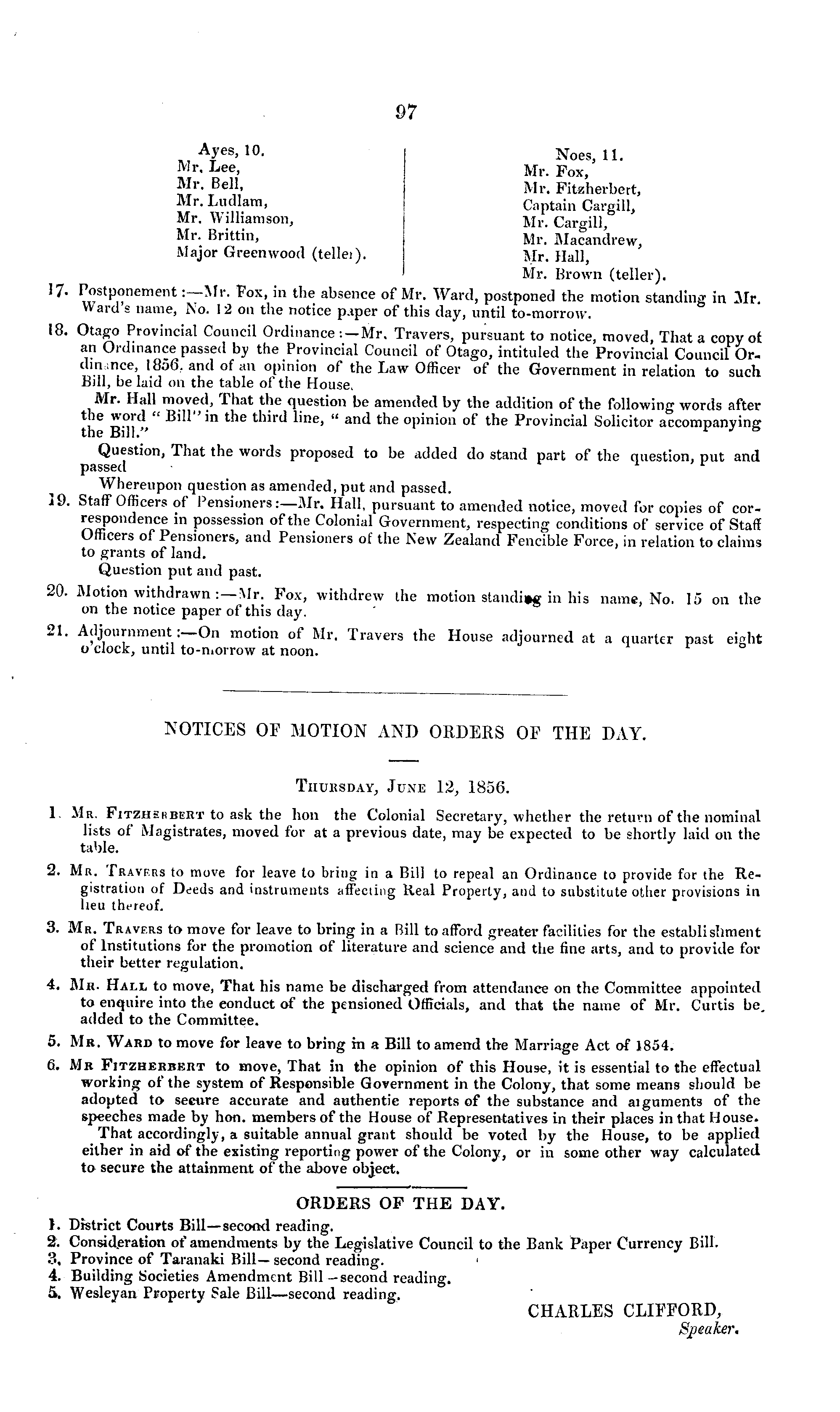 NOTICES OF MOTION ANI) ORDERS OF THE DAY. Thursday, June 12, 1856. 1. Mr. Fitzherbert to ask the lion the Colonial Secretary, whether the return of the nominal lists of Magistrates, moved for at a previous date, may be expected to be shortly laid on the table. 2. Mr. I ravf.rs to move for leave to bring in a Bill to repeal an Ordinance to provide for the Registration of Deeds and instruments affecting Real Property, and to substitute other provisions in lieu thereof. 3. Mr. f ravers to move for leave to bring in a Bill to afford greater facilities for the establishment of Institutions for the promotion of literature and science and the fine arts, and to provide for their better regulation. 4. Mr. llai.l to move, That his name be discharged from attendance on the Committee appointed to enquire into the eonduct of the pensioned Officials, and that the name of Mr. Curtis be, added to the Committee. 5. Mr. Ward to move for leave to bring in a Bill to amend the Marriage Act of 1854. 6. Mr Fitzherbert to move, That in the opinion of this House, it is essential to the effectual working of the system of Responsible Government in the Colony, that some means should be adopted to secure accurate and authentic reports of the substance and aiguments of the speeches made by hon. members of the House of Representatives in their places in that House. That accordingly, a suitable annual grant should be voted by the House, to be applied either in aid of the existing reporting power of the Colony, or in some other way calculated to secure the attainment of the above object.