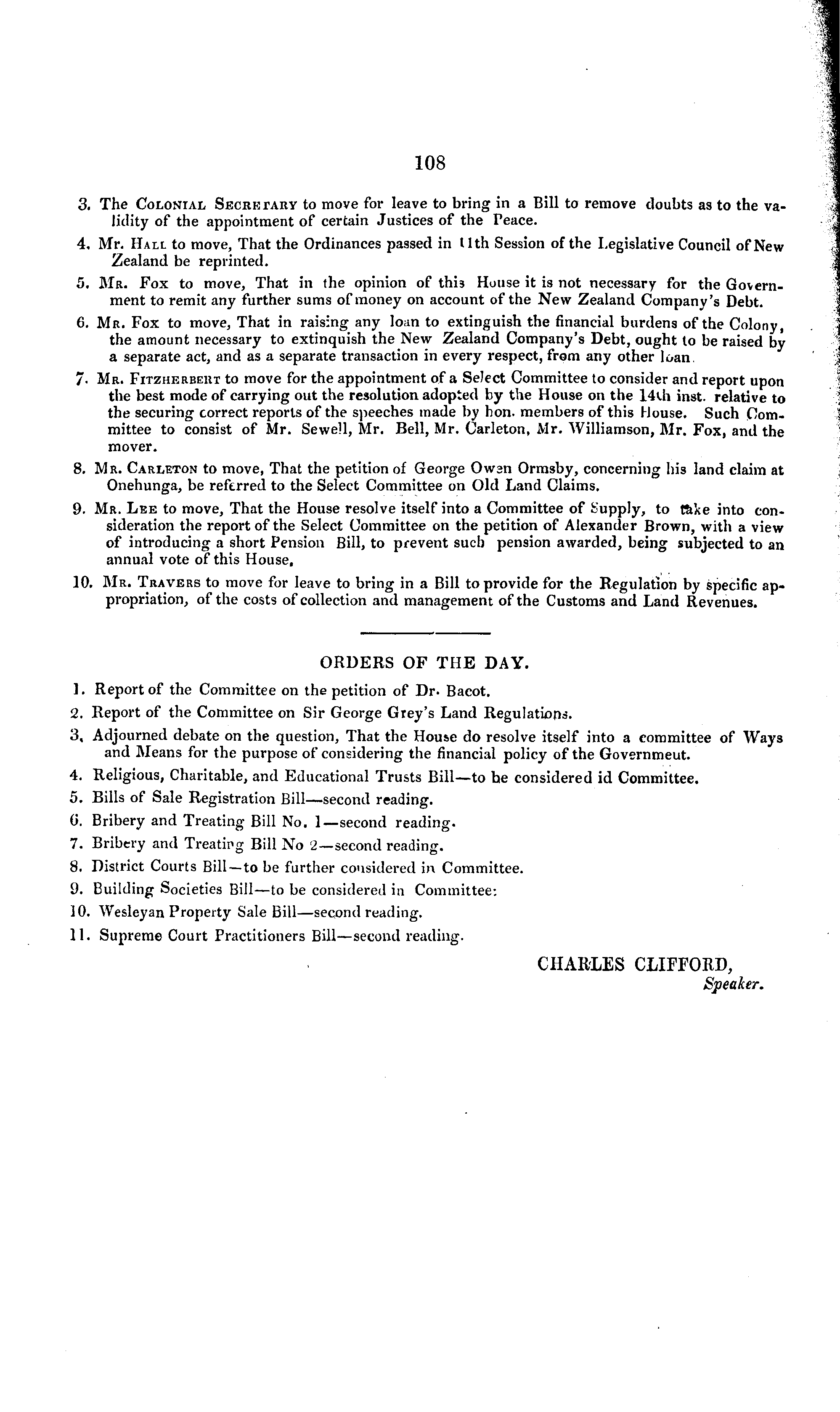 3. The Colonial Secretary to move for leave to bring in a Bill to remove doubts as to the validity of the appointment of certain Justices of the Peace. 4. Mr. Hall to move, That the Ordinances passed in 11th Session of the Legislative Council of New Zealand be reprinted. 5. Mr. Fox to move, That in the opinion of thi3 House it is not necessary for the Government to remit any further sums of money on account of the New Zealand Company's Debt. 6. Mb. Fox to move, That in raising any loan to extinguish the financial burdens of the Colony, the amount necessary to extinquish the New Zealand Company's Debt, ought to be raised by a separate act, and as a separate transaction in every respect, from any other loan /• Mr. Fitzherbert to move for the appointment of a Select Committee to consider and report upon the best mode of carrying out the resolution adopted by the House on the l4Ui inst. relative to the securing correct reports of the speeches made by hon. members of this Mouse. Such Committee to consist of Mr. Sewell, Mr. Bell, Mr. Carleton, Mr. Williamson, Mr. Fox, and the mover. 8. Mr. Carleton to move, That the petition of George Owan Ormsby, concerning his land claim at Onehunga, be referred to the Select Committee on Old Land Claims. 9. Mr. Lee to move, That the House resolve itself into a Committee of Supply, to t&ke into consideration the report of the Select Committee on the petition of Alexander Brown, with a view of introducing a short Pension Bill, to prevent sueb pension awarded, being subjected to an annual vote of this House, 10. Mr. Travers to move for leave to bring in a Bill to provide for the Regulation by specific appropriation, of the costs of collection and management of the Customs and Land Revenues.
