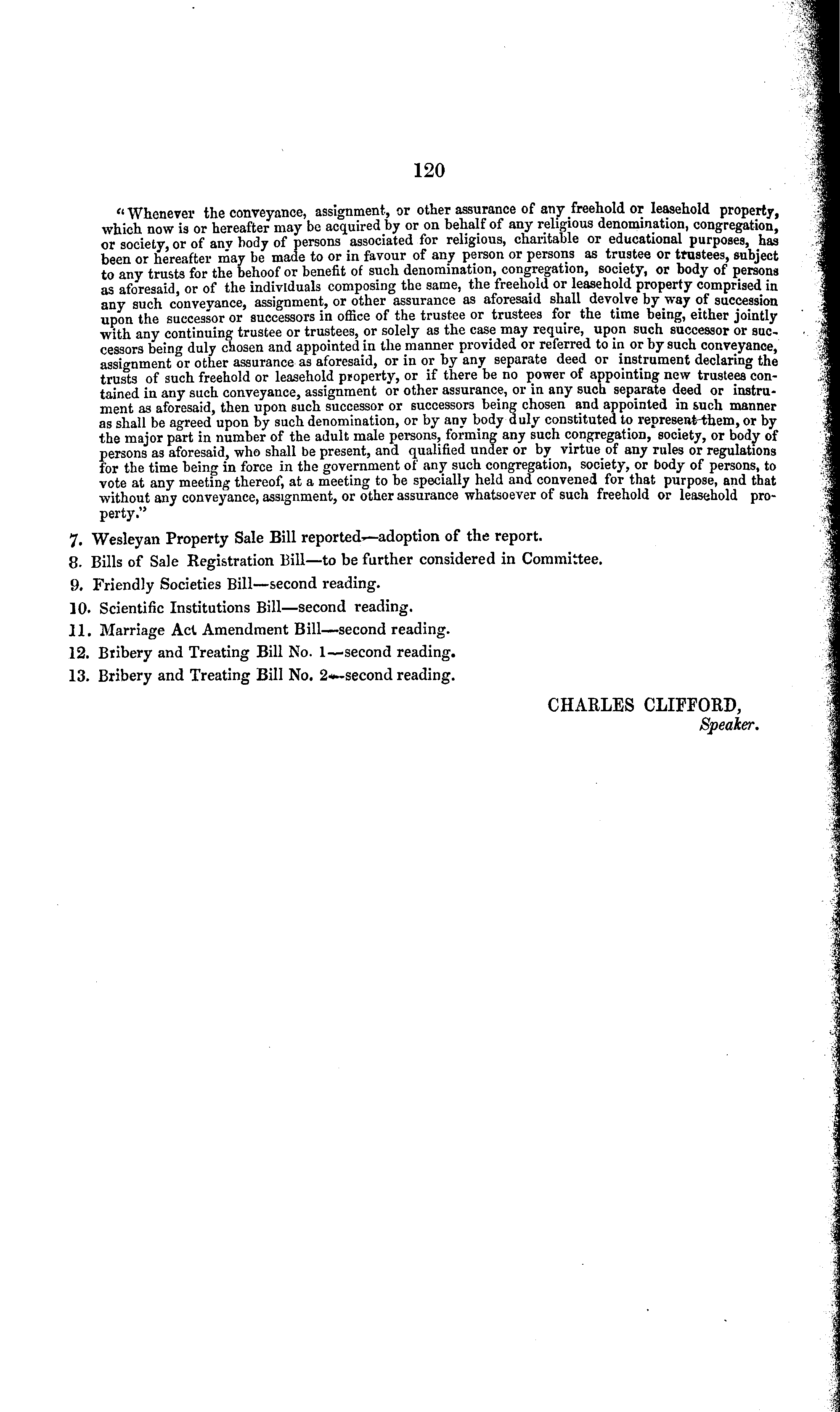 "Whenever the conveyance, assignment, or other assurance of any freehold or leasehold property, which now is or hereafter may be acquired by or on behalf of any religious denomination, congregation, or society or of anv body of persons associated for religious, charitable or educational purposes, has been or hereafter may be made to or in favour of any person or persons as trustee or trustees, subject to any trusts for the behoof or benefit of such denomination, congregation, society, or body of persons as aforesaid or of the individuals composing the same, the freehold or leasehold property comprised in any such conveyance, assignment, or other assurance as aforesaid shall devolve by way of succession U pon the successor or successors in office of the trustee or trustees for the time being, either jointly with any continuing trustee or trustees, or solely as the case may require, upon such successor or successors bein" duly chosen and appointed in the manner provided or referred to in or by such conveyance, assignment or other assurance as aforesaid, or in or by any separate deed or instrument declaring the trusts of such freehold or leasehold property, or if there be no power of appointing new trustees contained in any such conveyance, assignment or other assurance, or in any such separate deed or instrument as aforesaid, then upon such successor or successors being chosen and appointed in such manner as shall be agreed upon by such denomination, or by any body duly constituted to represent them, or by the major part in number of the adult male persons, forming any such congregation, society, or body of persons as aforesaid, who shall be present, and qualified under or by virtue of any rules or regulations for the time being in force in the government of any such congregation, society, or body of persons, to vote at any meeting thereof, at a meeting to be specially held and convened for that purpose, and that without any conveyance, assignment, or other assurance whatsoever of such freehold or leasehold property." 7. Wesleyan Property Sale Bill reported—adoption of the report. 8. Bills of Sale Registration Bill—to be further considered in Committee. 9. Friendly Societies Bill—second reading. 10. Scientific Institutions Bill—second reading. 11. Marriage Act Amendment Bill—second reading. 12. Bribery and Treating Bill No. I—second reading. 13. Bribery and Treating Bill No. 2—second reading. CHARLES CLIFFORD, Speaker.