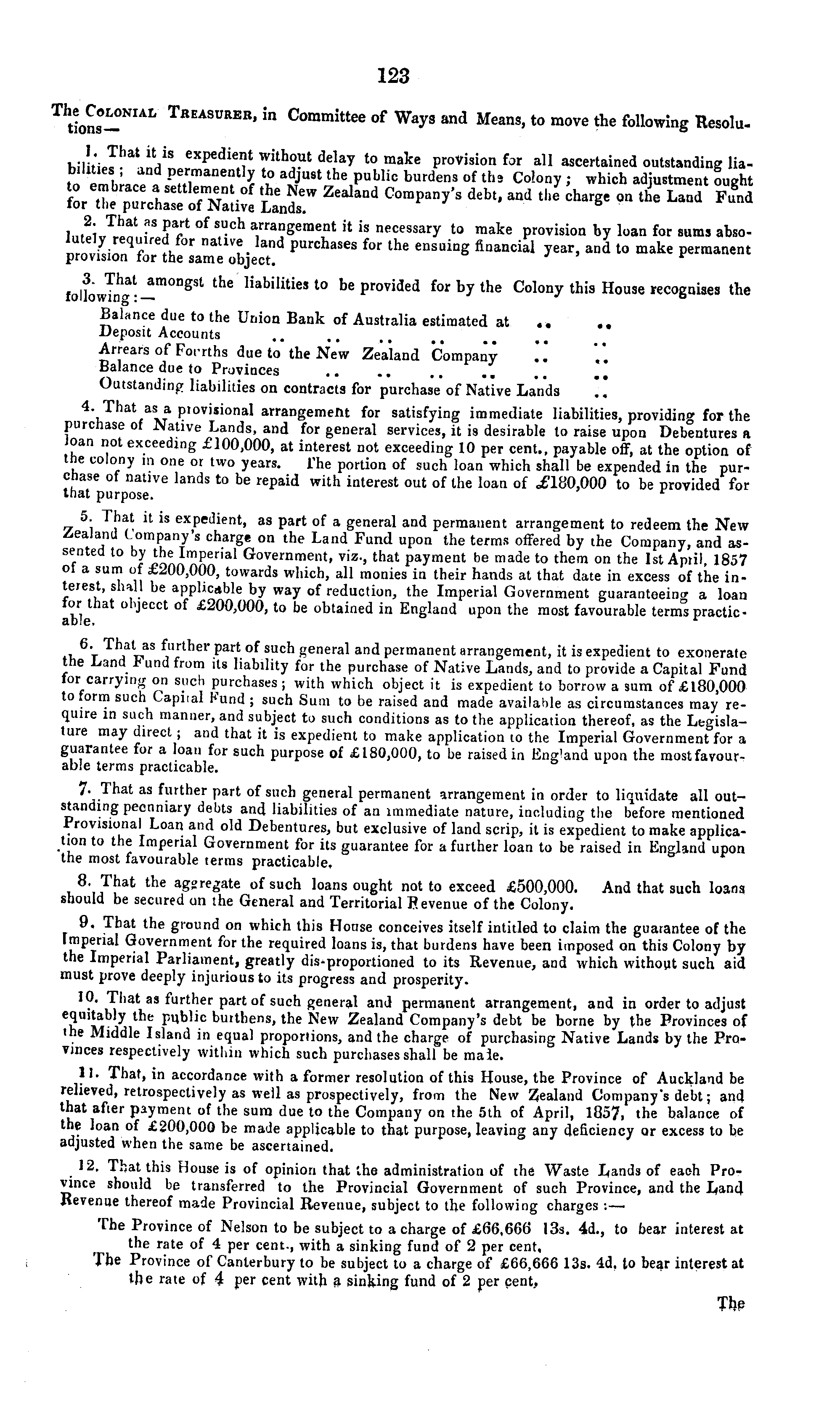 Th tions°- NIAL TKEASURER ' in Committee of Ways and Means, to move the following ResoluMl!t'; c That ll r| lS expedlel ? t without delay to make provision for all ascertained outstanding liabilities , and permanently to adjust the public burdens of ths Colony; which adjustment oueht Zea, ™ d - 1 ■ J L » d ® That • S P art of s " ch arrangement it is necessary to make provision by loan for sums absoimli i f naUV f • d P urchases for ensuing financial year, and to make permanent provision lor the same object. amongst the liabilities to be provided for by the Colony this House recognises the Balance due to the Union Bank of Australia estimated at . . .. Deposit Accounts Arrears of Forrths due to the New Zealand Company Balance due to Provinces Outstanding liabilities on contracts for purchase of Native Lands 4. That as a ptovisional arrangement for satisfying immediate liabilities, providing for the purchase of Native Lands, and for general services, it is desirable to raise upon Debentures a oan not exceeding £100,000, at interest not exceeding 10 per cent., payable off, at the option of t e colony in one or two years. The portion of such loan which shall be expended in the purchase of native lands to be repaid with interest out of the loan of o£lßo,ooo to be provided for that purpose. r 5. That it is expedient, as part of a general and permanent arrangement to redeem the New Zealand ( ompany's charge on the Land Fund upon the terms offered by the Company, and assented to by the Imperial Government, viz., that payment be made to them on the Ist April, 1857 of a sum of £200,000, towards which, all monies in their hands at that date in excess of the interest, shall be applicable by way of reduction, the Imperial Government guaranteeing a loan able ° CCt to be obtained in England upon the most favourable terms practic- , further part of such general and permanent arrangement, it is expedient to exonerate e and 1< und from its liability for the purchase of Native Lands, and to provide a Capital Fund lor carrying on such purchases ; with which object it is expedient to borrow a sum of £180,000 to form such Capital Fund ; such Sum to be raised and made available as circumstances tnay require in such manner, and subject to such conditions as to the application thereof, as the Legislature may direct ; and that it is expedient to make application to the Imperial Government for a guarantee for a loan for such purpose of £180,000, to be raised in Eng'and upon the most favourable terms practicable. /. That as further part of such general permanent arrangement in order to liquidate all outstanding pecuniary debts and liabilities of an immediate nature, including the before mentioned Provisional Loan and old Debentures, but exclusive of land scrip, it is expedient to make application to the Imperial Government for its guarantee for a further loan to be raised in England upon the most favourable terms practicable, 8. That the agsregate of such loans ought not to exceed £500,000. And that such loans should be secured on the General and Territorial Bevenue of the Colony. 9. That the ground on which this House conceives itself intitled to claim the guarantee of the Imperial Government for the required loans is, that burdens have been imposed on this Colony by the Imperial Parliament, greatly dis-proportioned to its Revenue, and which without such aid must prove deeply injurious to its progress and prosperity. 10. That as further part of such general and permanent arrangement, and in order to adjust equitably the public burthens, the New Zealand Company's debt be borne by the Provinces of i e Middle Island in equal proportions, and the charge of purchasing Native Lands by the Provinces respectively within which such purchases shall be male. 11. That, in accordance with a former resolution of this House, the Province of Auckland be relieved, retrospectively as well as prospectively, from the New Zealand Company's debt; and that after payment of the sum due to the Company on the sth of April, 1857> the balance of the loan of £200,000 be made applicable to that purpose, leaving any deficiency or excess to be adjusted when the same be ascertained. 12. That this House is of opinion that the administration of the Waste Lands of each Province should be transferred to the Provincial Government of such Province, and the Land Revenue thereof made Provincial Revenue, subject to the following charges :— The Province of Nelson to be subject to a charge of £66,666 13s. 4d., to bear interest at the rate of 4 per cent., with a sinking fund of 2 per cent, I he Province of Canterbury to be subject to a charge of £66,666 13s. 4d, to bear interest at the rate of 4 per cent with a sinking fund of 2 per cent, The