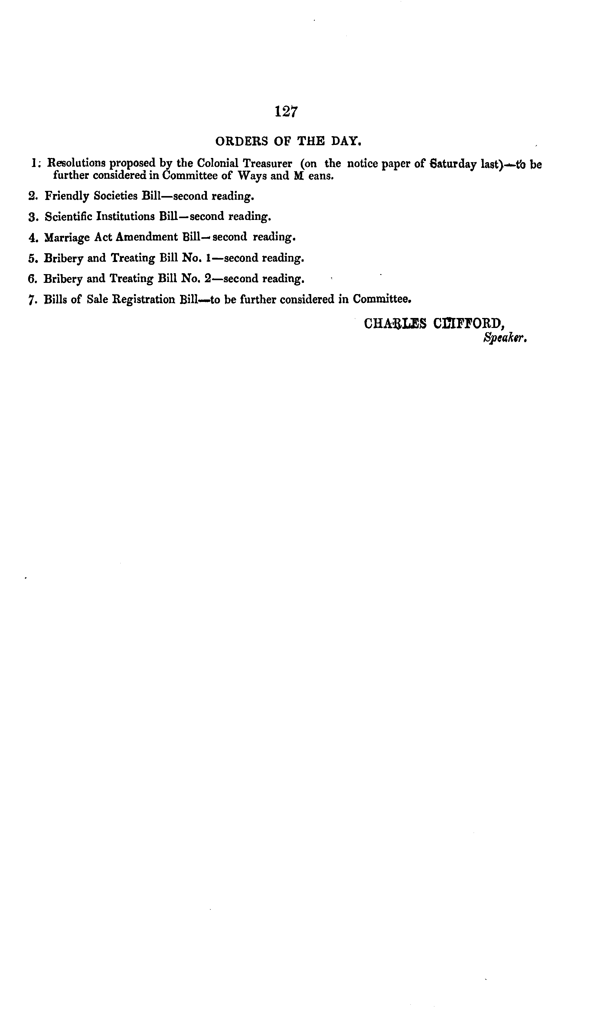 ORDERS OF THE DAY. ]. Resolutions proposed by the Colonial Treasurer (on the notice paper of Saturday last)—tb be further considered in Committee of Ways and M eans. 2. Friendly Societies Bill—second reading. 3. Scientific Institutions Bill—second reading. 4. Marriage Act Amendment Bill— second reading. 5. Bribery and Treating Bill No. I—second reading. 6. Bribery and Treating Bill No. 2—second reading. 7. Bills of Sale Registration Bill—to be further considered in Committee. CHARLES CEIFFORD, Speaker,