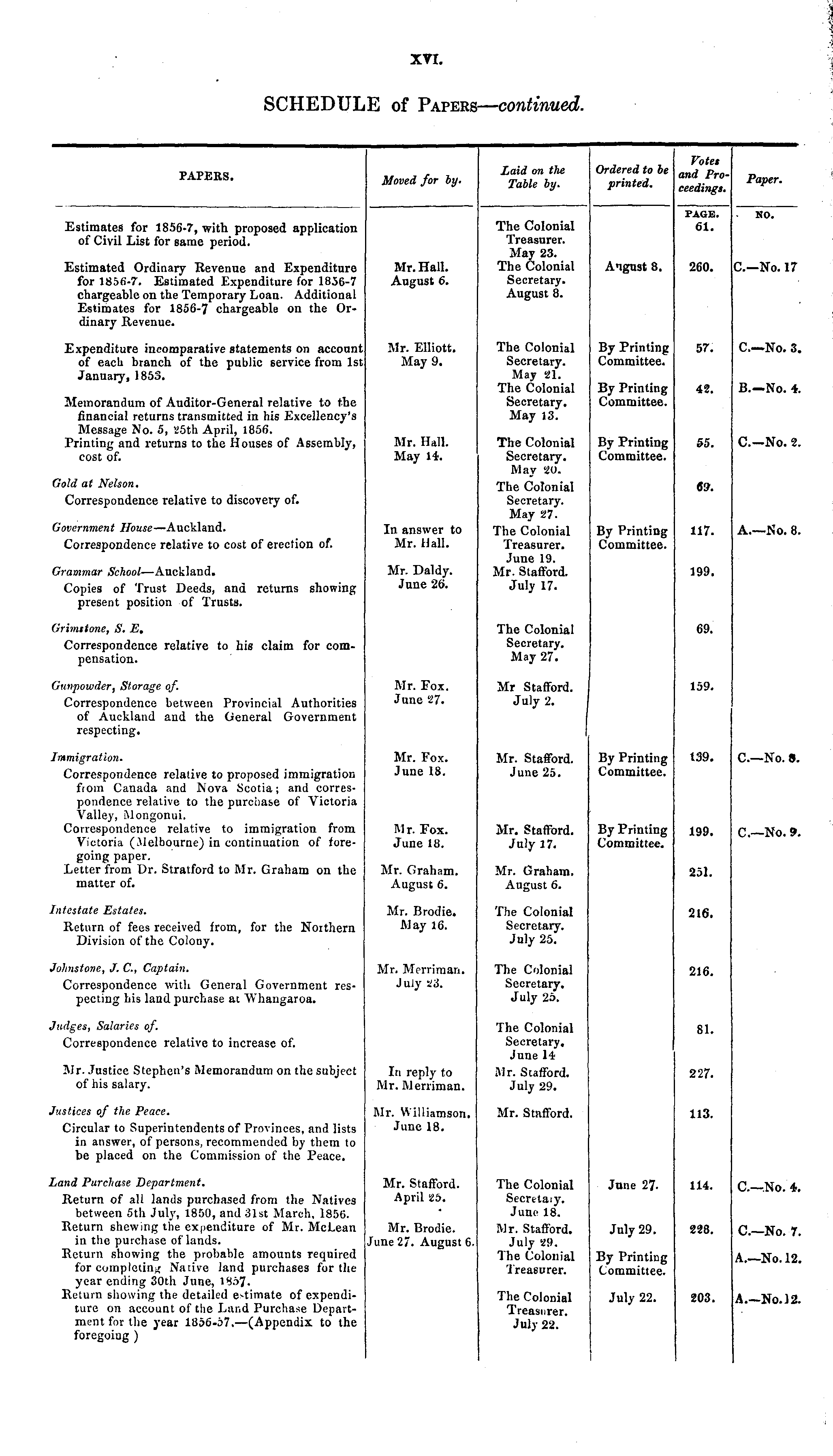 Votes PAPFRS *w if Laid on the Ordered to be and Pro- n PAI ERS - Moved for by. TaUe by _ printed _ Paper. PAGE. NO. Estimates for 1856-7, with proposed application The Colonial 61. of Civil List for same period. Treasurer. May 23. Estimated Ordinary Revenue and Expenditure Mr. Hall. The Colonial A'tgust 8. 260. C.—No. 17 for 1856-7. Estimated Expenditure for 1856-7 August 6. Secretary. chargeable on the Temporary Loan. Additional August 8. Estimates for 1856-7 chargeable on the Ordinary Revenue. Expenditure ineomparative statements on account Mr. Elliott. The Colonial By Printing 57. C.—No. 3. of each branch of the public service from 1st May 9. Secretary. Committee. January, 1855. May 21. The Colonial By Printing 42. B.—No. 4. Memorandum of Auditor-General relative to the Secretary. Committee. financial returns transmitted in his Excellency's May 13. Message No. 5, 25th April, 1856. Printing and returns to the Houses of Assembly, Mr. Hall. The Colonial By Printing 55. C.—No. 2. cost of. May 14. Secretary. Committee. May 20. Gold at Nelson. The Colonial 69. Correspondence relative to discovery of. Secretary. May 27. Government House—Auckland. In answer to The Colonial By Printing 117. A.—No. 8. Correspondence relative to cost of erection of. Mr. Hall. Treasurer. Committee. June 19. Grammar School—Auckland. Mr. Daldy. Mr. Stafford. 199. Copies of Trust Deeds, and returns showing June 26. July 17. present position of Trusts. Grimstone, S. 25, The Colonial 69. Correspondence relative to his claim for com- Secretary. pensation. May 27. Gunpowder, Storage of. Mr. Fox. Mr Stafford. 159. Correspondence between Provincial Authorities June 27. July 2. of Auckland and the General Government respecting. Immigration. Mr. Fox. Mr. Stafford. By Printing 139. C.—No. 8. Correspondence relative to proposed immigration June 18. June 25. Committee. from Canada and Nova Scotia; and correspondence relative to the purchase of Victoria Valley, Mongonui. Correspondence relative to immigration from Mr. Fox. Mr. Stafford. By Printing 199. q No. 9. Victoria (Melbourne) in continuation of fore- June 18. July 17. Committee. going paper. Letter from Dr. Stratford to Mr. Graham on the Mr. Graham. Mr. Graham. 251. matter of. August 6. August 6. Intestate Estates. Mr. Brodie. The Colonial 216. Return of fees received from, for the Northern May 16. Secretary. Division of the Colony. July 25. Johnstone, J. C., Captain. Mr. Merrimari, The Colonial 216. Correspondence with General Government res- July 23. Secretary. pecting his land purchase at "VYhangaroa. July 25. Judges, Salaries of. The Colonial 81. Correspondence relative to increase of. Secretary. June 14 Mr. Justice Stephen's Memorandum on the subject In reply to Mr. Stafford. 227. of his salary. Mr. Merriman. July 29. Justices of the Peace. Mr. Williamson. Mr. Stafford. 113. Circular to Superintendents of Provinces, and lists June 18. in answer, of persons, recommended by them to be placed on the Commission of the Peace. Land Purchase Department. Mr. Stafford. The Colonial June 27. 114. C.—No. 4. Return of all lands purchased from the Natives April 25. Secrtlaiy. between 5th July, 1850, and 31st March, 1856. " June 18. Return shewing the expenditure of Mr. McLean Mr. Brodie. Mr. Stafford. July 29. 228. C.—No. 7. in the purchase of lands. June 27. August 6. July 29. Return showing the probable amounts required The Colonial By Printing A. No. 12. for completing Native land purchases for the Treasurer. Committee. year ending 30th June, 1857. Return showing the detailed e-timate of expendi- The Colonial July 22. 203. A No. 12. ture on account of the Land Purchase Depart- Treasurer. ment for the year 1856-57.—(Appendix to the July 22. foregoing )