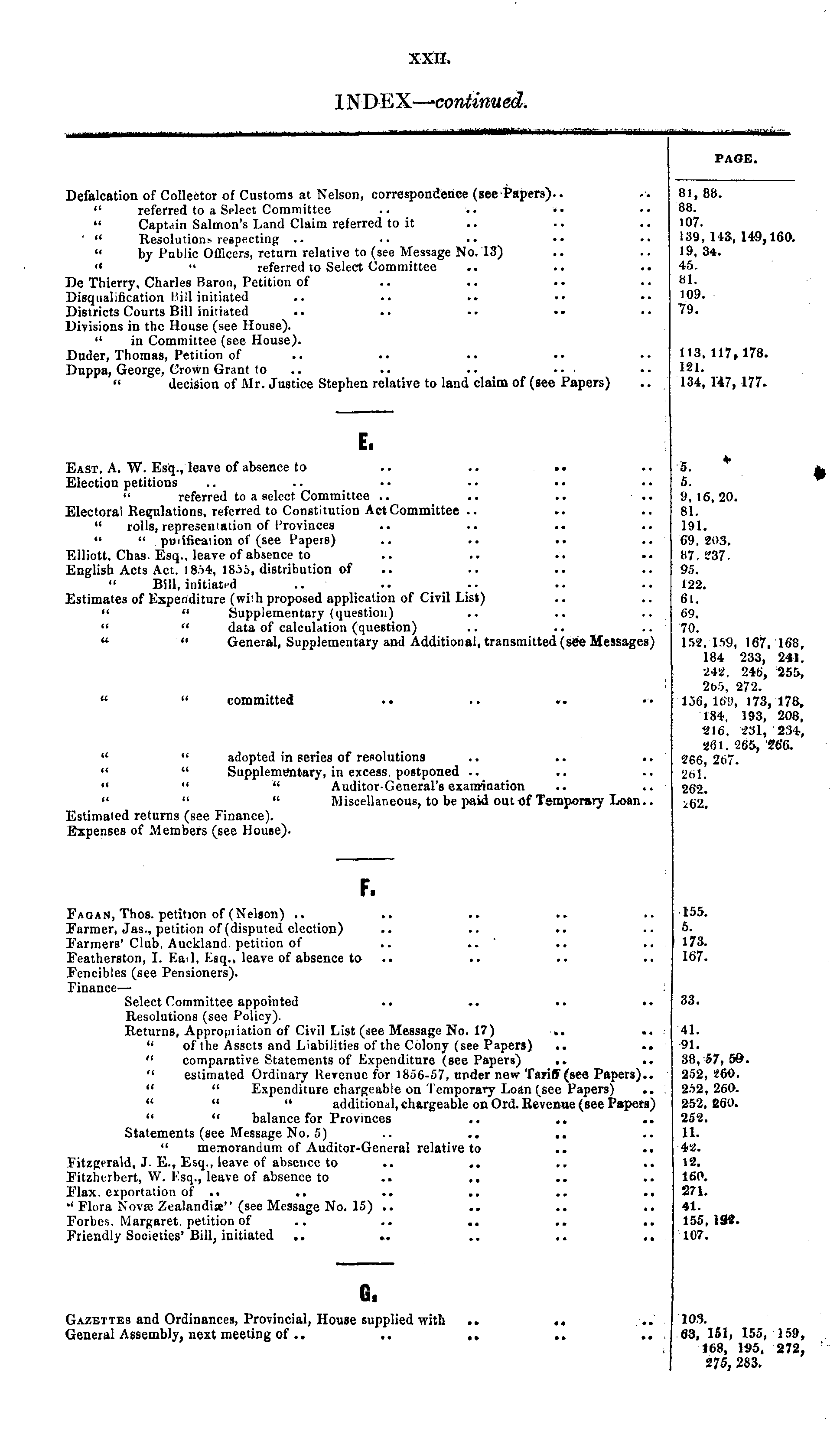 PAGE. Defalcation of Collector of Customs at Nelson, correspondence (see Papers).. .. 81, 88. " referred to a Select Committee .. •• •• •• 88. " Captain Salmon's Land Claim referred to it .. .. .. >07. ' " Resolutions respecting .. .. .. •• •• 139,143,149,160. " by Public Officers, return relative to (see Message No. 13) .. .. 19,34. •' •' referred to Select Committee .. .. ..45 De Thierry, Charles Baron, Petition of .. .. •. ..81. Disqualification Bill initiated .. .. .. •• •• >09. Districts Courts Bill initiated .. .. -. •• .. "9. Divisions in the House (see House). " in Committee (see House). Duder, Thomas, Petition of .. .. •• •• •• 113.117,178. Duppa, George, Crown Grant to .. .. .. •• • .. 121- " decision of Air. Justice Stephen relative to land claim of (see Papers) .. 134,147,177. E. 4. East. A. W. Esq., leave of absence to .. .. .. ..5. £ Election petitions .. .. •• •• •• ..5. " referred to a select Committee .. .. .. .. 9,16,20. Electoral Regulations, referred to Constitution Act Committee .. .. .. 81. " rolls, representation of Provinces .. .. .. .. 191. " " purification of (see Papers) .. .. .. .. '69, 203. Elliott, Chas. Esq., leave of absence to .. .. .. .. 87. 237. English Acts Act. 1854, 1855, distribution of .. .. .. .. 95. " Bill, initiated .. .. .. .. .. 122. Estimates of Expenditure (with proposed application of Civil List) .. .. 61. " " Supplementary (question) .. .. .. 69. " " data of calculation (question) .. .. 70. " " General, Supplementary and Additional, transmitted (see Messages) 152,159, 167, 168, 184 233, 241. 242, 24b', 255, 265, 272. " " committed .. .. .. •• 156,16!), 173, 178, 184, 193, 208, 216. 231, 234, 261. 265, 266. " " adopted in series of resolutions .. .. .. 266,267. " " Supplementary, in excess, postponed .. .. .. 261. " " " Auditor-General's examination .. .. 262. " " " Miscellaneous, to be paid out of Temporary Loan.. Estimated returns (see Finance). Expenses of Members (see House). F. Facan, Thos. petition of (Nelson) .. .. .. .. .. 155. Earmer, Jas., petition of (disputed election) .. .. .. .. 5. Farmers' Club. Auckland, petition of .. .. ' .. .. 173Eeatherston, I. Eail, Esq., leave of absence to .. .. .. .. 167. Fencibles (see Pensioners). Finance— Select Committee appointed .. .. .. .. 33. Resolutions (see Policy). Returns, Appropriation of Civil List (see Message No. 17) .. .. 41. " of the Assets and Liabilities of the Colony (see Papers) .. .. 91. " comparative Statements of Expenditure (see Papers) .. .. 38, 57, 59. " estimated Ordinary Revenue for 1856-57, under new Tariff (see Papers).. 252, 260. " " Expenditure chargeable on Temporary Loan (see Papers) .. 252,260. " " " additional, chargeable on Ord. Revenue (see Papers) 252, 260. " " balance for Provinces .. .. .. 252. Statements (see Message No. 5) .. .. .. .. 11. " memorandum of Auditor-General relative to .. .. 42. Fitzgerald, J. E., Esq., leave of absence to .. .. .. .. 12. Fitzherbert, W. Ksq., leave of absence to .. .. .. ..160. Flax, exportation of .. .. .. .. .. .. 271. •' Flora Nova; Zealandise" (see Message No. 15) .. .. .. .. 41. Forbes, Margaret, petition of .. .. .. .. .. 155,192. Friendly Societies' Bill, initiated .. .. .. .. .. 107. G. Gazettes and Ordinances, Provincial, House supplied with .. .. .. 103. General Assembly, next meeting of .. .. .. .. .. 63, 151, 155, 159, 168, 195, 272, 275, 283.