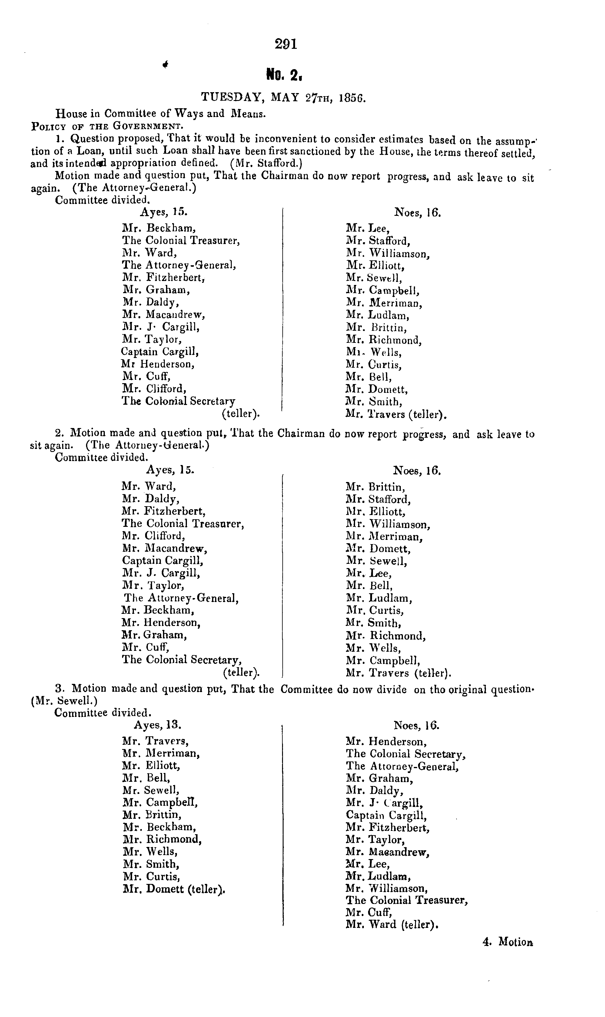 No. 2, TUESDAY, MAY 27th, 1856. House in Committee of Ways and Means. Policy of the Government. 1. Question proposed, That it would be inconvenient to consider estimates based on the assump-' tion of a Loan, until such Loan shall have been first sanctioned by the House, the terms thereof settled and itsintendtd appropriation defined. (Mr. Stafford.) Motion made and question put, That the Chairman do now report progress, and ask leave to sit again. (The Attorney-General.) Committee divided. Ayes, lf». Noes, 16. Mr. Beckham, Mr. Lee, The Colonial Treasurer, Mr. Stafford, Mr. Ward, Mr. Williamson, The Attorney-General, Mr. Elliott, Mr. Fitzherbert, Mr. Sewell, Mr. Graham, Mr. Campbell, Mr. Daldy, Mr. Merriman, Mr. Macandrew, Mr. Ludlam, Mr. J- Cargill, i Mr. Brittin, Mr. Taylor, ; Mr. Richmond, Captain Cargill, Ml- Wells, Mr Henderson, Mr. Curtis, Mr. Cuff, Mr. Bell, Mr. Clifford, Mr. Domett, The Colonial Secretary j Mr. Smith, (teller). Mr, Travers (teller). 2. Motion made anJ question pul, That the Chairman do now report progress, and ask leave to sit again. (The Attorney-General.) Committee divided. Ayes, 15. Noes, 16. Mr. Ward, Mr. Brittin, Mr. Daldy, Mr. Stafford, Mr. Fitzherbert, Mr, Elliott, The Colonial Treasurer, Mr. Williamson, Mr. Clifford, Mr. Merriman, Mr. Macandrew, Mr. Domett, Captain Cargill, Mr. Sewell, Mr. J. Cargill, Mr. Lee, Mr. Taylor, Mr. Bell, The Attorney-General, Mr. Ludlam, Mr. Beckham, Mr, Curtis, Mr. Henderson, Mr. Smith, Mr. Graham, Mr. Richmond, Mr. Cuff, Mr. Wells, The Colonial Secretary, Mr. Campbell, (teller). Mr. Travers (teller). 3. Motion made and question put, That the Committee do now divide on tho original question(Mr. Sewell.) Committee divided. Ayes, 13. Noes, 16. Mr. Travers, Mr. Henderson, Mr. Merriman, The Colonial Secretary, Mr. Elliott, The Attorney-General, Mr. Bell, Mr. Graham, Mr. Sewell, Mr. Daldy, Mr. Campbell, Mr. J- Cargill, Mr. Brittin, Captain Cargill, Mr. Beckham, Mr. Fitzherbert, Sir. Richmond, Mr. Taylor, Mr. Wells, Mr. Maeandrew, Mr. Smith, Mr. Lee, Mr. Curtis, Mr. Ludlam, Mr. Domett (teller). Mr. Williamson, The Colonial Treasurer, Mr. Cuff, Mr. Ward (teller). 4. Motion