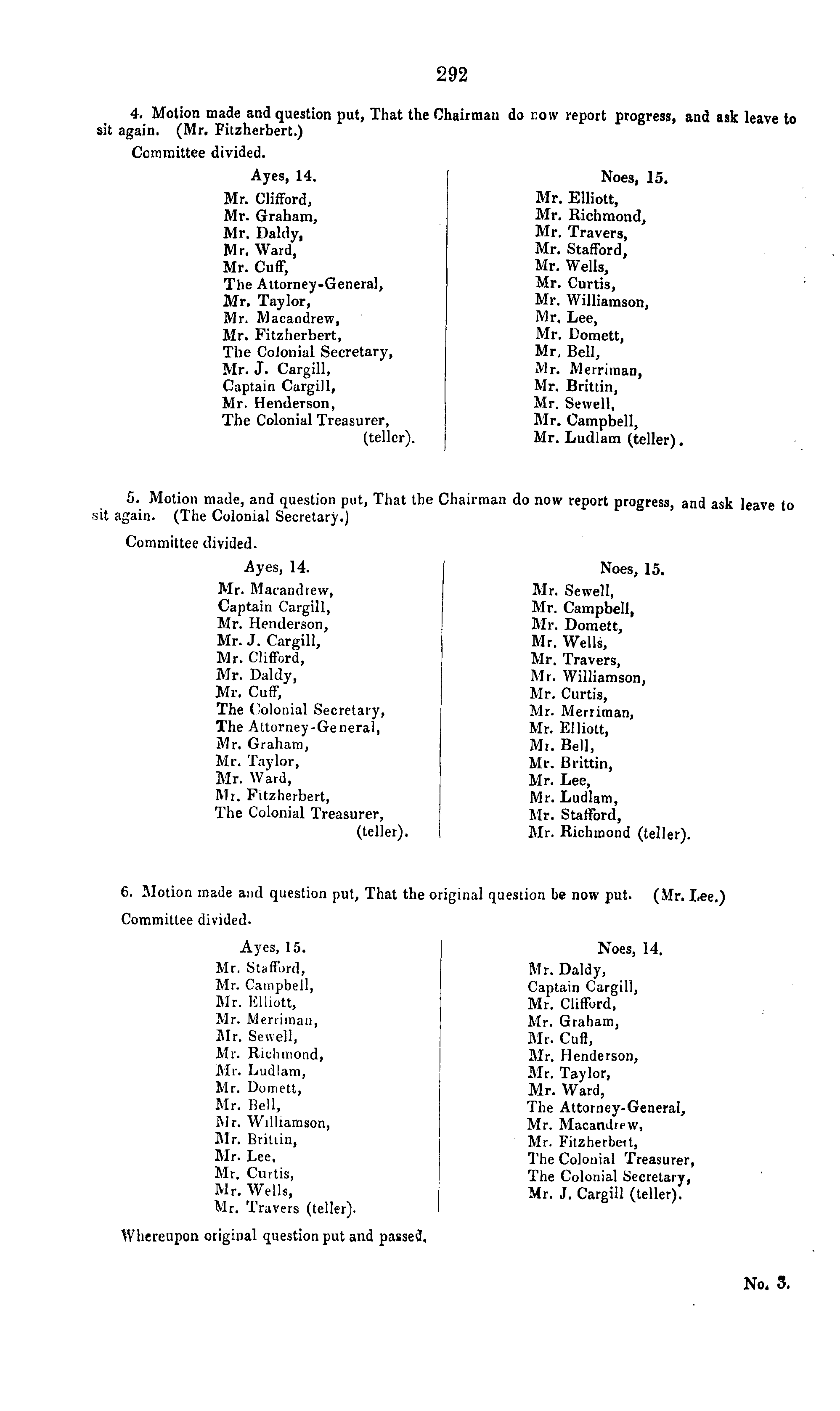 4. Motion made and question put, That the Chairman do r,oiv report progress, and ask leave to sit again. (Mr. Fitzherbert.) Committee divided. Ayes, 14. Noes, 15. Mr. Clifford, Mr. Elliott, Mr. Graham, Mr. Richmond, Mr. Daldy, Mr, Travers, Mr. Ward, Mr. Stafford, Mr. Cuff, Mr. Wells, The Attorney-General, Mr. Curtis, Mr. Taylor, Mr. Williamson, Mr. Macandrew, Mr. Lee, Mr. Fitzherbert, Mr. Domett, The Colonial Secretary, Mr. Bell, Mr. J. Cargill, Mr. Merriman, Captain Cargill, Mr. Brittin, Mr. Henderson, Mr. Sewell, The Colonial Treasurer, Mr. Campbell, (teller). Mr. Ludlam (teller) . 5. Motion made, and question put, That the Chairman do now report progress, and ask leave to sit again. (The Colonial Secretary.) Committee divided. Ayes, 14. Noes, 15. Mr. Macandrew, Mr. Sewell, Captain Cargill, Mr. Campbell, Mr. Henderson, Mr. Domett, Mr. J. Cargill, Mr. Wells, Mr. Clifford, Mr. Travers, Mr. Daldy, Mr. Williamson, Mr. Cuff, Mr. Curtis, The Colonial Secretary, Mr. Merriman, The Attorney-General, Mr. Ellliott, Mr. Graham, Mi. Bell, Mr. Taylor, Mr. Brittin, Mr. Ward, Mr. Lee, Mr. Fitzherbert, Mr. Ludlam, The Colonial Treasurer, Mr. Stafford, (teller). Mr. Richmond (teller). 6. Motion made and question put, That the original question be now put. (Mr. Lee.) Committee divided. Ayes, 15. Noes, 14. Mr. Stafford, Mr. Daldy, Mr. Campbell, Captain Cargill, Mr. Elliott, Mr. Clifford, Mr. Merriman, Mr. Graham, Mr. Sewell, Mr. Cuff, Mr. Richmond, Mr. Henderson, Mr. Ludlam, Mr. Taylor, Mr. Domett, Mr. Ward, Mr. Bell, The Attorney-General, Mr. Williamson, Mr. Macandrew, Mr. Brittin, Mr. Fitzherbeit, Mr. Lee, The Colonial Treasurer, Mr. Curtis, | The Colonial Secretary, Mr. Wells, Mr. J. Cargill (teller). Mr. Travers (teller). I Whereupon original question put and passed. No. 3.