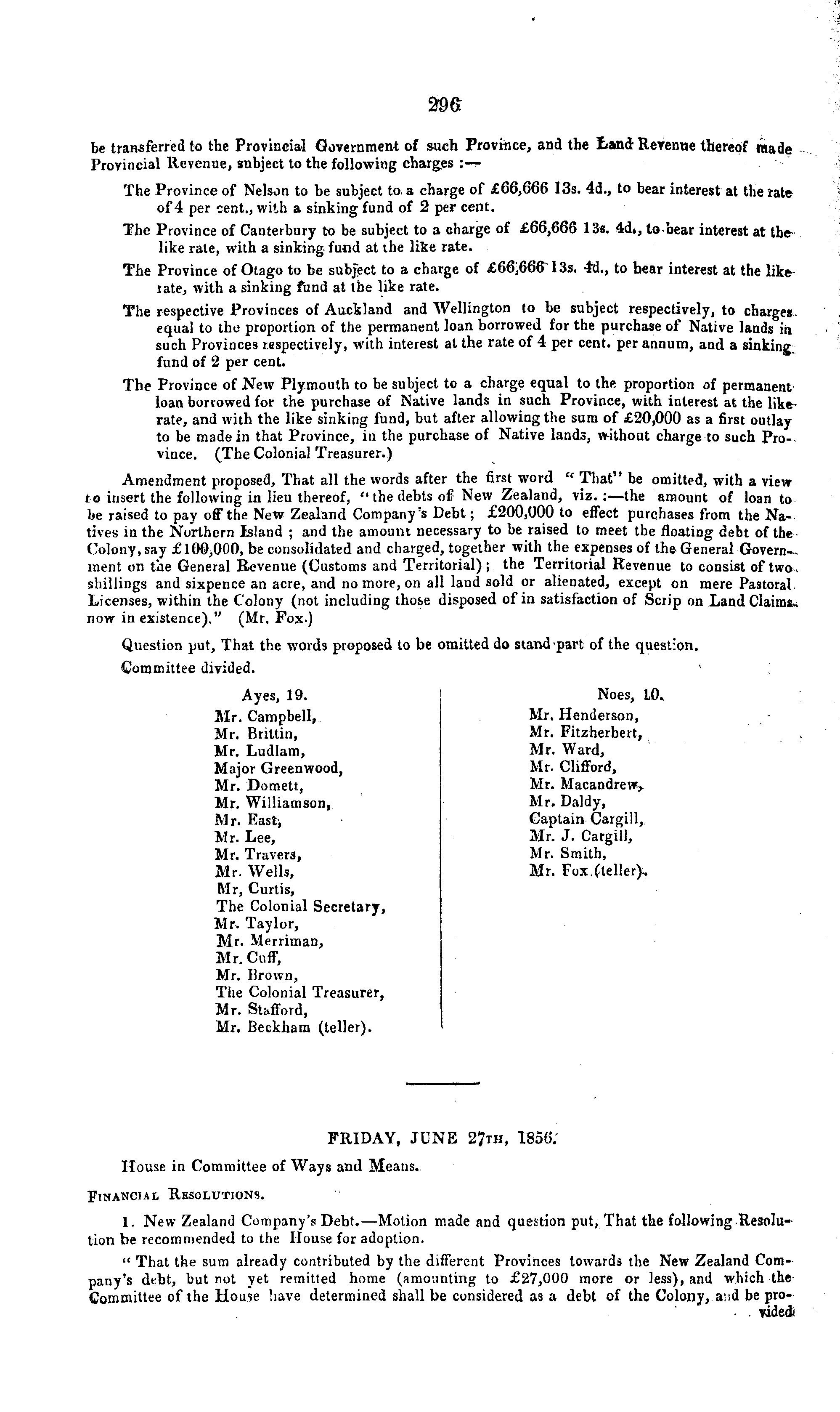 be transferred to the Provincial Government of such Province, and the Land Revenue thereof raade Provincial Revenue, subject to the following charges : — The Province of Nelson to be subject to a charge of £66,666 13s. 4d., to bear interest at the rate of 4 per cent., with a sinking fund of 2 per cent. The Province of Canterbury to be subject to a charge of £66,666 13s. 4d., to bear interest at the like rate, with a sinking fund at the like rate. The Province of Otago to be subject to a charge of £66,666 13s. 4d., to bear interest at the like rate, with a sinking fund at the like rate. The respective Provinces of Auckland and Wellington to be subject respectively, to charges equal to the proportion of the permanent loan borrowed for the purchase of Native lands in such Provinces respectively, with interest at the rate of 4 per cent, per annum, and a sinking fund of 2 per cent. The Province of New Plymouth to be subject to a charge equal to the proportion of permanent loan borrowed for the purchase of Native lands in such Province, with interest at the like rate, and with the like sinking fund, but after allowing the sura of £20,000 as a first outlay to be made in that Province, in the purchase of Native lands, without charge to such Province. (The Colonial Treasurer.) Amendment proposed, That all the words after the first word " That" be omitted, with a view to insert the following in lieu thereof, " the debts of New Zealand, viz.;—the amount of loan to be raised to pay off the New Zealand Company's Debt; £200,000 to effect purchases from the Natives in the Northern Island ; and the amount necessary to be raised to meet the floating debt of the Colony,say £100,000, be consolidated and charged, together with the expenses of the General Government on the General Revenue (Customs and Territorial) ; the Territorial Revenue to consist of two shillings and sixpence an acre, and no more, on all land sold or alienated, except on mere Pastoral Licenses, within the Colony (not including those disposed of in satisfaction of Scrip on Land Claims now in existence)," (Mr. Fox.) Question put, That the words proposed to be omitted do stand part of the question. Committee divided. Ayes, 19. Noes, 10* Mr. Campbell, Mr. Henderson, Mr. Brittin, Mr. Fitzherbert, Mr. Ludlam, Mr. Ward, Major Greenwood, Mr. Clifford, Mr. Domett, Mr. Macandrewy Mr. Williamson, Mr. Daldy, Mr. East-, Captain Cargill, Mr. Lee, Mr. J. Cargill, Mr. Traver3, Mr. Smith, Mr. Wells, Mr. Fox.(teller). Mr, Curtis, The Colonial Secretary, Mr. Taylor, Mr. Merriman, Mr. Cuff, Mr. Brown, The Colonial Treasurer, Mr. Stafford, Mr. Beckham (teller). FRIDAY, JUNE 27th, 1856; Ilouse in Committee of Ways and Means. Financial Resolutions. 1. New Zealand Company's Debt.—Motion made and question put, That the following Resolution be recommended to the House for adoption. " That the sum already contributed by the different Provinces towards the New Zealand Company's debt, but not yet remitted home (amounting to £27,000 more or less), and which the Committee of the House have determined shall be considered as a debt of the Colony, and be pro- . videdi
