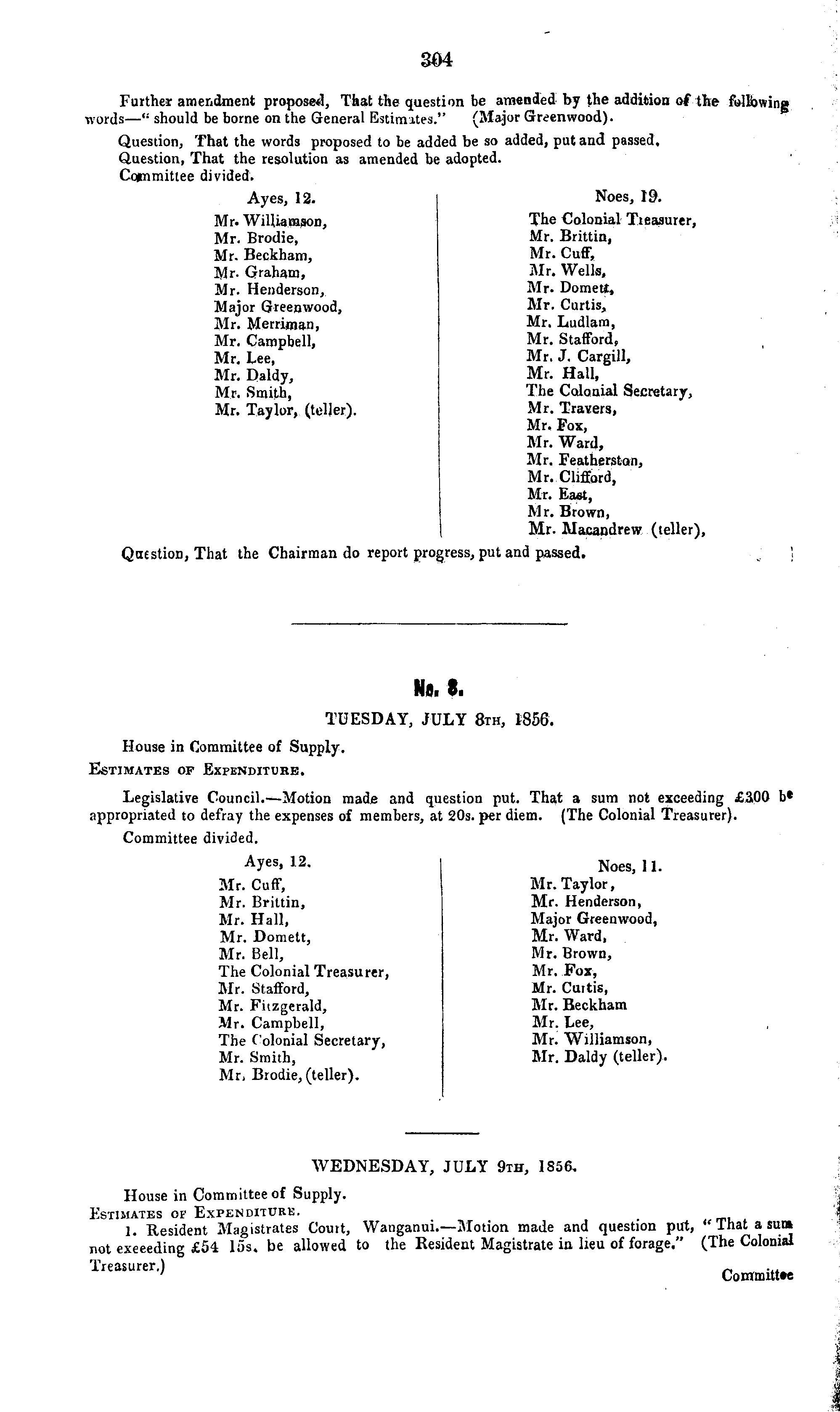 No. 8. TUESDAY, JULY Bth, 1856. House in Committee of Supply. Estimates of Expenditure. Legislative Council.—Motion made and question put. That a sum not exceeding £300 b e appropriated to defray the expenses of members, at 20s. per diem. (The Colonial Treasurer). Committee divided. A y es . 12 - Noes, 11. Mr. Cuff, Mr. Taylor, Mr. Brittin, Mr. Henderson, Mr. Hall, Major Greenwood, Mr. Domett, Mr. Ward, Mr. Bell, Mr. Brown, The Colonial Treasurer, Mr. Fox, Mr. Stafford, Mr. Cuitis, Mr. Fitzgerald, Mr. Beckham Mr. Campbell, Mr. Lee, The Colonial Secretary, Mr. Williamson, Mr. Smith, Mr. Daldy (teller). Mr, Brodie, (teller). WEDNESDAY, JULY 9th, 1556. House in Committee of Supply. Estimates of Expenditure. 1. Resident Magistrates Court, Wanganui.—Motion made and question put, " That a sum not exceeding £54 15s. be allowed to the Resident Magistrate in lieu of forage." (The Colonial Treasurer.) ' Committee