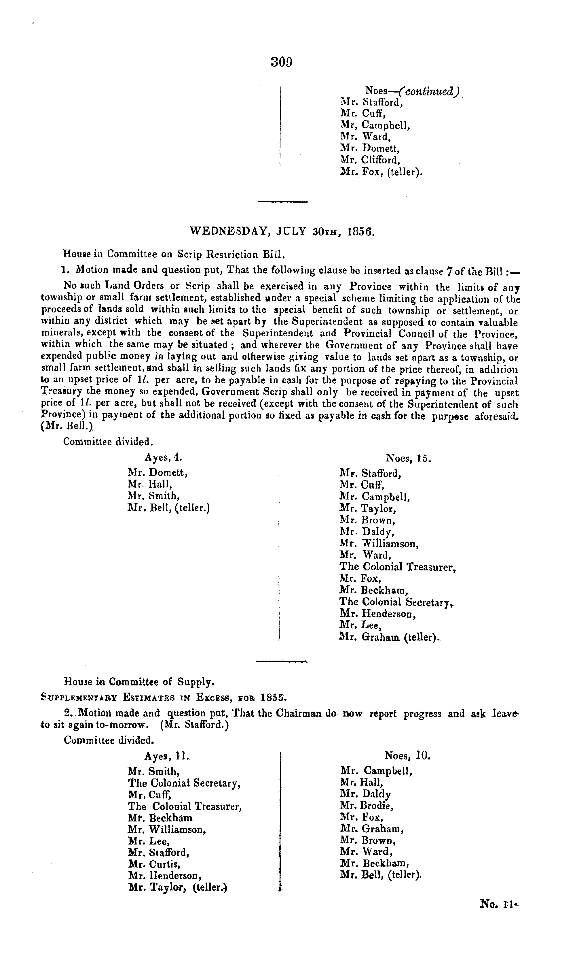 Noes—Ccontinued) Mr. Stafford, j Mr. Cuff, Mr, Campbell, Mr. Ward, Mr. Domett, Mr. Clifford, Mr. Fox, (teller). WEDNESDAY, JULY 30th, 1856. House in Committee on Scrip Restriction Bill. 1. Motion made and question put, That the following clause be inserted as clause 7of the Bill: No luch Land Orders or Scrip shall be exercised in any Province within the limits of any township or small farm set'.lement, established under a special scheme limiting tbe application of the proceeds of lands sold within such limits to the special benefit of such township or settlement, or within any district which may be set apart by the Superintendent as supposed to contain valuable minerals, except with the consent of the Superintendent and Provincial Council of the Province, within which the same may be situated ; and wherever the Government of any Province shall have expended public money in laying out and otherwise giving value to lands set apart as a township, or small farm settlement, and shall in selling such lands fix any portion of the price thereof, in addition to an upset price of 11, per acre, to be payable in cash for the purpose of repaying to the Provincial Treasury the money so expended, Government Scrip shall only be received in payment of the upset price of 1/. per acre, but shall not be received (except with the consent of the Superintendent of such Province) in payment of the additional portion so fixed as payable in cash for the purpese aforesaid. (Mr. Bell.) Committee divided. Ayes, 4. Noes, 15. Mr. Domett, Mr. Stafford, Mr. Hall, Mr. Cuff, Mr. Smith, Mr. Campbell, Mr. Bell, (teller.) Mr. Taylor, Mr. Brown, Mr. Daldy, Mr. Williamson, Mr. Ward, The Colonial Treasurer, Mr. Fox, Mr. Beckham, The Colonial Secretary* Mr. Henderson, Mr. Lee, Mr. Graham (teller). House in Committee of Supply. Supplementary Estimates in Excess, for 1855. 2. Motion made and question put, That the Chairman do now report progress and ask leave to sit again to-morrow. (Mr. Stafford.) Committee divided. Ayes, 11. Noes, 10. Mr. Smith, Mr. Campbell, The Colonial Secretary, Mr. Hall, Mr. Cuff, Mr. Daldy The Colonial Treasurer, Mr. Brodie, Mr. Beckham Mr. Fox, Mr. Williamson, Mr. Graham, Mr. Lee, Mr. Brown, Mr. Stafford, Mr. Ward, Mr. Curtis, Mr. Beckham, Mr. Henderson, Mr. Bell, (teller)^ Mr. Taylor, (teller.) No. 11-