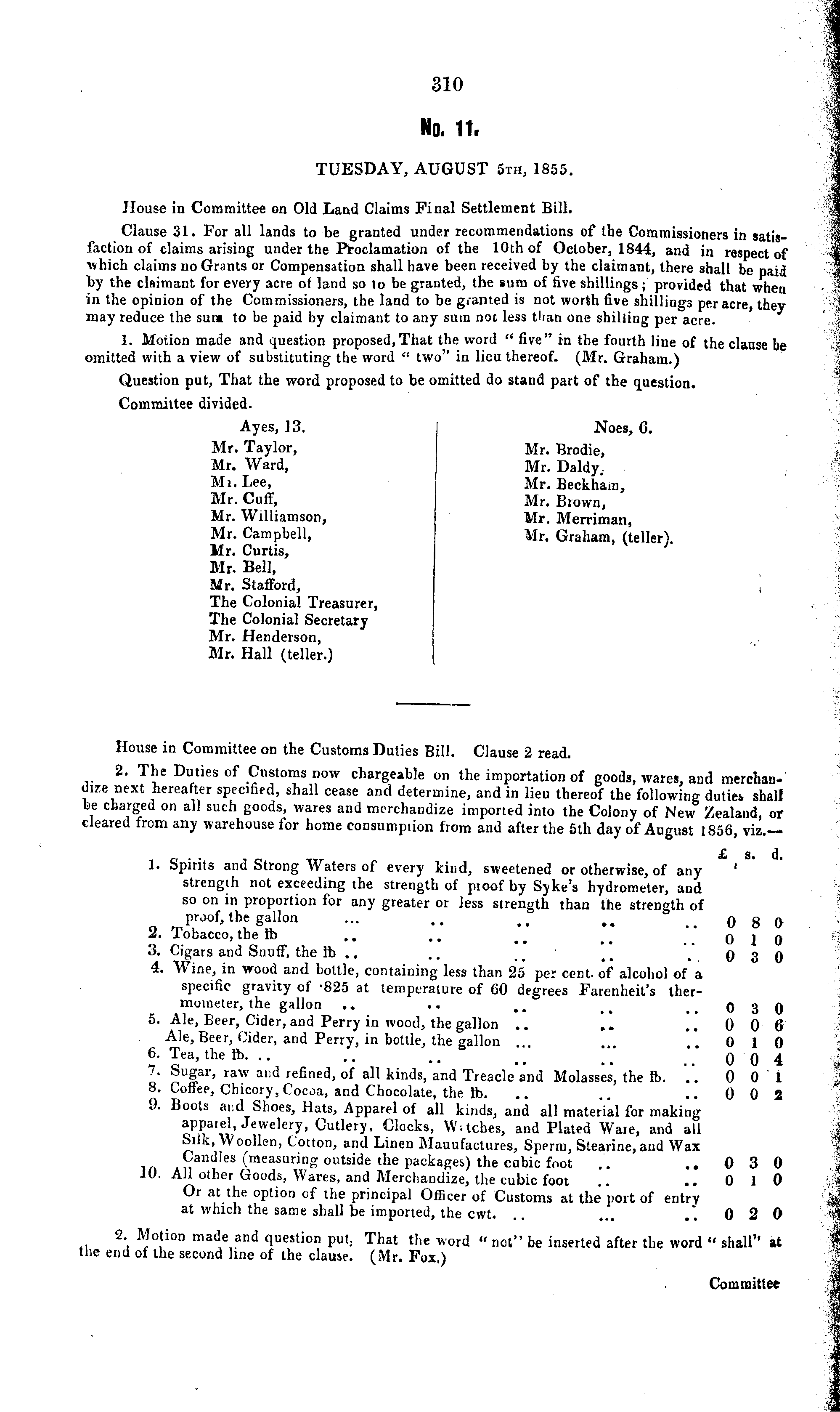 TUESDAY, AUGUST sth, 1855. House in Committee on Old Land Claims Pinal Settlement Bill. Clause 31. For all lands to be granted under recommendations of the Commissioners in satisfaction of claims arising under the Proclamation of the 10th of October, 1844, and in respect of ■which claims no Grants or Compensation shall have been received by the claimant, there shall be paid by the claimant for every acre of land so to be granted, the sum of five shillings ; provided that when in the opinion of the Commissioners, the land to be granted is not worth five shillings per acre, they may reduce the sunt to be paid by claimant to any sum not less tlian one shilling per acre. 1. Motion made and question proposed, That the word " five" in the fourth line of the clause be omitted with a view of substituting the word " two" in lieu thereof. (Mr. Graham.) Question put, That the word proposed to be omitted do stand part of the question. Committee divided. Ayes, 13. Noes, 6. Mr. Taylor, Mr. Brodie, Mr. Ward, Mr. Daldy,. Mi. Lee, Mr. Beckham, Mr. Cuff, Mr. Btown, Mr. Williamson, Mr. Merriman, Mr. Campbell, Mr. Graham, (teller). Mr. Curtis, 1 Mr. Bell, Mr. Stafford, The Colonial Treasurer, The Colonial Secretary Mr. Henderson, Mr. Hall (teller.) House in Committee on the Customs Duties Bill. Clause 2 read. 2. The Duties of Customs now chargeable on the importation of goods, wares, and merchandize next hereafter specified, shall cease and determine, and in lieu thereof the following duties, shall be charged on all such goods, wares and merchandize imported into the Colony of New Zealand, or cleared from any warehouse for home consumption from and after the sth day of August 1856, viz.— C * * J Ci ITT S * 1. opirits and Strong >v aters of every kind, sweetened or otherwise, of any strength not exceeding the strength of pioof by Syke's hydrometer, and so on in proportion for any greater or less strength than the strength of proof, the gallon ... .. .. .. ..080 2. Tobacco, the tb .. .. ..010 3. Cigars and Snuff, the lb.. .. .. # # , 030 4. AY ine, in wood and bottle, containing less than 25 per cent, of alcohol of a specific gravity of *825 at temperature of 60 degrees Farenheit's thermometer, the gallon .. .. .. _ ..030 5. Ale, Beer, Cider, and Perry in wood, the gallon .. .. ..006 Ale, Beer, Cider, and Perry, in bottle, the gallon .. .010 6. Tea, the lb. .. .. .. _ *004 Sugtti, raw and refined, of all kinds, and Treacle and Molasses, the lb. .. 0 0 1 8. Coffee, Chicory, Cocoa, and Chocolate, the lb. .. .. .. 0 0 2 J. Boots and Shoes, Hats, Apparel of all kinds, and all material for making appaiel, Jewelery, Cutlery. Clocks, Witches, and Plated Waie, and all Silk, \\ oollen, Cotton, and Linen Mauufactures, Sperm, Stearine, and Wax Candles (measuring outside the packages) the cubic foot .. .. 0 3 0 10. All other Goods, Wares, and Merchandize, the cubic foot .. .. 0 1 0 Or at the option cf the principal Officer of Customs at the port of entry at which the same shall be imported, the cwt. .. ... 0 2 0 made and question put ; That the word " not" be inserted after the word " shall'' at the end of the second line of the clause. (Mr. Fox.) Committee