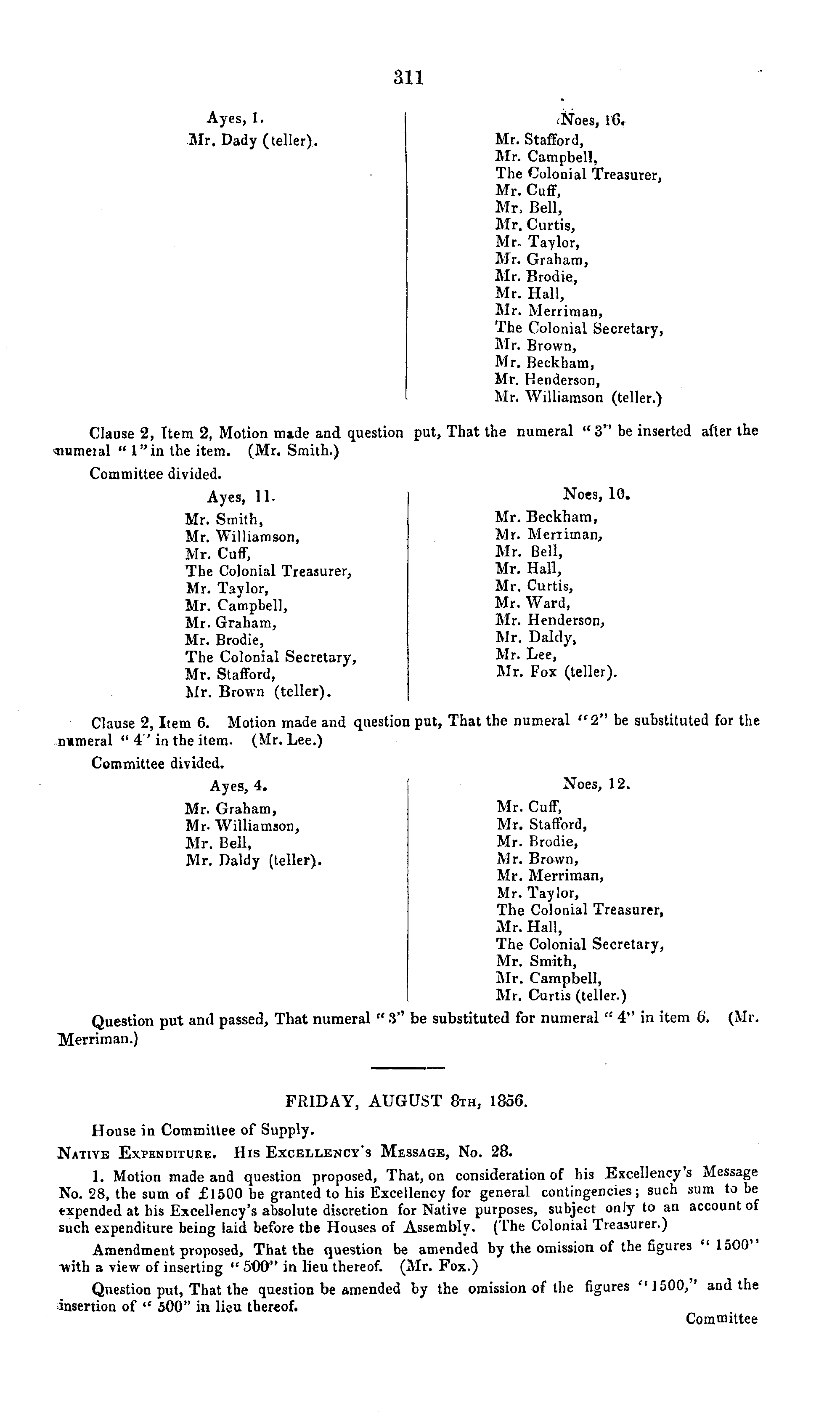 Ayes, 1. Noes, 16. Mr. Dady (teller). Mr. Stafford, Mr. Campbell, The Colonial Treasurer, Mr. Cuff, Mr, Bell, Mr, Curtis, Mr. Taylor, Mr. Graham, Mr. Brodie, Mr. Hall, Mr. Merriman, The Colonial Secretary, Mr. Brown, Mr. Beckham, Mr. H enderson, Mr. Williamson (teller.) Clause 2, Item 2, Motion made and question put. That the numeral "3" he inserted after the ■numeral " l"in the item. (Mr. Smith.) Committee divided. Ayes, 11. Noes, 10. Mr. Smith, Mr. Beckham, Mr. Williamson, Mr. Meriiman, Mr. Cuff, Mr. Bell, The Colonial Treasurer, Mr. Hall, Mr. Taylor, Mr. Curtis, Mr. Campbell, Mr. Ward, Mr. Graham, Mr. Henderson, Mr. Brodie, Mr. Daldy, The Colonial Secretary, Mr. Lee, Mr. Stafford, Mr. Fox (teller). Mr. Brown (teller). Clause 2, Item 6. Motion made and question put, That the numeral "2" be substituted for the numeral " 4 'in the item. (Mr. Lee.) Committee divided. Ayes, 4. Noes, 12. Mr. Graham, Mr. Cuff, Mr- Williamson, Mr. Stafford, Mr. Bell, Mr. Brodie, Mr. Daldy (teller). Mr. Brown, Mr. Merriman, Mr. Taylor, The Colonial Treasurer, Mr. Hall, The Colonial Secretary, Mr. Smith, Mr. Campbell, Mr. Curtis (teller.) Question put and passed, That numeral "3" be substituted for numeral "4" in item 6. (Mr. Merriman.) FRIDAY, AUGUST Bth, 1856. House in Committee of Supply. Native Expenditure. His Excellency's Message, No. 28. 1. Motion made and question proposed, That, on consideration of his Excellency s Message No. 28, the sum of £1500 be granted to his Excellency for general contingencies; such sum to be expended at his Excellency's absolute discretion for Native purposes, subject only to an account of such expenditure being laid before the Houses of Assembly, (The Colonial Treasurer.) Amendment proposed, That the question be amended by the omission of the figures " 1500 -with a view of inserting " 500" in lieu thereof. (Mr. Fox.) Question put, That the question be amended by the omission of the figures c, 1500,' and the insertion of " 500" in lieu thereof. Committee