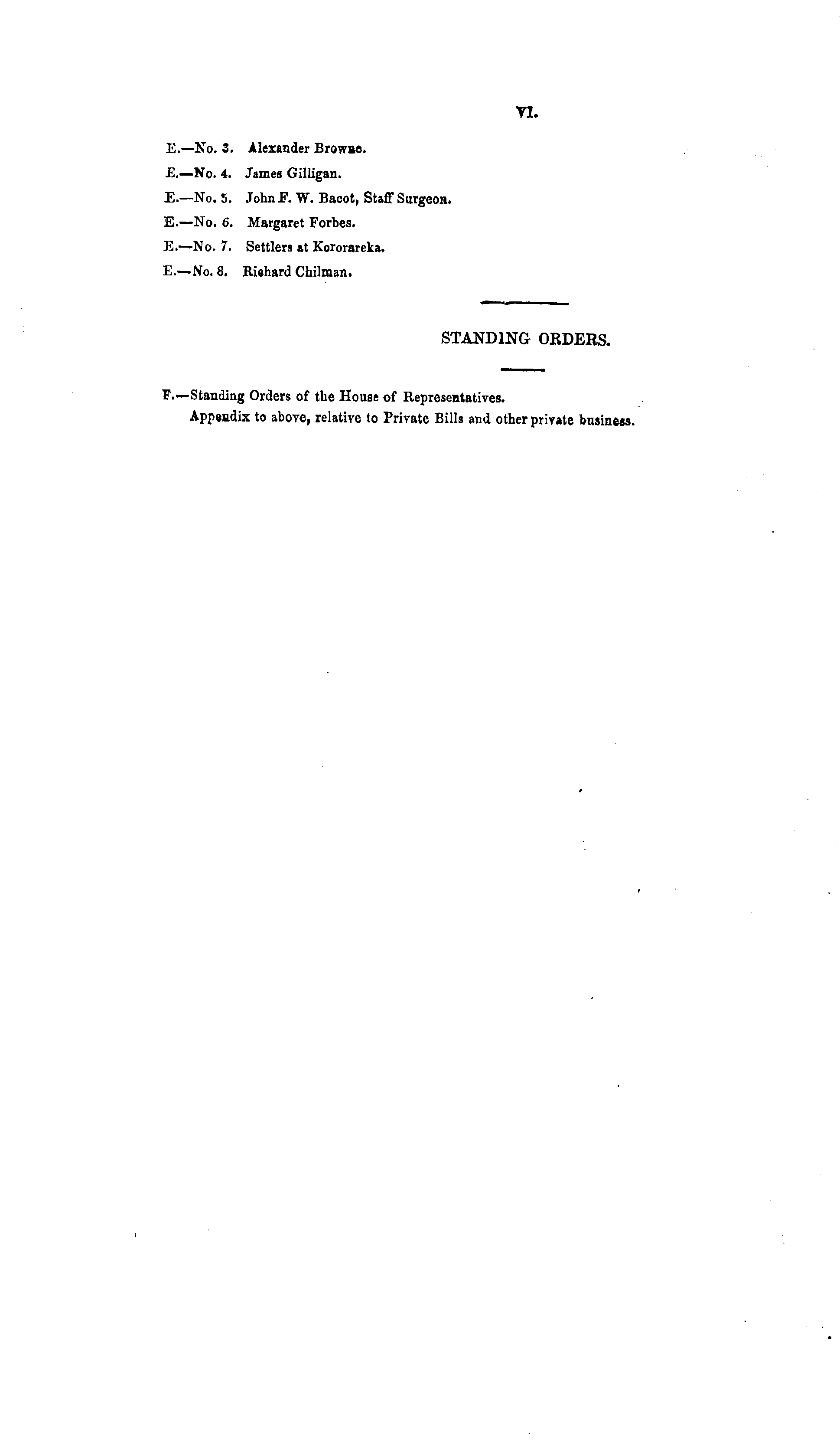 E.—No. S. Alexander Browne, E.—No. 4. James Gilligan. E.—No. 5. John E. W. Bacot, Staff Surgeon. E.—No. 6. Margaret Forbes. E.—No. 7. Settlers at Kororareka. E.— No. 8. Riehard Chilman. STANDING ORDERS. F.—Standing Orders of the House of Representatives. Appendix to above, relative to Private Bills and other private business.