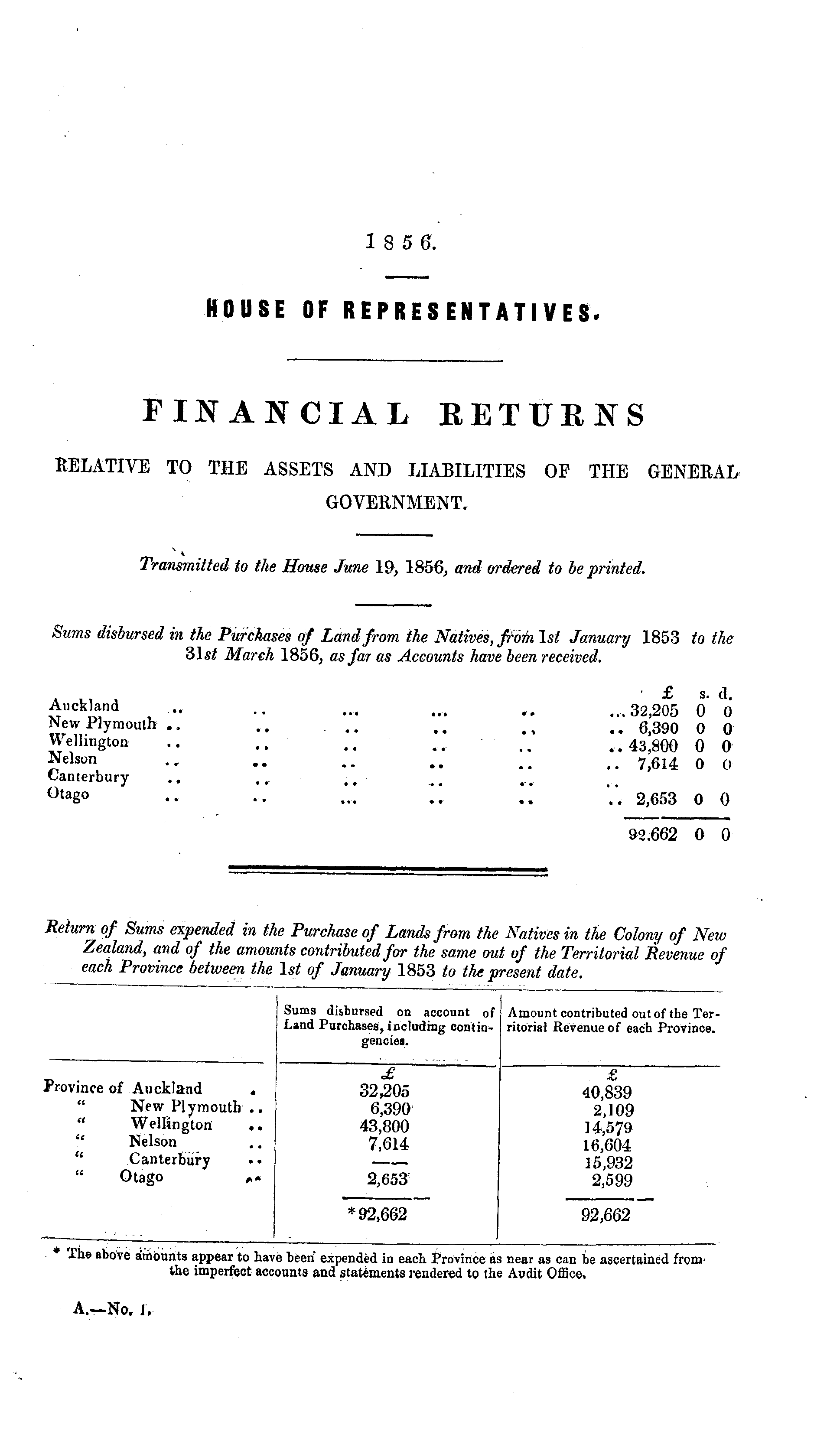 Sums disbursed in the Purchases of Land from the Natives, from Is/ January 1853 to the 31s£ March 1856, as far as Accounts have been received. Auckland .... .. ... ... ... 32,205 0 O New Plymouth .. .. .. .. 6,390 0 0 Wellington .. .. .. .. .. ..43,800 0 0 ff elson , •• •• .. .. .. .. 7,614 0 0 Canterbury ° ta § o •• - ... .. .. '.. 2,653 0 0 92.662 0 0